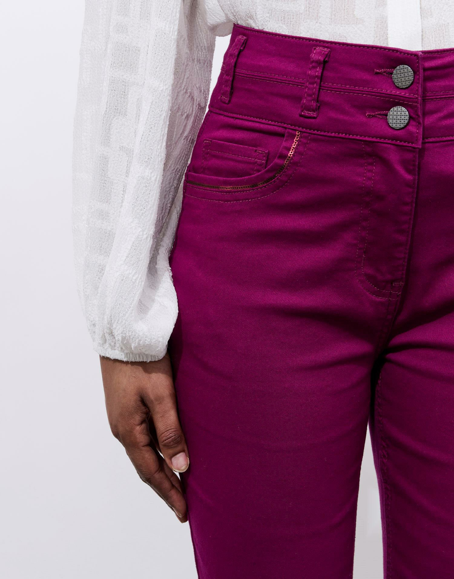 Confectionné dans une coupe ajustée, ce pantalon met en valeur vos jambes tout en offrant une allure contemporaine et féminine. Sa teinte aubergine profonde s’adapte facilement à toutes vos tenues, du bureau à une soirée décontractée. Le détail sequins sur les poches apporte une touche d’éclat discrète, qui fait toute la différence.