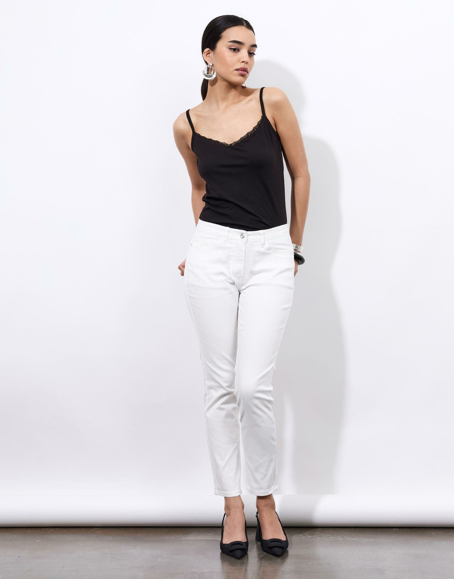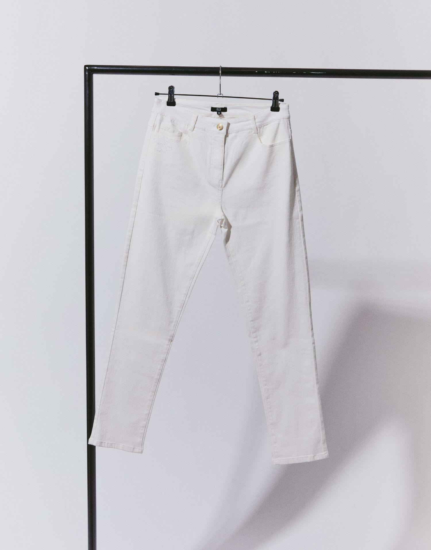 Affirmez votre style avec ce pantalon 7/8 slim blanc, une pièce essentielle pour une silhouette élégante et moderne. Sa coupe ajustée sublime vos jambes tout en offrant un confort optimal au quotidien.