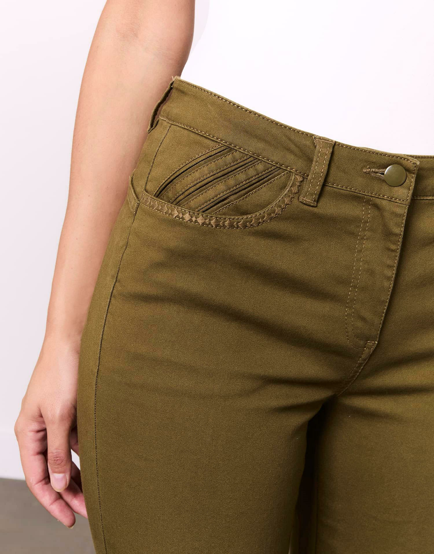 Pantalon 7/8 slim uni kaki pour femme, marque RIU Paris. Sophie mesure 1m77 et porte une taille 38. Coupe ajustée, détails brodés sur les poches avant, longueur 7/8.