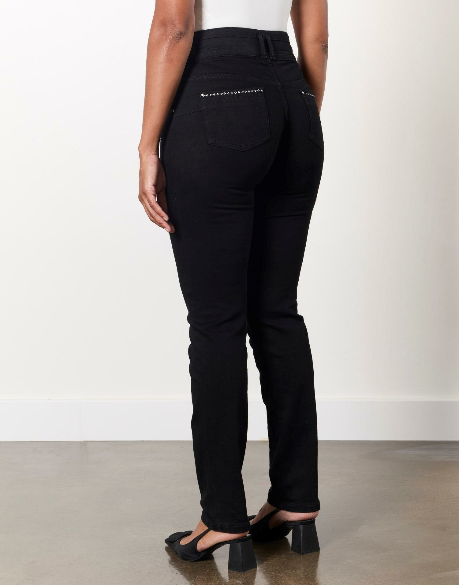 Réponse. Sa coupe slim et sa taille haute sont conçues pour valoriser la silhouette de manière flatteuse, particulièrement sur les morphologies fines à moyennes.