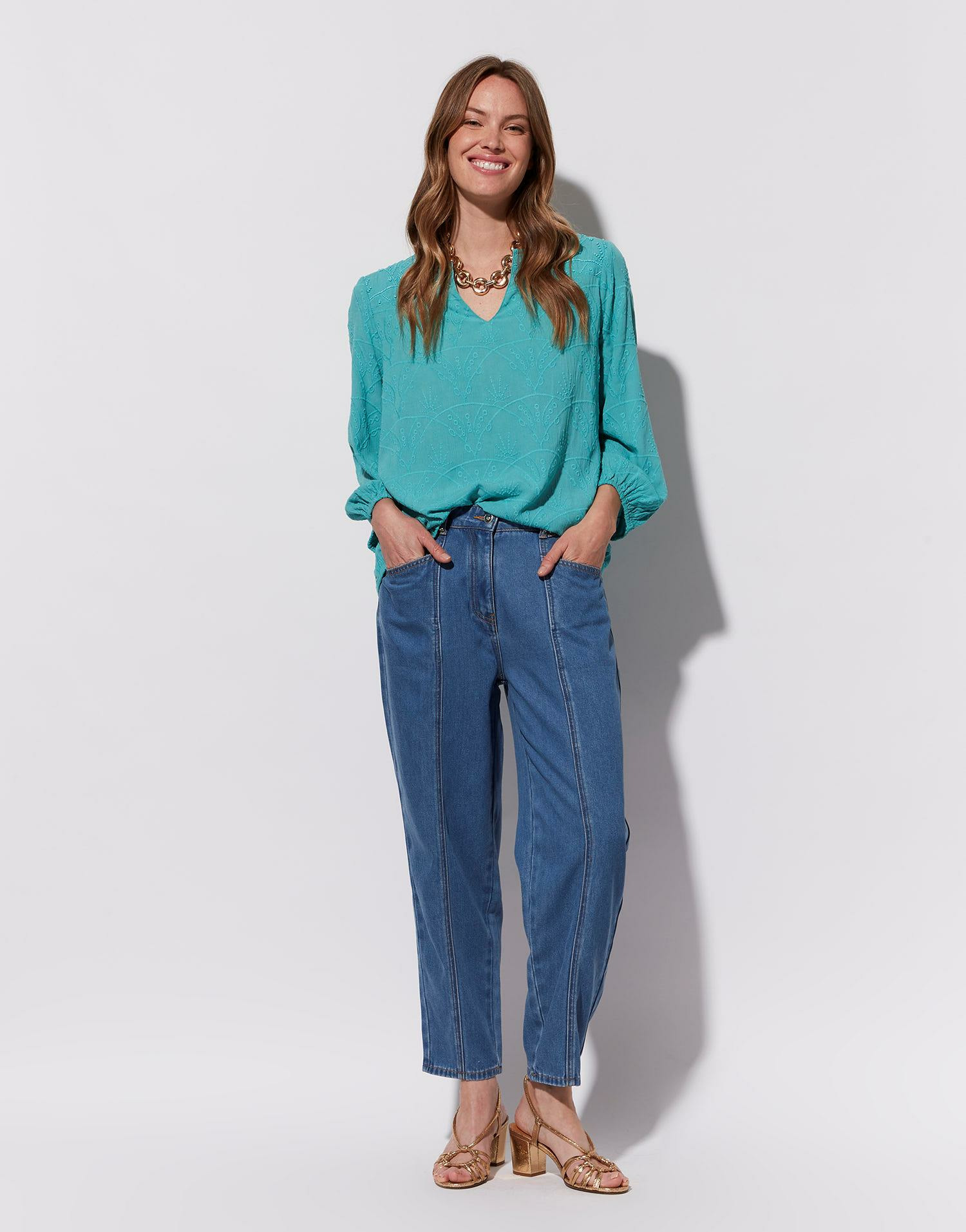 Ce pantalon est fabriqué en tencel, une fibre naturelle reconnue pour sa respirabilité et sa résistance. Il dispose de deux poches avant, de passants de ceinture avec strass, et d’une coupe 7/8ème conçue pour flatter toutes les morphologies. Emily, notre modèle, mesure 1m79 et porte une taille 38.