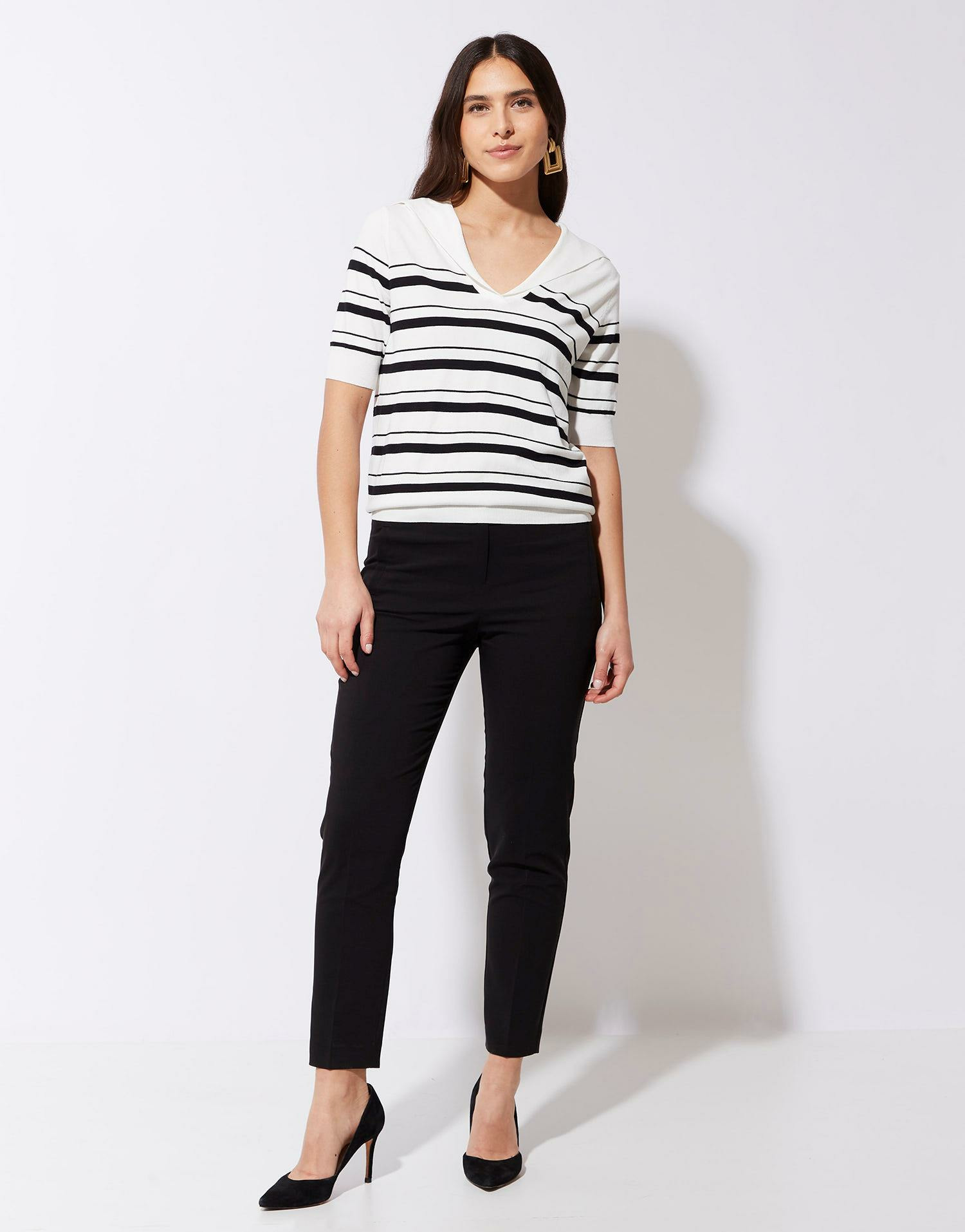 Ce pantalon cigarette uni noir est un basique polyvalent qui s’accorde facilement avec vos hauts préférés, du chemisier fluide au pull près du corps. Le bouton avec cercle émaillé ajoute un détail subtil mais travaillé, soulignant la qualité et le soin apportés à la confection. Vous bénéficiez ainsi d’une pièce intemporelle, facile à associer et à porter au quotidien.