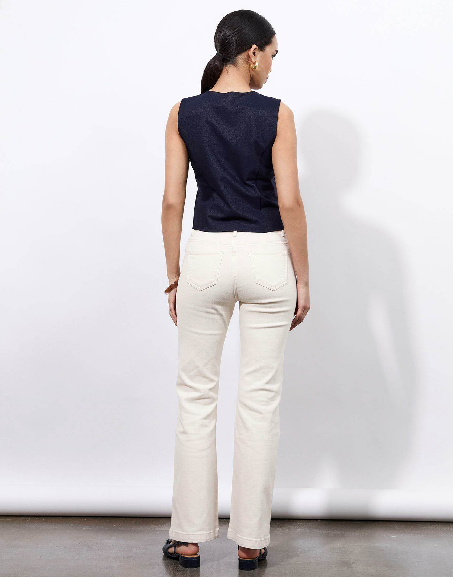 Confectionné dans un tissu uni, ce jean flare se distingue par ses petites surpiqûres en lurex qui captent la lumière avec finesse. Il s’adapte parfaitement à votre morphologie grâce à sa taille classique et ses passants pour ceinture, offrant à la fois confort et style. La coupe flare allonge visuellement les jambes, pour un effet élancé immédiat.
