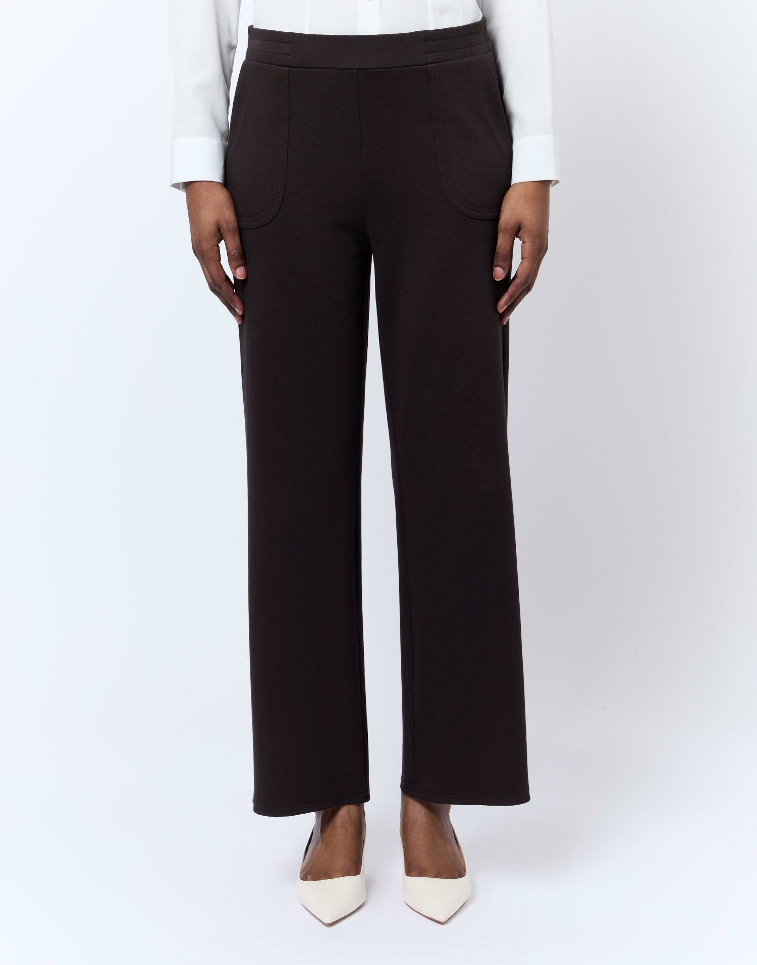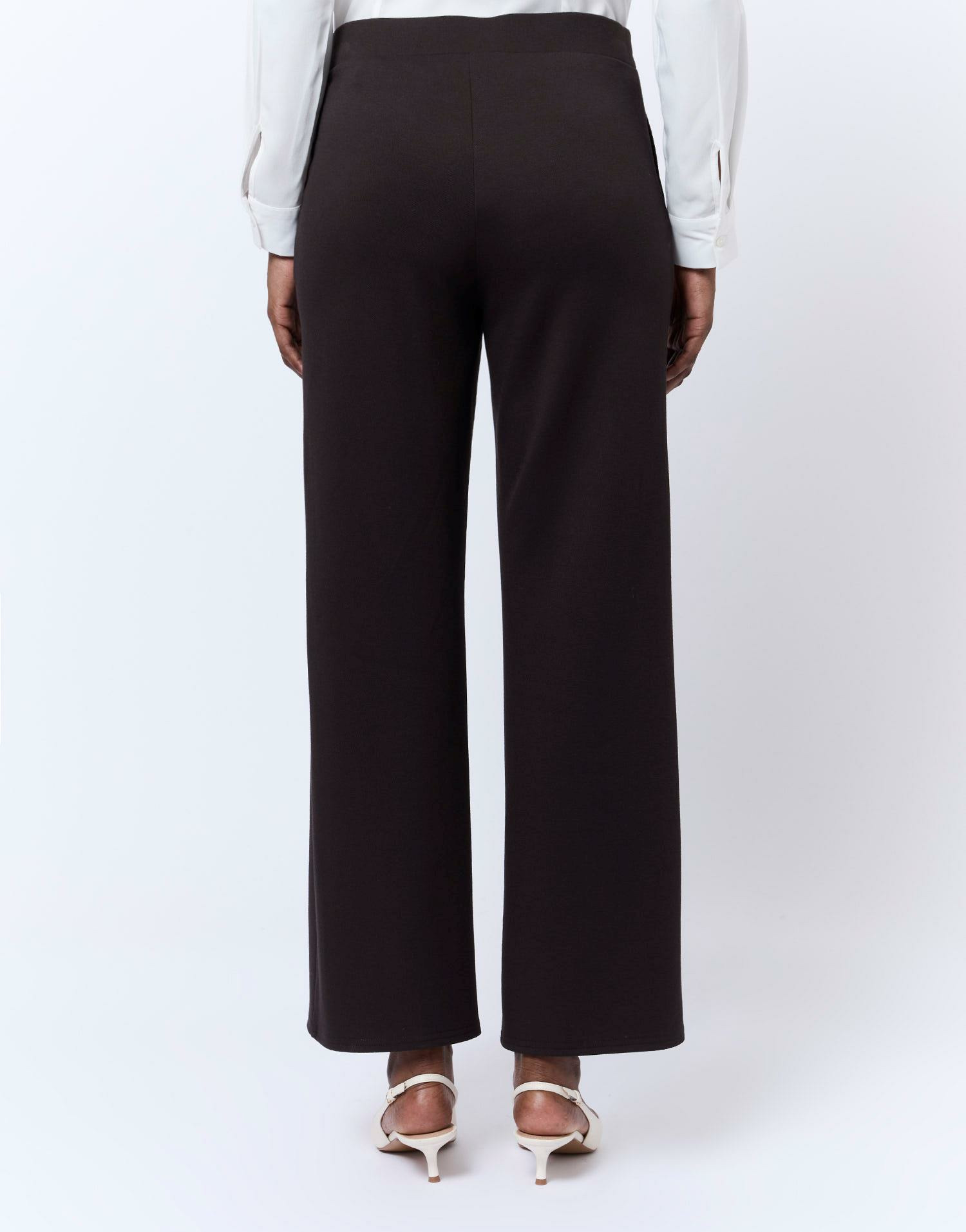 Pantalon long en tricot marron, coupe large et fluide, taille élastiquée, poches latérales. La mannequin mesure 1m75 et porte une taille 38.