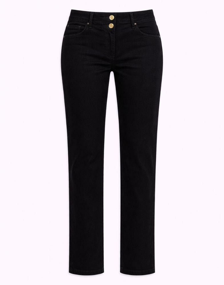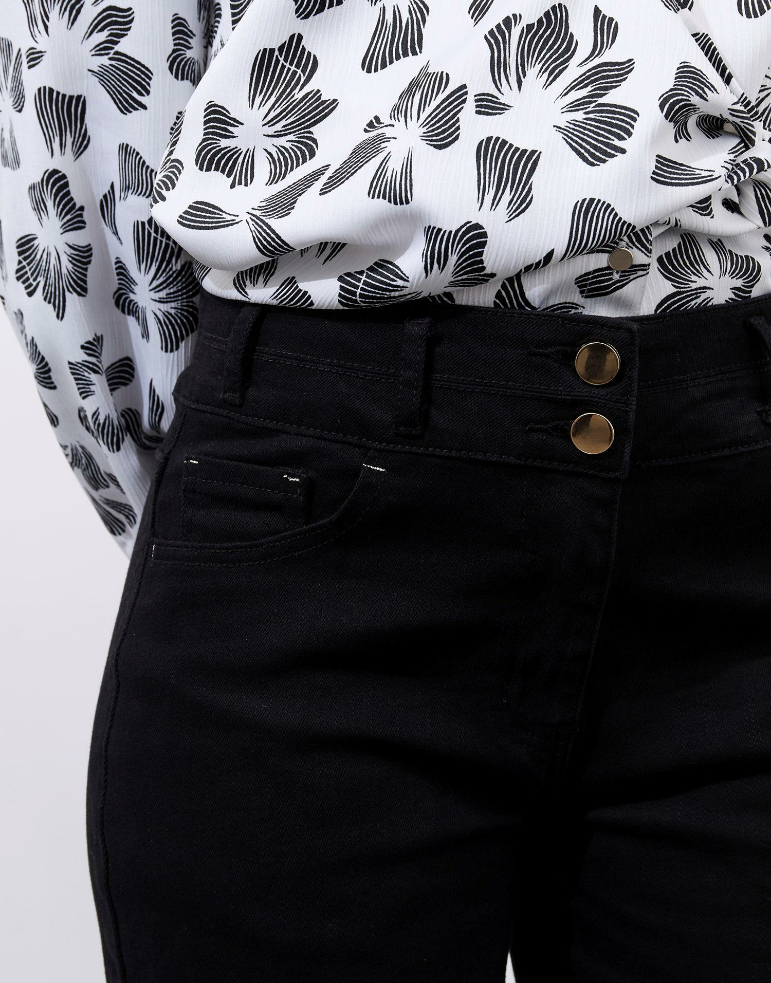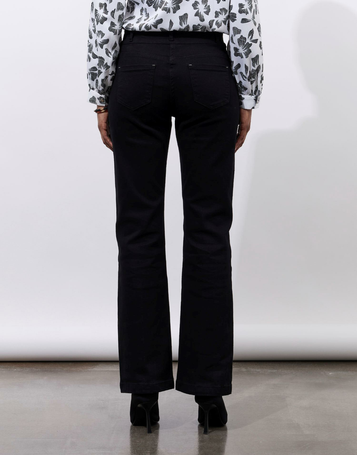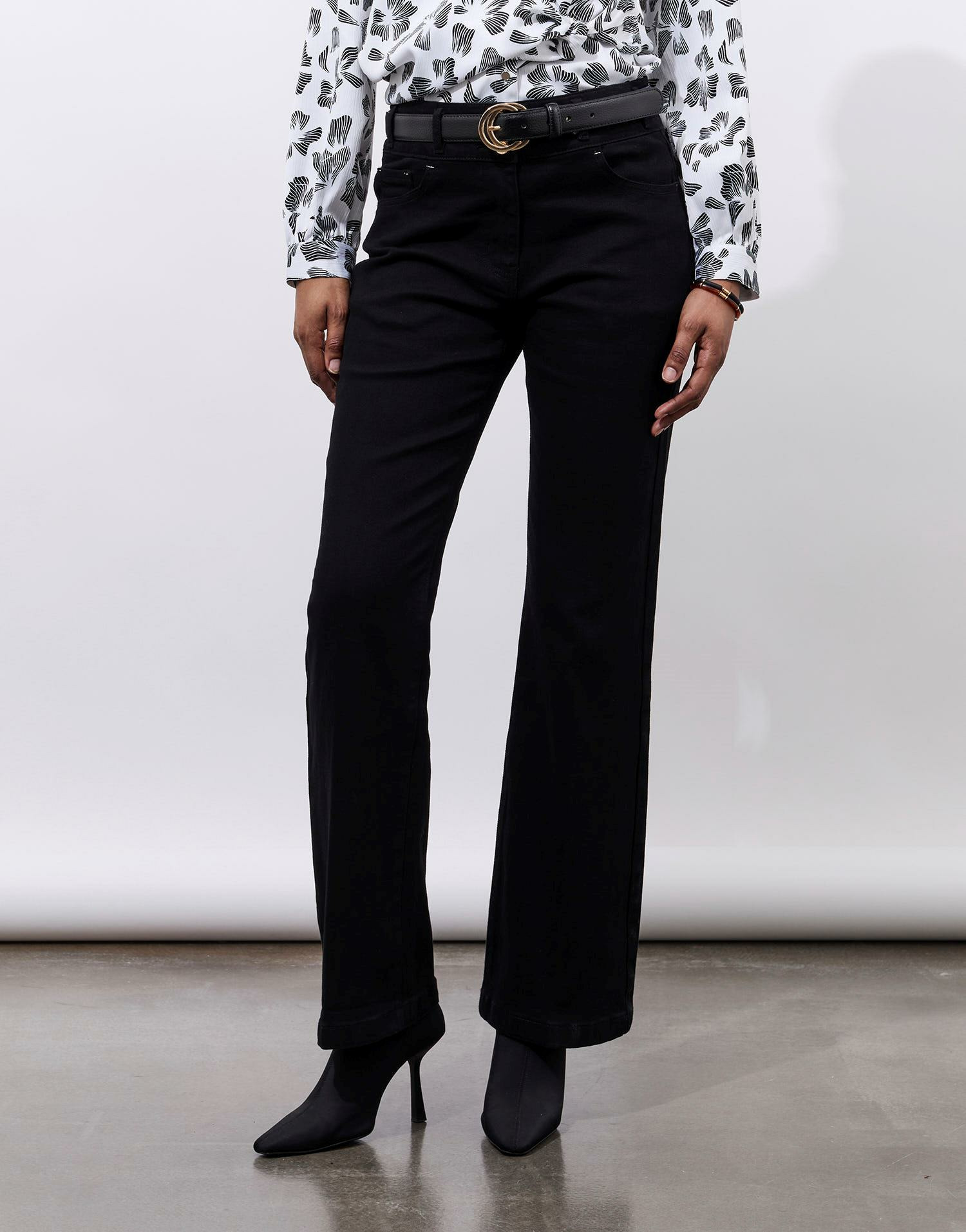 Pantalon long uni noir pour femme, doté de cinq poches fonctionnelles. Fermeture à deux boutons dorés pour un détail chic. La mannequin mesure 1m75 et porte une taille 38.