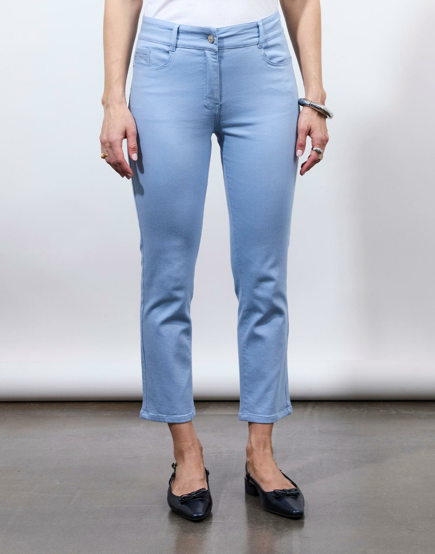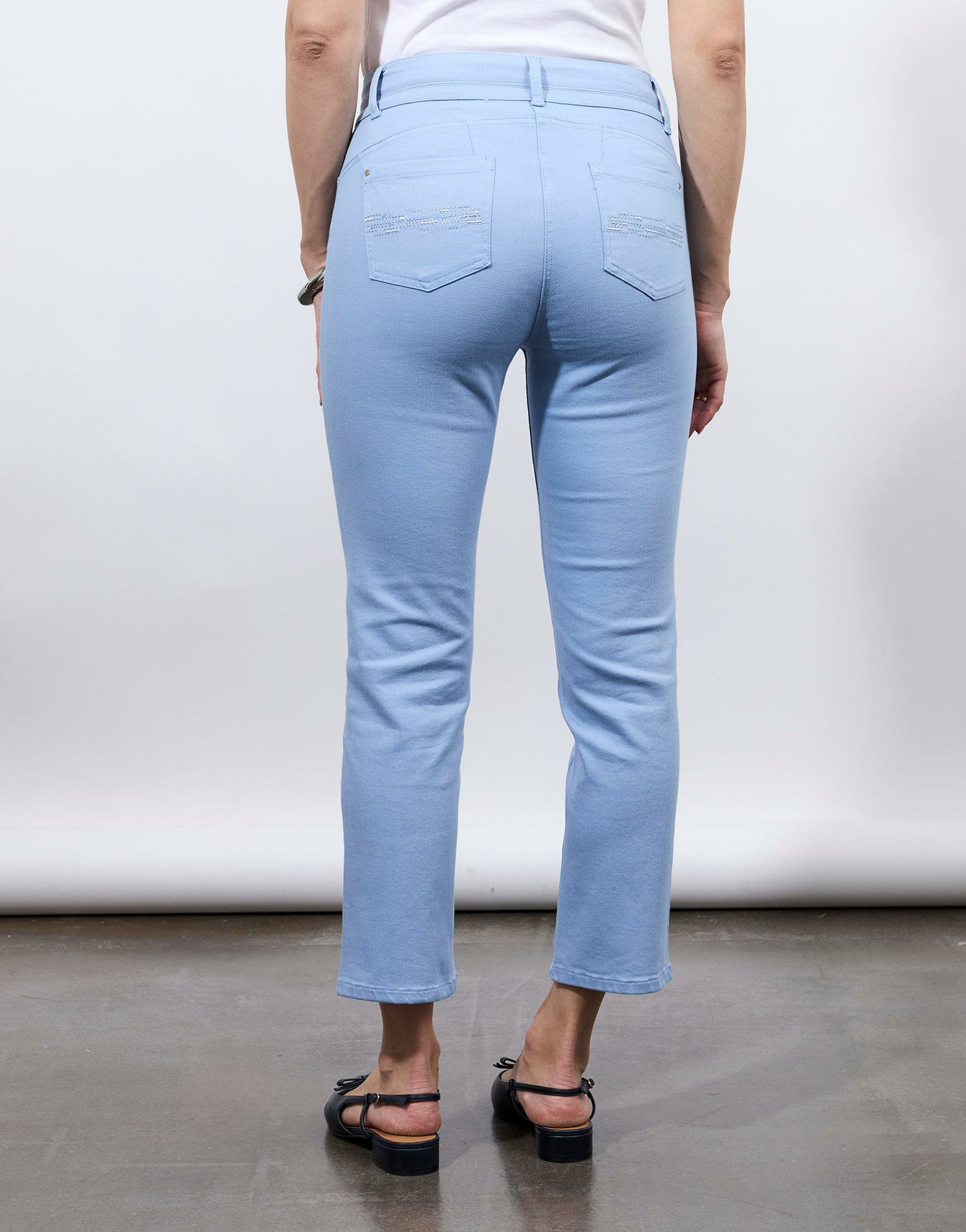 Jean à coupe ajustée, longueur légèrement raccourcie. Fermeture classique avec zip et bouton. Passants pour ceinture. Poches avant et arrière. Détail de strass sur la poche arrière. La mannequin mesure 1m75 et porte une taille 38.