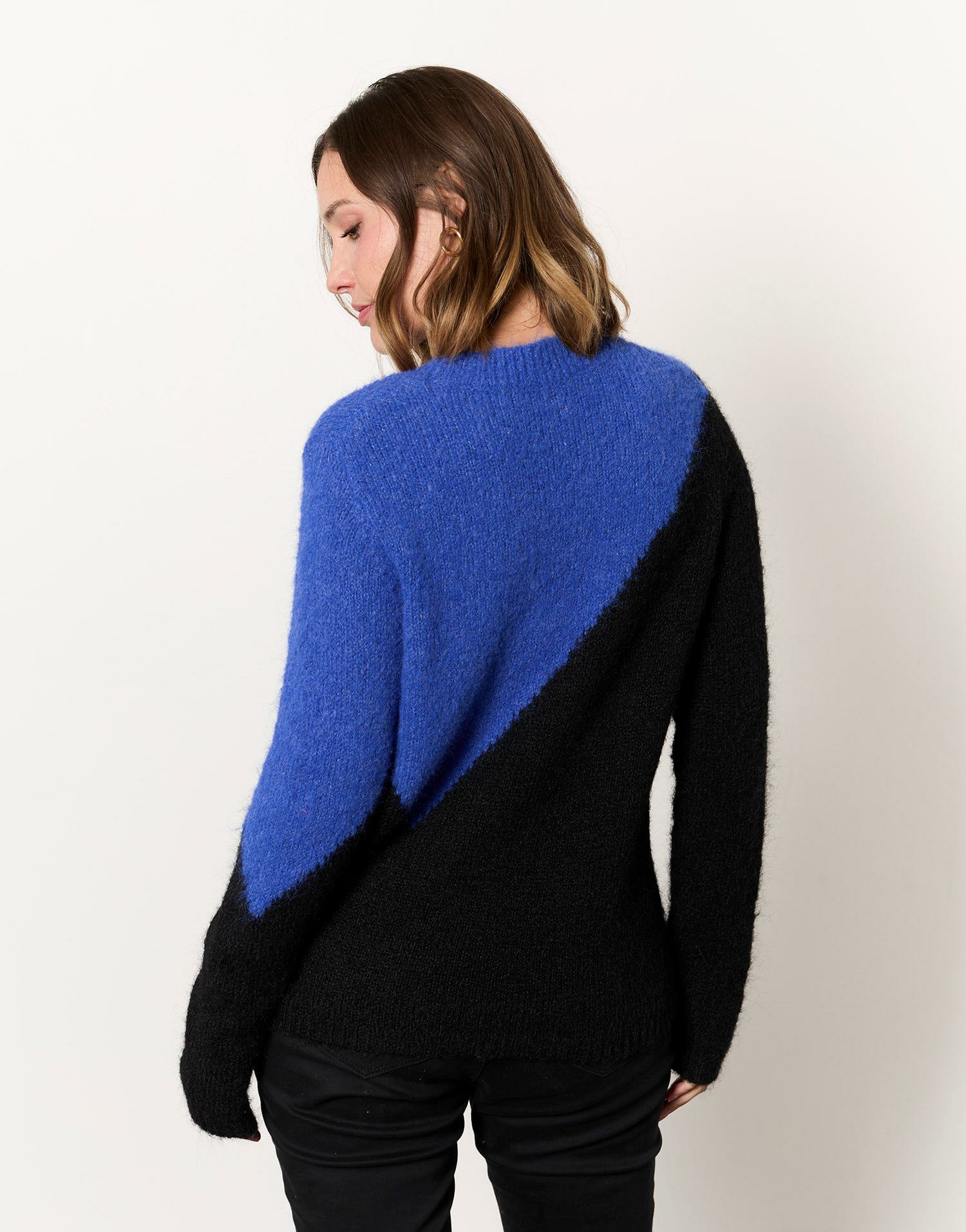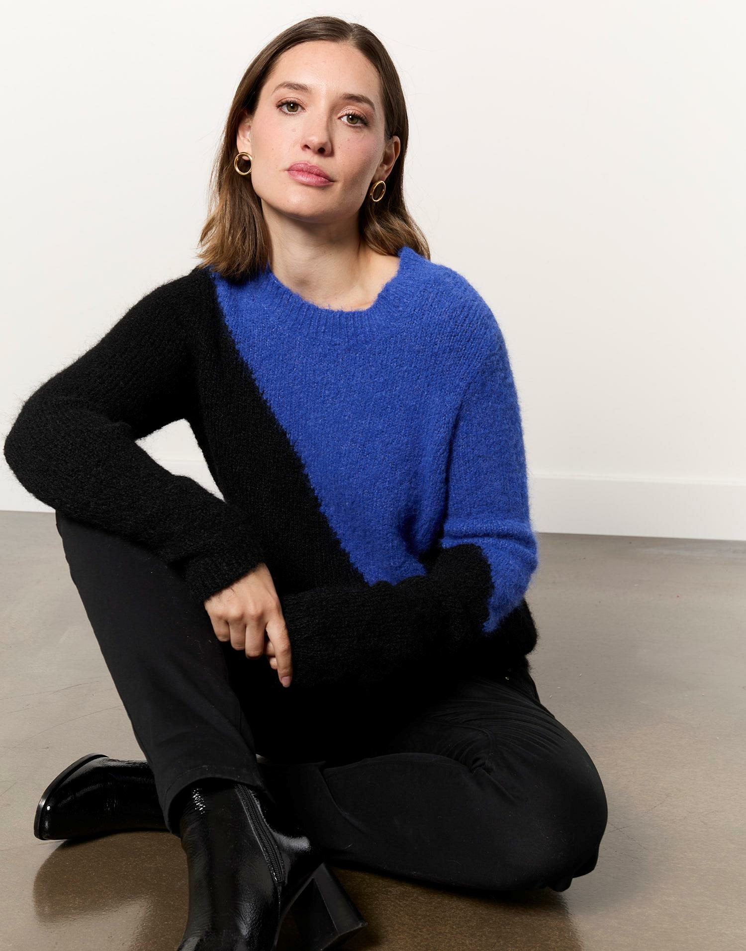 Conçu pour les femmes modernes, ce pull associe la douceur naturelle de la laine à un design audacieux. Le contraste entre le noir profond et le bleu vibrant crée un effet visuel énergique, idéal pour égayer vos looks d’automne et d’hiver. Sa texture enveloppante vous protège efficacement des températures fraîches sans sacrifier votre style.