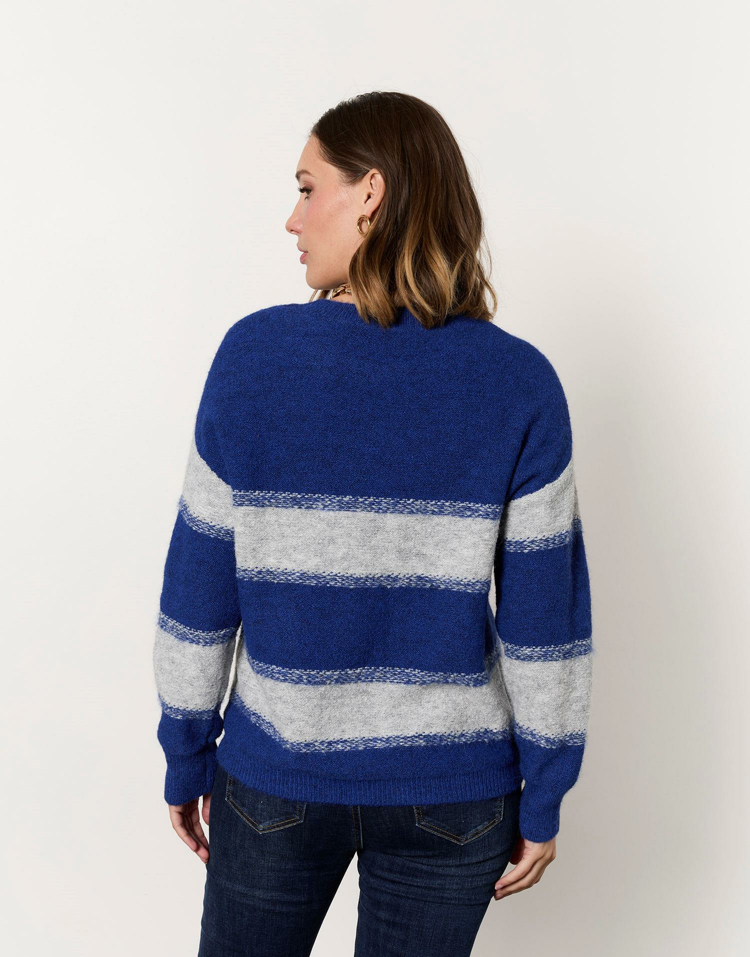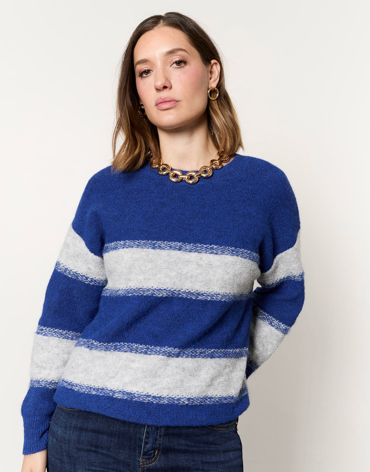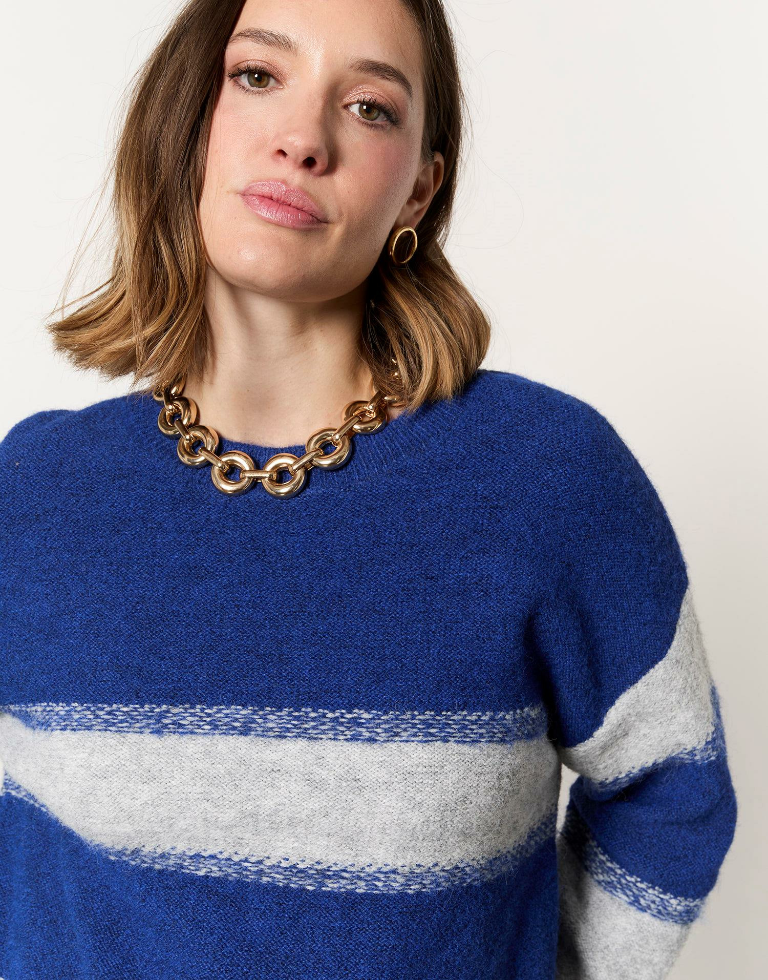 Matière principale : laine enrichie pour plus de chaleur et de douceur. Coupe droite, manches longues. Motif rayé bleu intemporel. Léo mesure 1m77 et porte une taille 01, pour vous aider à choisir la taille adaptée.