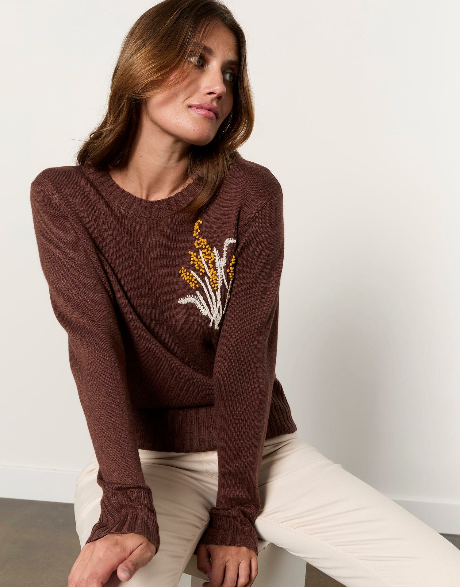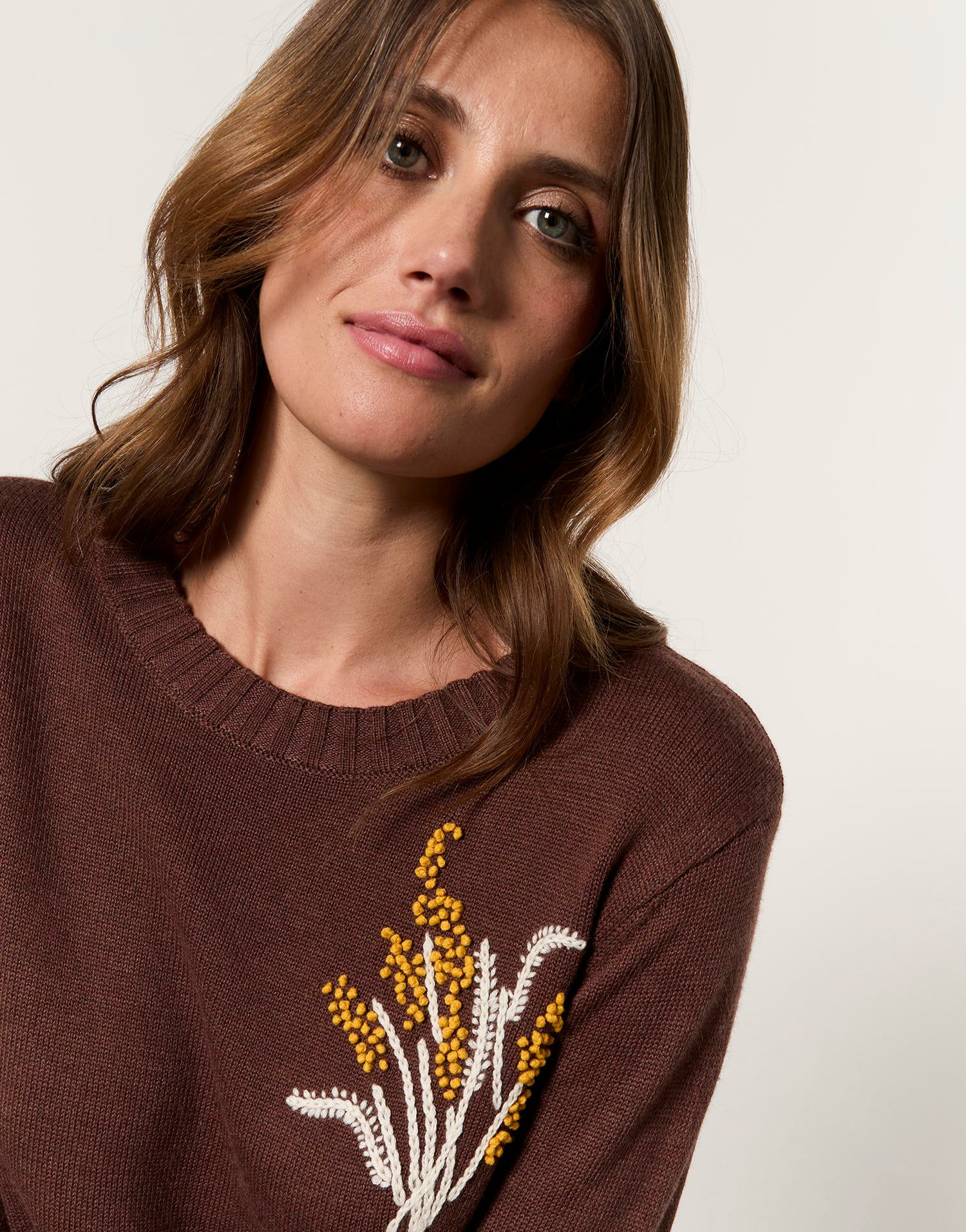 Confectionné avec de la laine, ce pull uni se distingue par son encolure arrondie classique et ses manches longues enveloppantes. Les broderies délicates de bouquets de mimosa apportent une note artistique subtile, sublimant une silhouette simple par une touche raffinée. Sa teinte marron profonde s’adapte facilement à toutes vos tenues, du jean casual à la jupe chic.