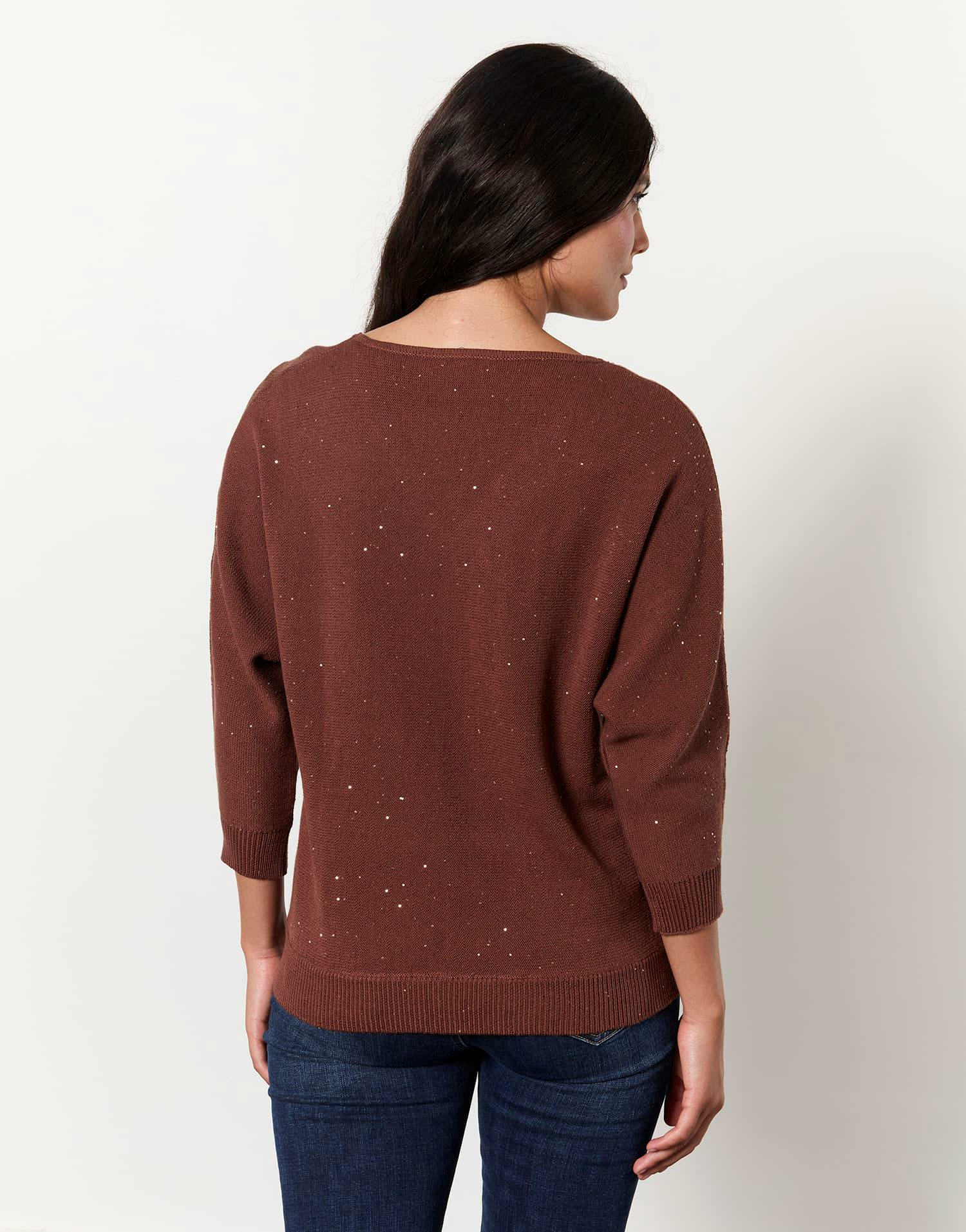 Matière : mélange coton avec légère paillette. Coupe décontractée avec manches chauve-souris 3/4. Col en V. Coloris marron uni. Louna mesure 1m73 et porte une taille 01.