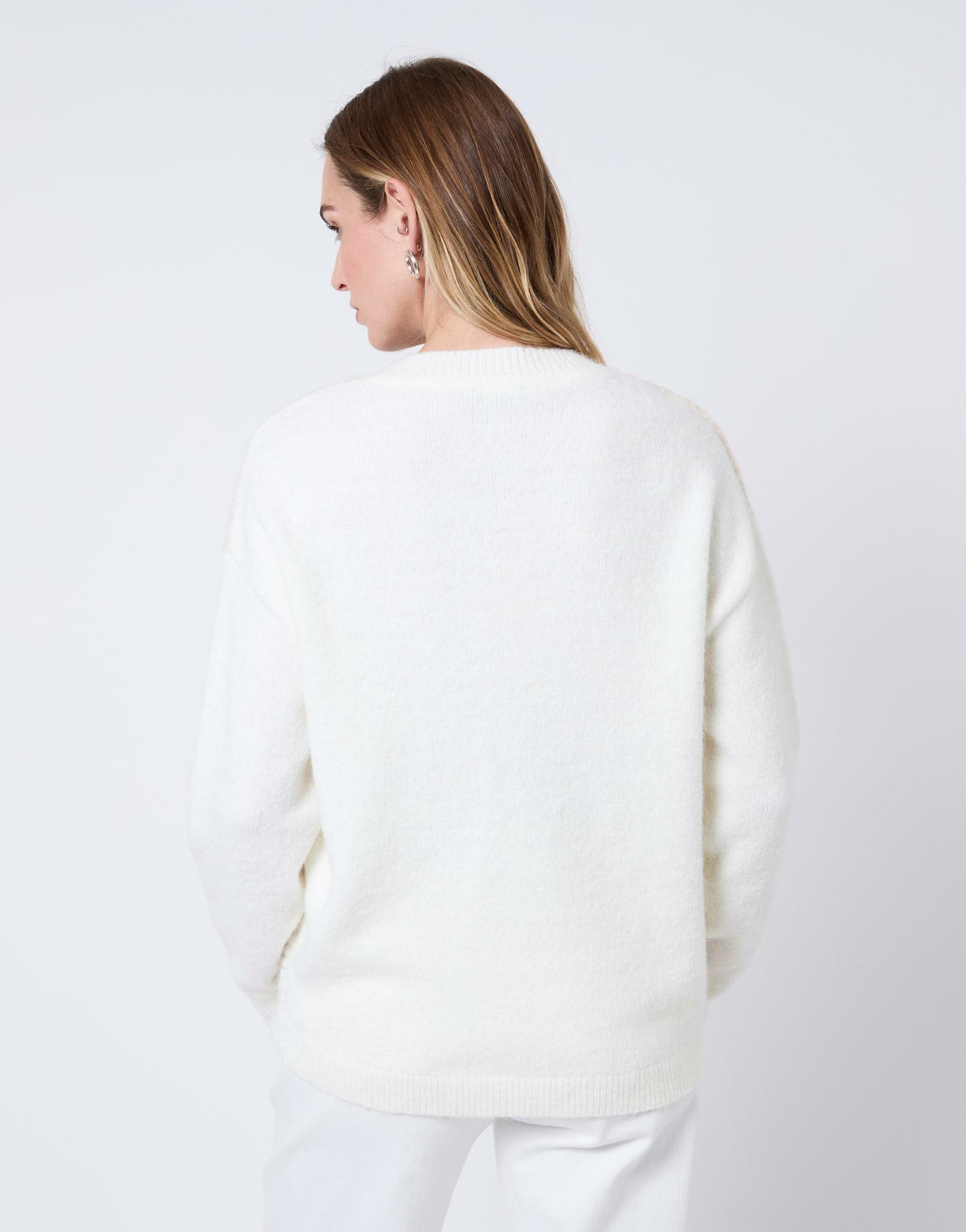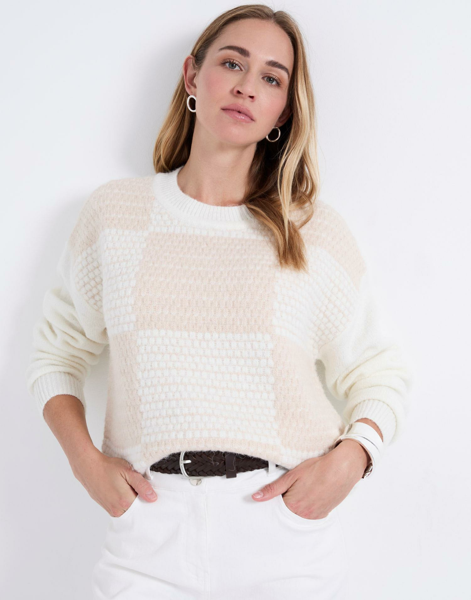Matière : mélange laine bicolore. Tricotage fantaisie effet damier. Encolure arrondie. Manches longues. Coupe légèrement ample. La mannequin mesure 1m75 et porte une taille 1.