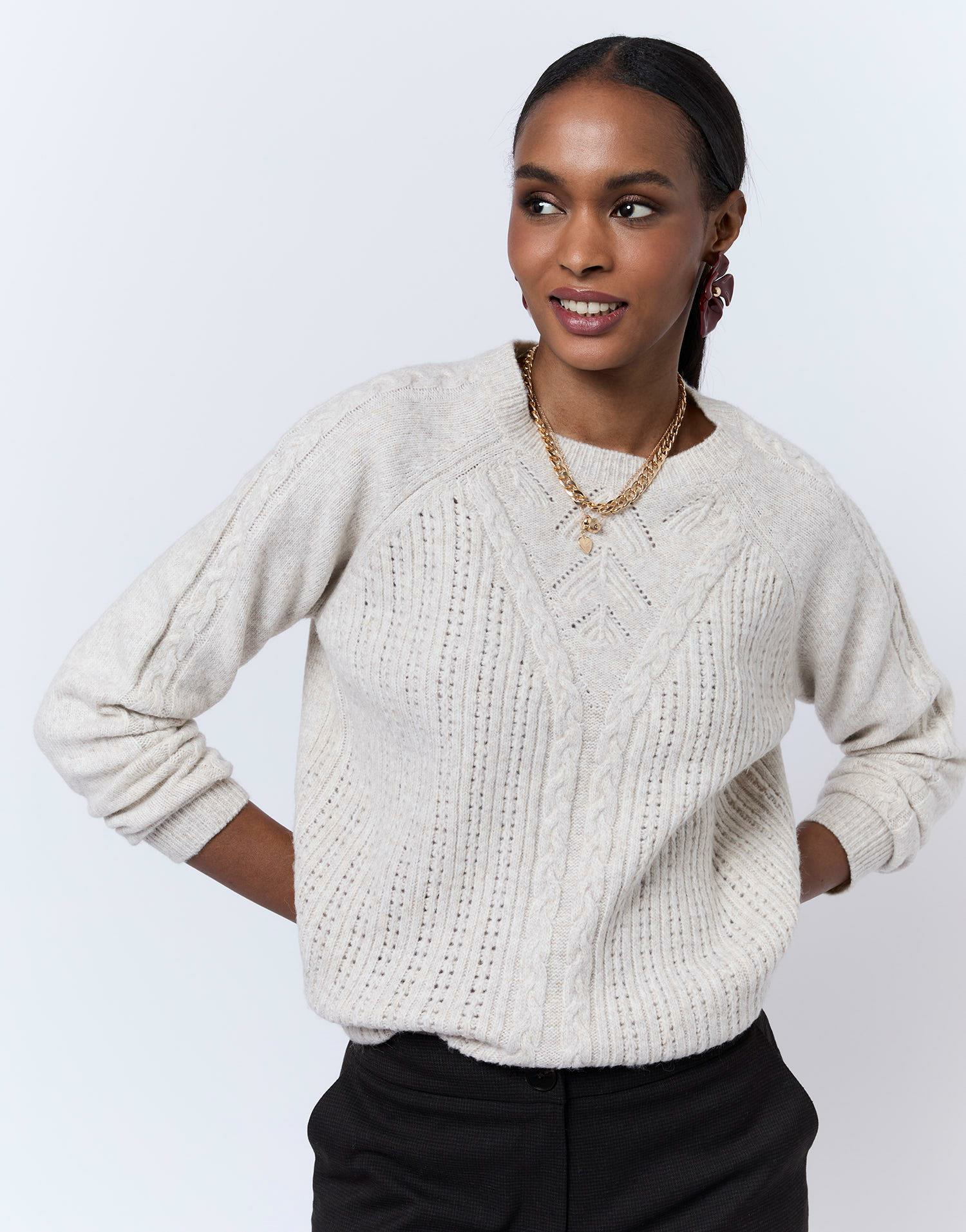 Conçu pour envelopper sans alourdir, ce pull à ras du cou et manches longues joue sur un tricotage fantaisie en torsade qui dynamise sa silhouette. Son coloris beige doux s’accorde facilement, du jean casual aux jupes habillées, pour un look chic et confortable au quotidien.