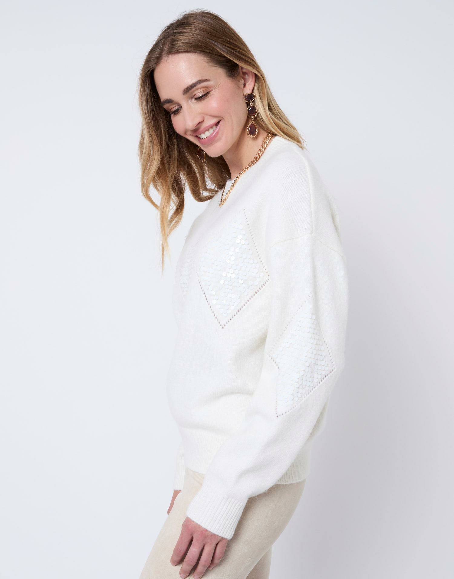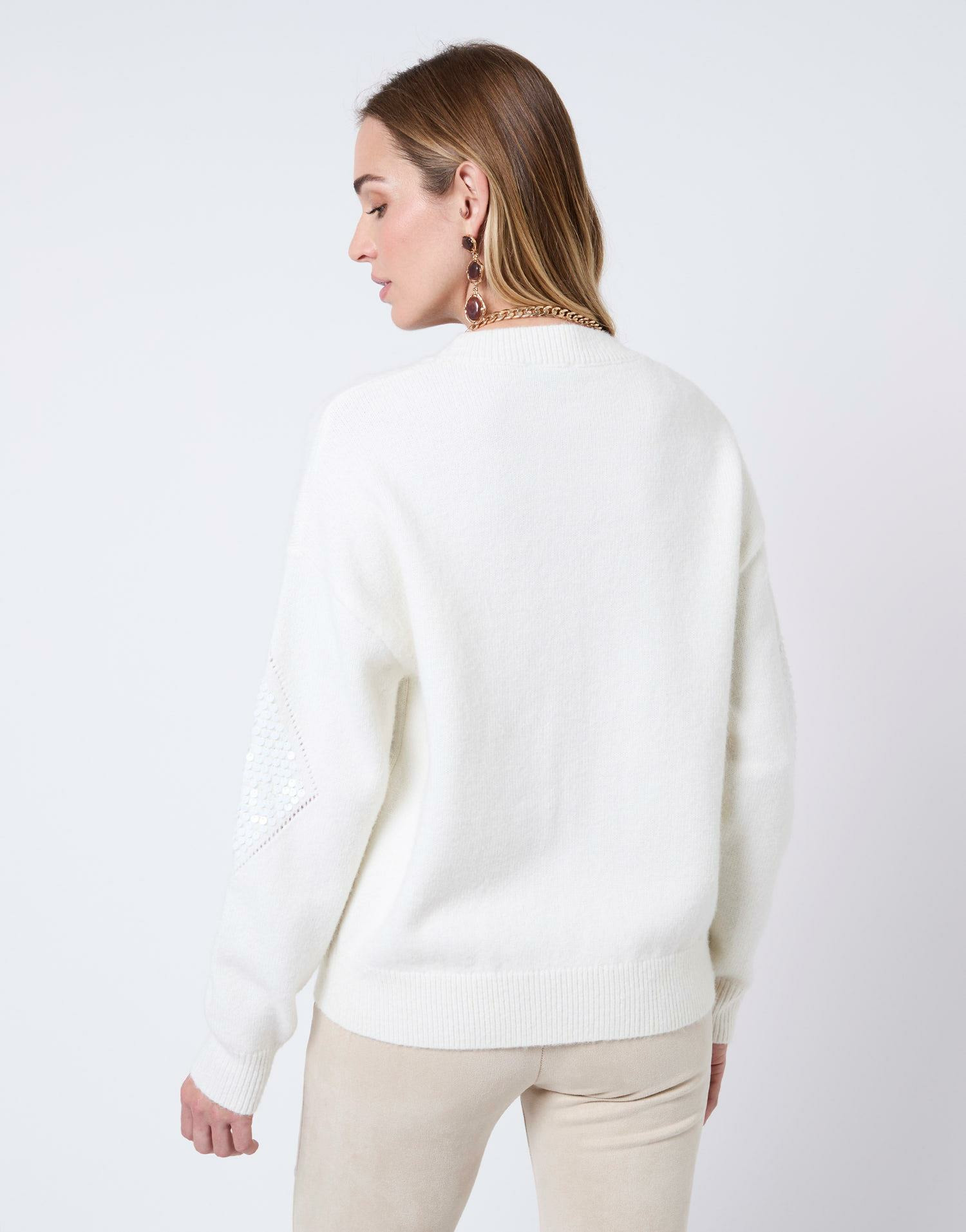 Confectionné dans un mélange de laine doux et épais, ce pull offre une silhouette féminine grâce à son encolure arrondie classique. Les sequins délicatement brodés apportent une touche raffinée et lumineuse, rehaussant la sobriété du coloris écru. Parfait pour composer des tenues à la fois confortables et stylées, il se porte aussi bien en journée qu’en soirée.
