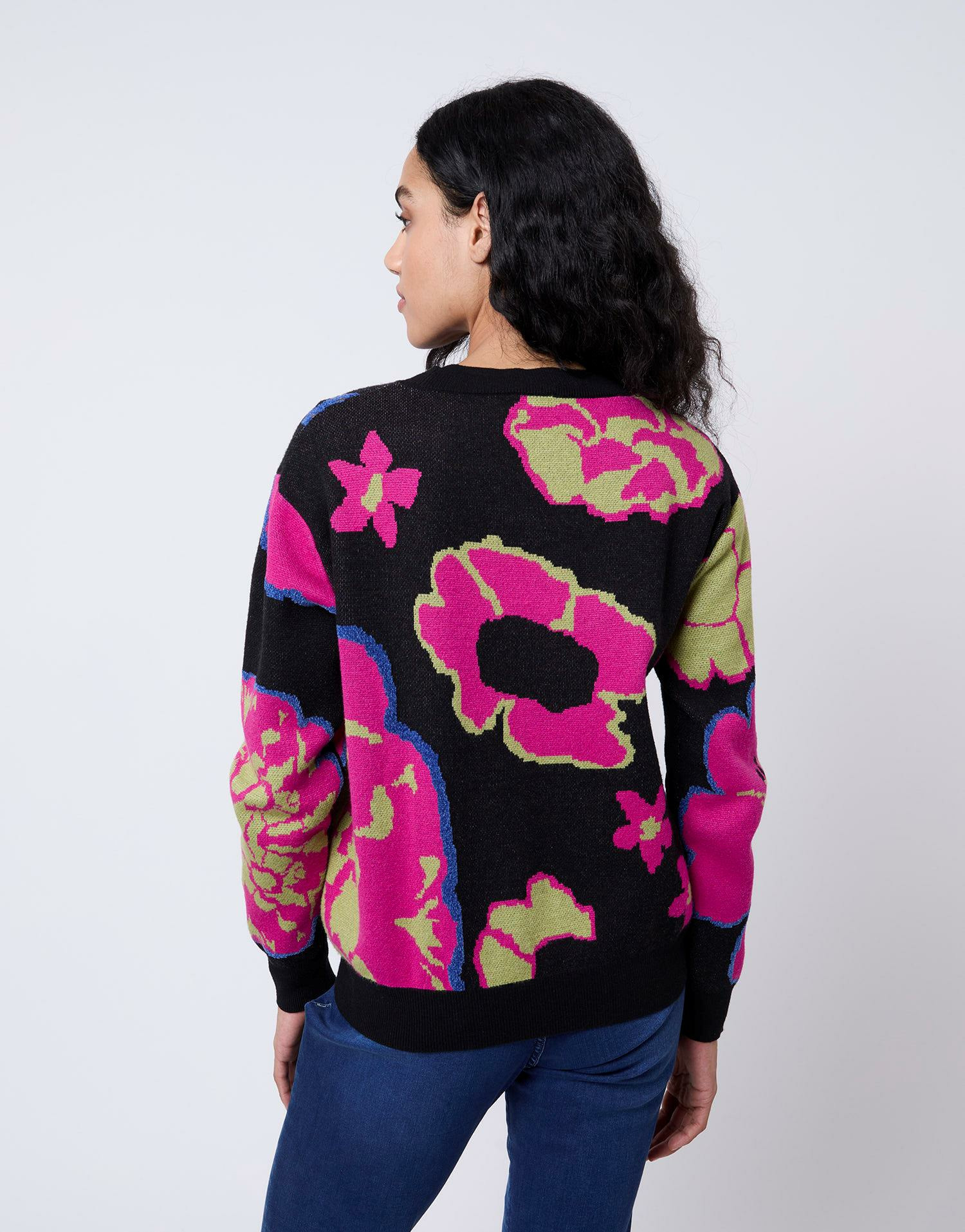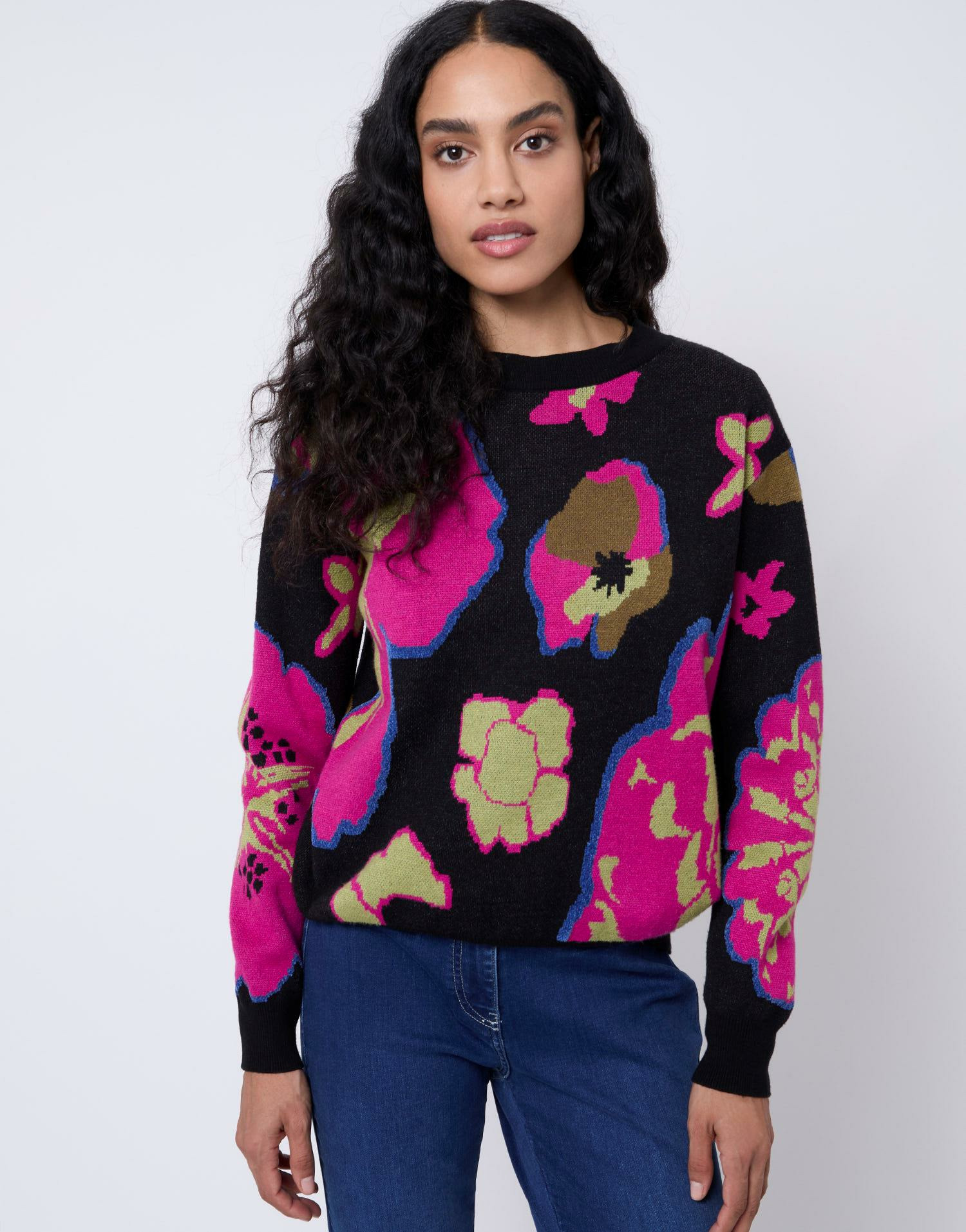 Pull épais en jacquard noir avec motif fleurs, col ras du cou, finitions bord-côte. La mannequin mesure 1m75 et porte une taille 1.