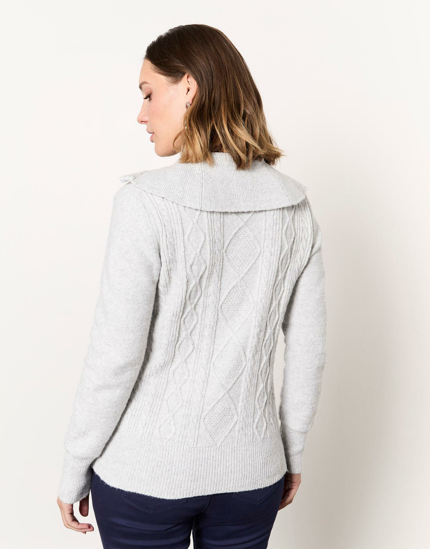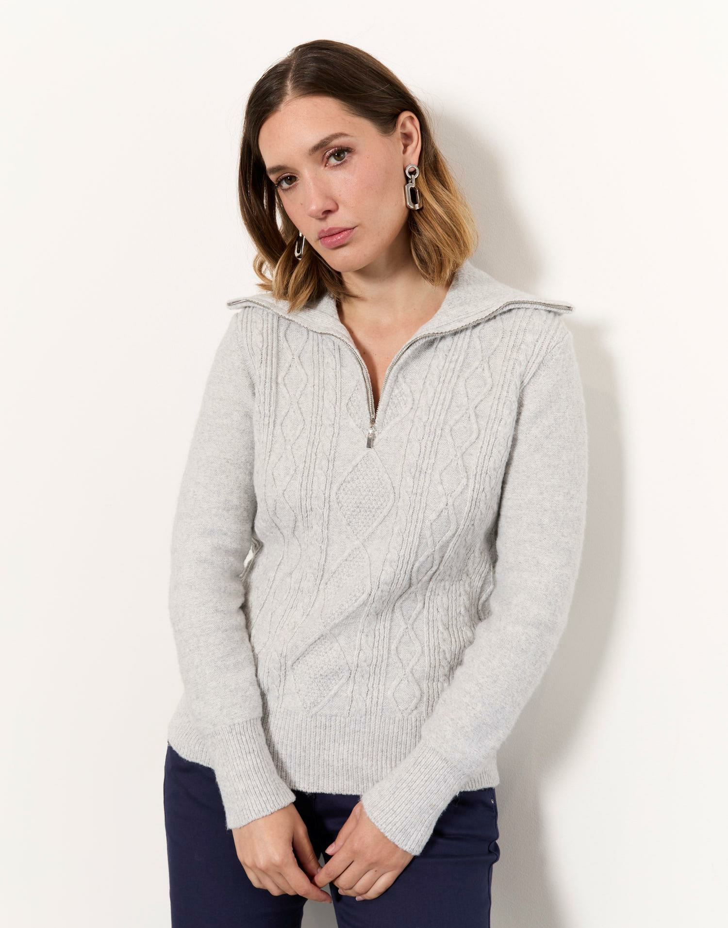 Confectionné dans une maille torsadée généreuse, ce pull vous enveloppe de douceur tout en affirmant votre style. Sa coupe légèrement ajustée met en valeur la silhouette sans sacrifier le confort. Facile à associer, il se marie parfaitement avec un jean ou un pantalon tailleur pour un look casual chic réussi.