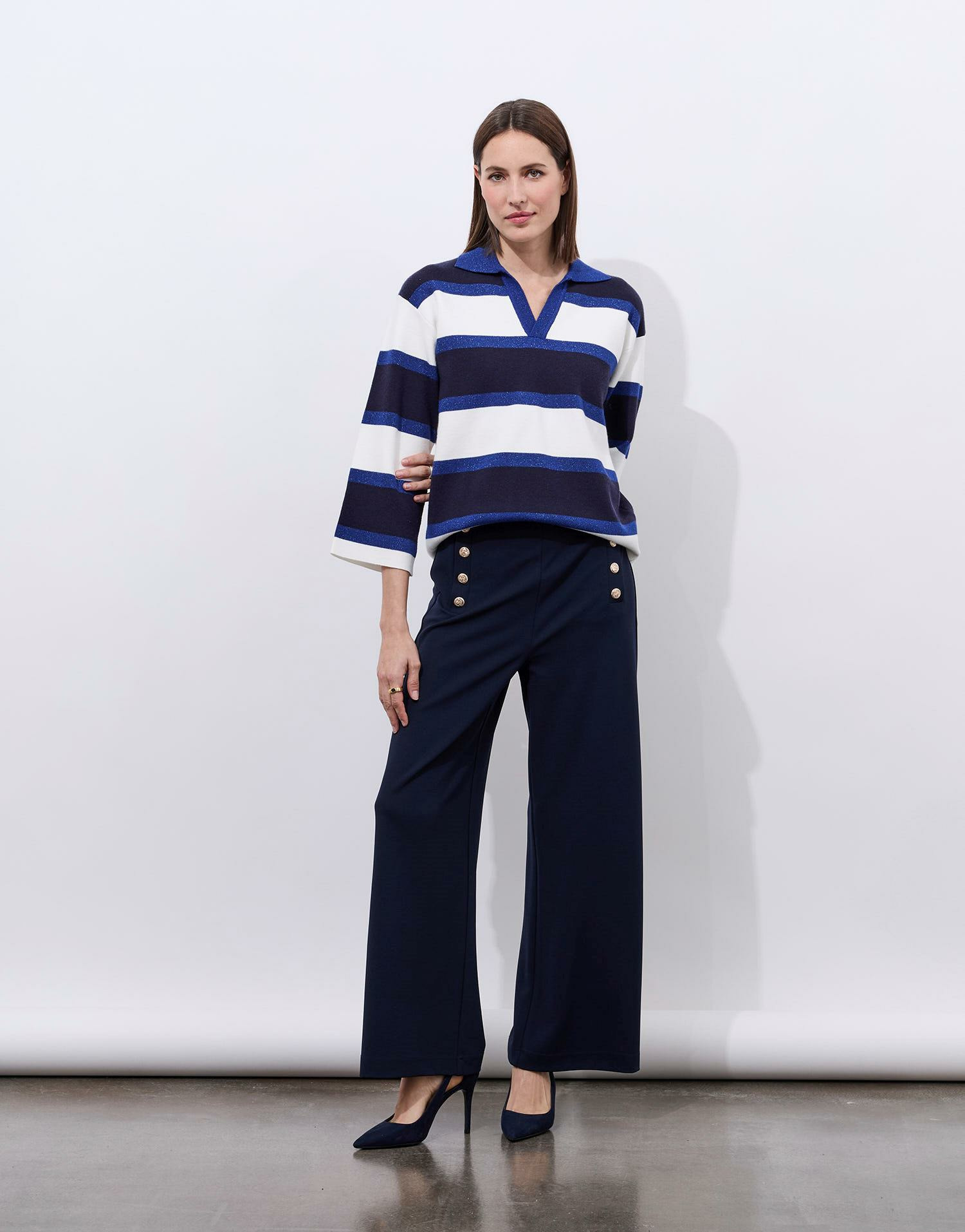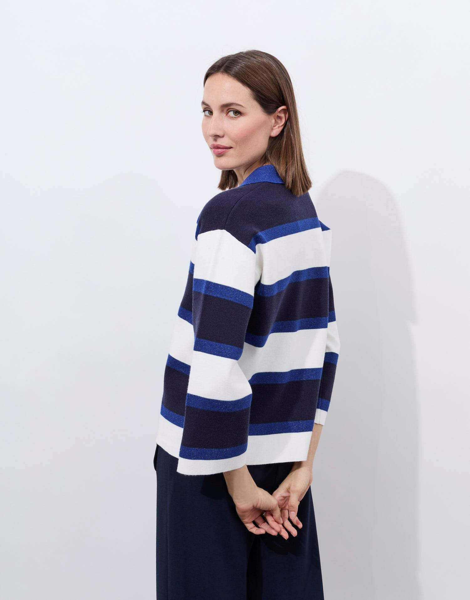 Confectionné dans une matière dense et douce, ce pull se distingue par son col polo structuré et ses manches trois-quarts, offrant une silhouette élégante et décontractée à la fois. Les rayures brillantes apportent une touche contemporaine qui dynamise n’importe quelle tenue, du jean casual à la jupe plus sophistiquée.