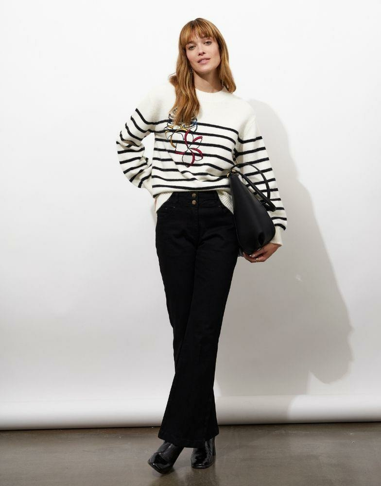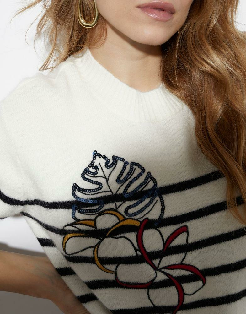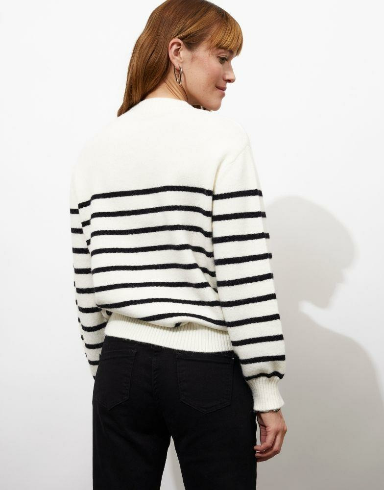 Conçu pour accompagner vos journées avec douceur, ce pull allie finesse des rayures et originalité de la broderie. Ses manches longues et son col montant enveloppent délicatement, offrant une silhouette à la fois féminine et moderne. Facile à assortir, il s’intègre naturellement à vos looks quotidiens, du jean casual à la jupe chic.
