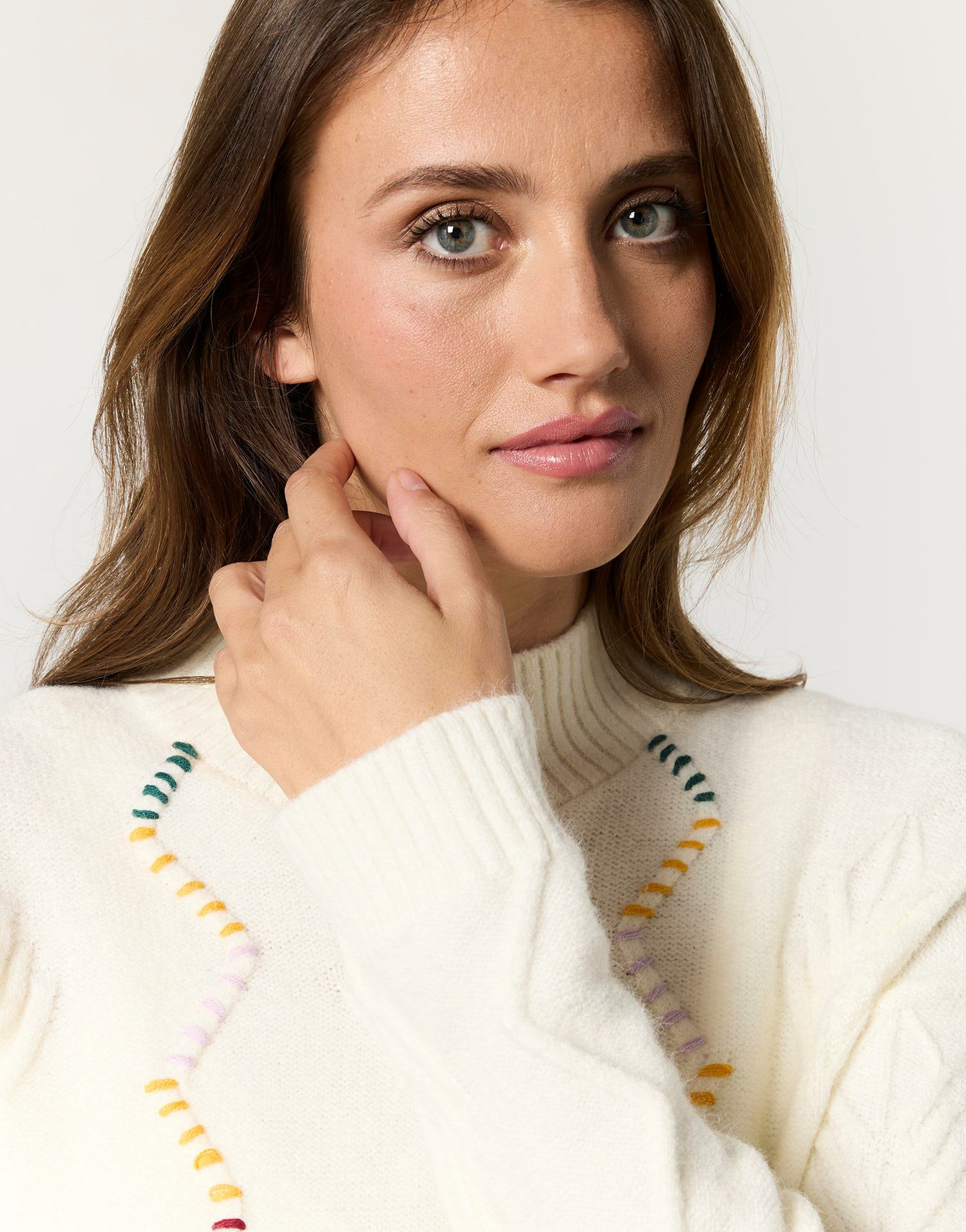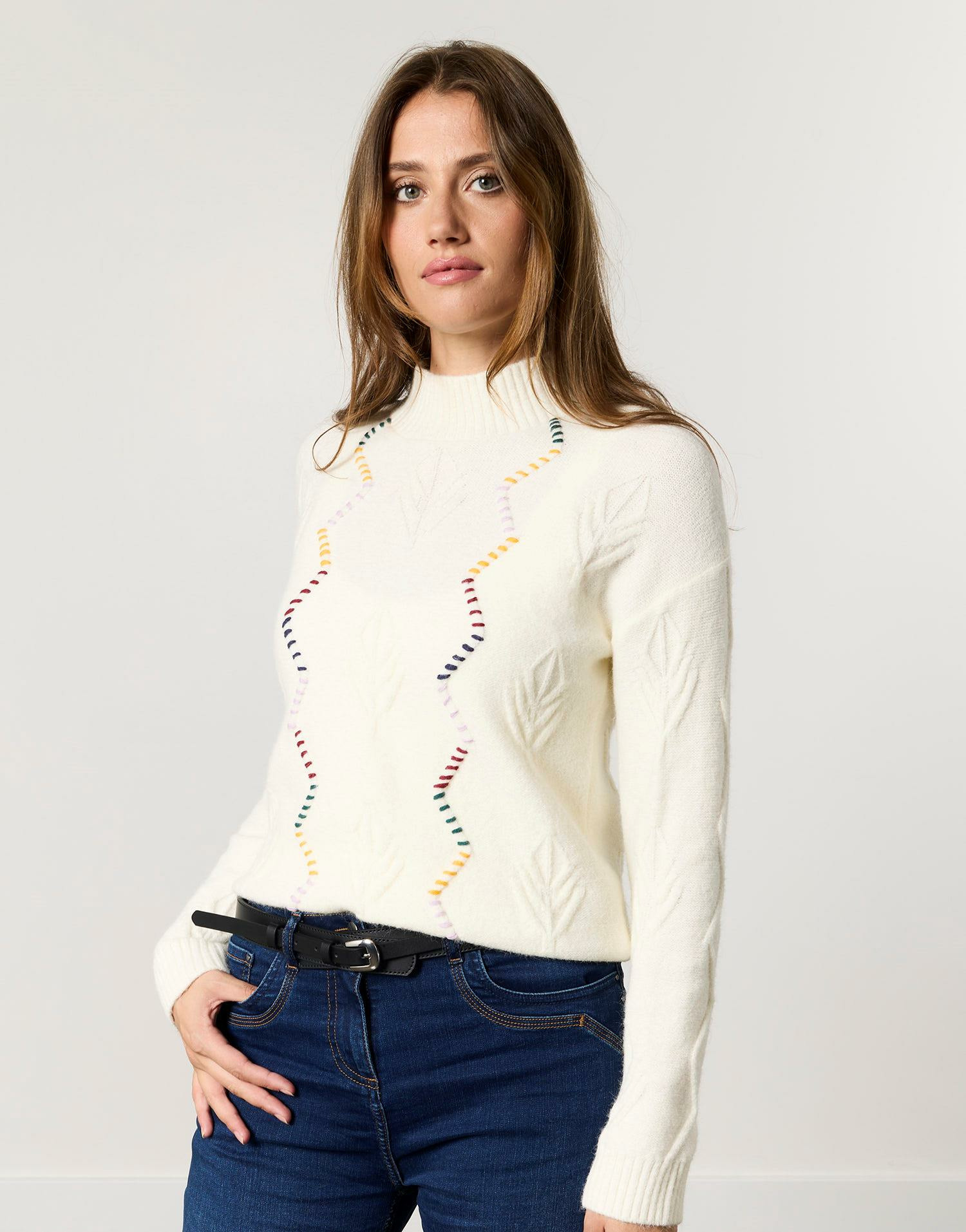 Maille épaisse, col cheminée, broderies de feuilles raffinées avec points de couleurs. Disponible en taille 01, porté ici par un mannequin mesurant 1m79.