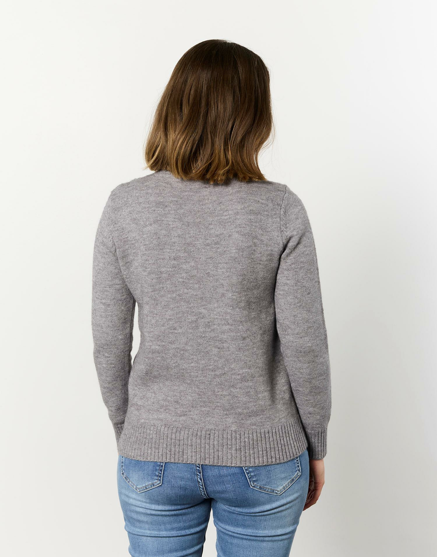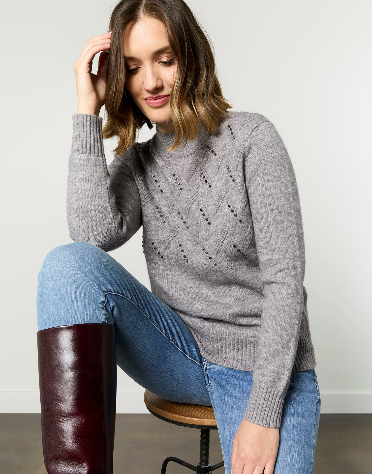 Pull gris uni en maille torsadée avec clous fantaisies. Col montant, manches longues. Léo mesure 1m77 et porte une taille 01.