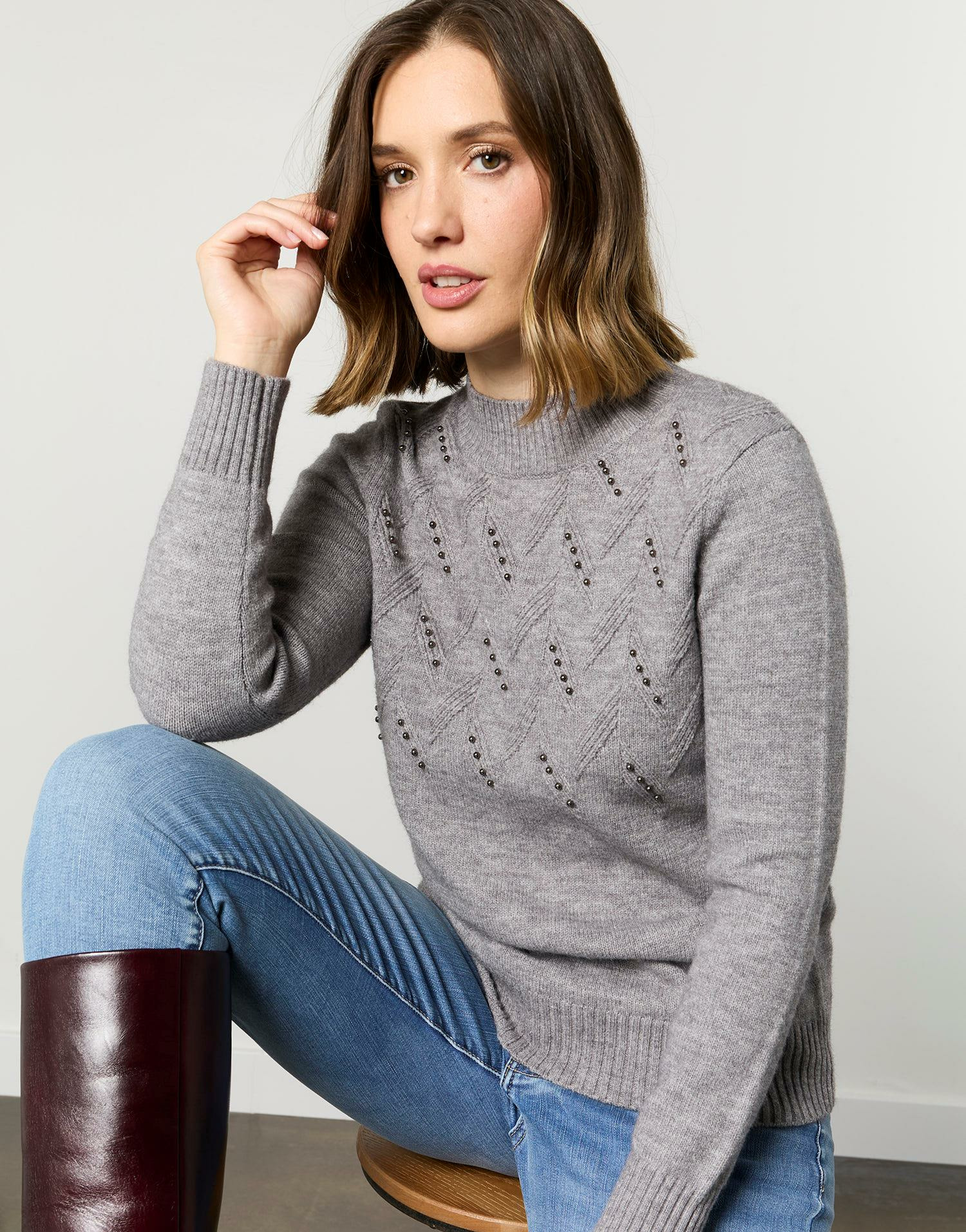 Ce pull épais gris allie élégance et caractère grâce à sa maille torsadée en relief et ses clous fantaisies qui subliment une coupe basique revisitée. Son col montant et ses manches longues offrent une silhouette moderne et confortable, idéale pour affronter les journées fraîches avec style.