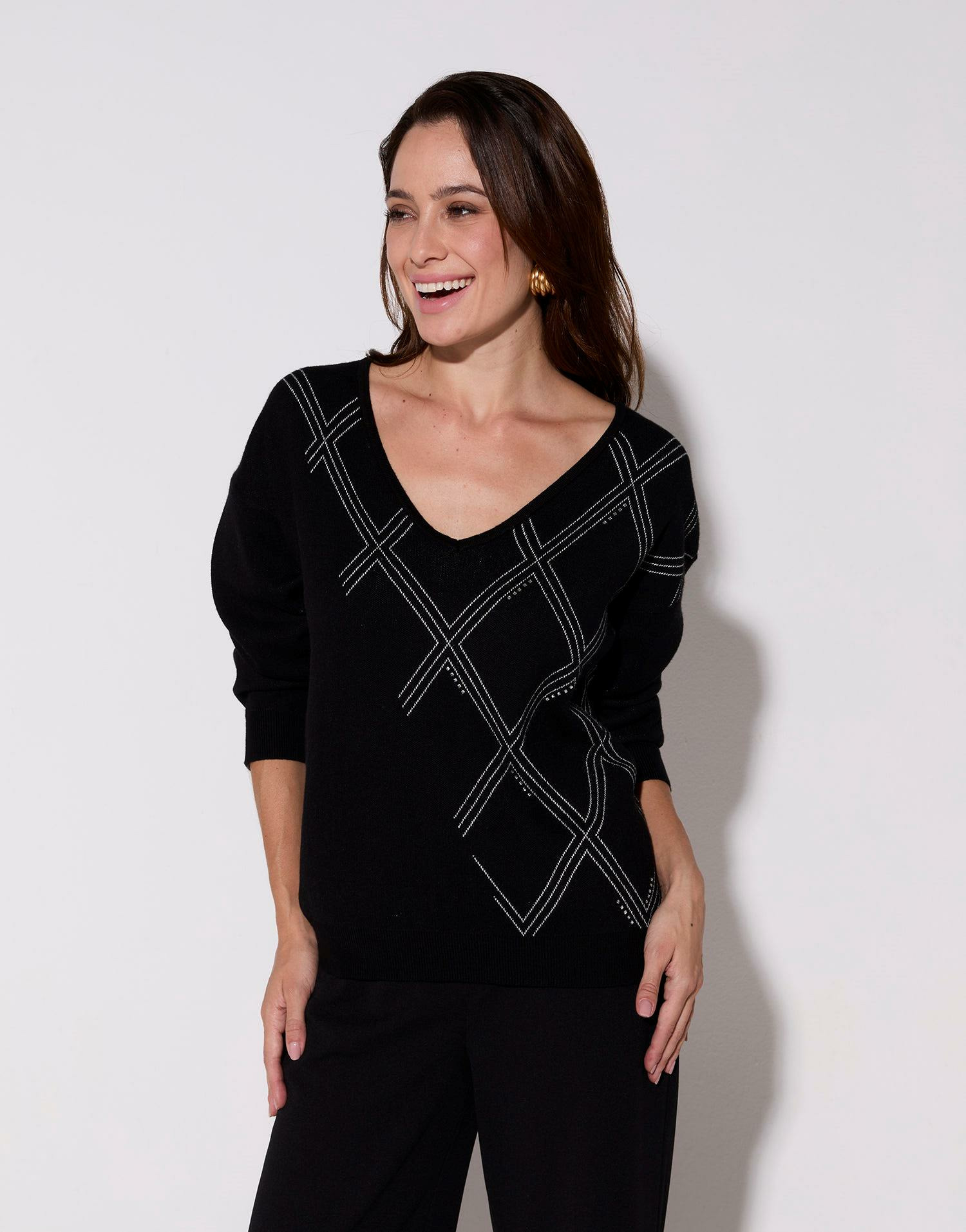 Adoptez une allure sophistiquée avec ce pull épais noir, sublimé par un décolleté en V et des strass délicats. Une pièce chic qui allie confort et modernité pour affronter les journées fraîches avec style.