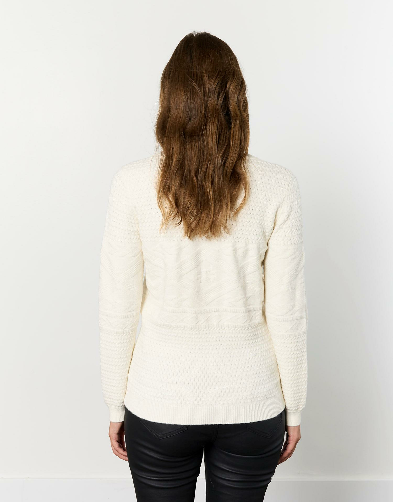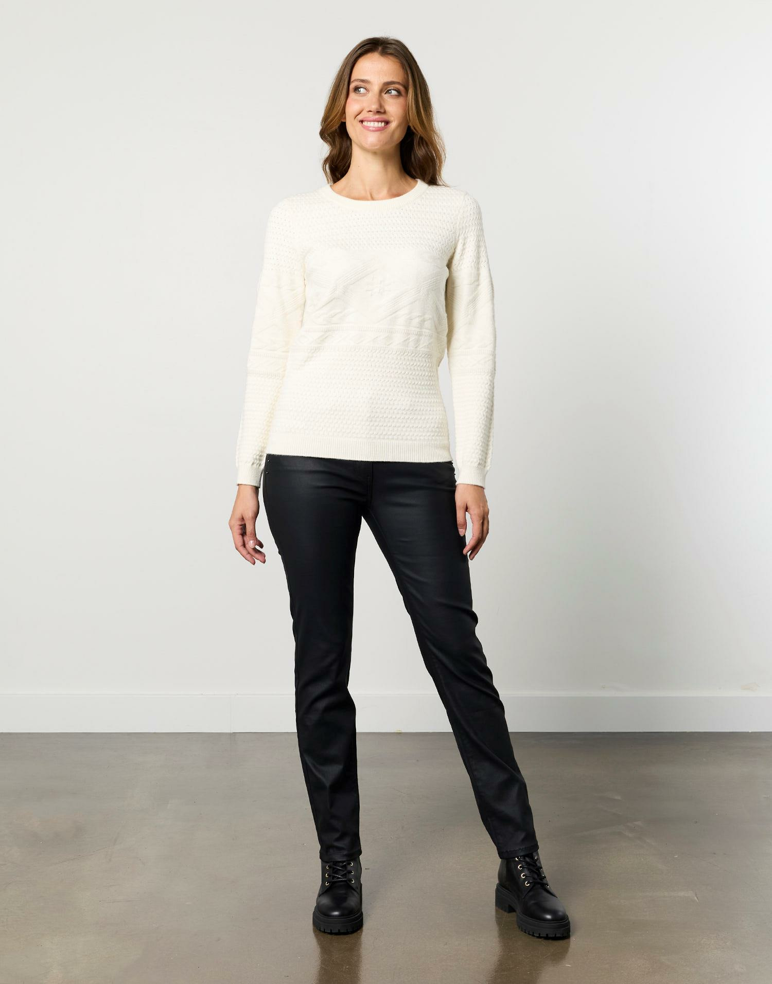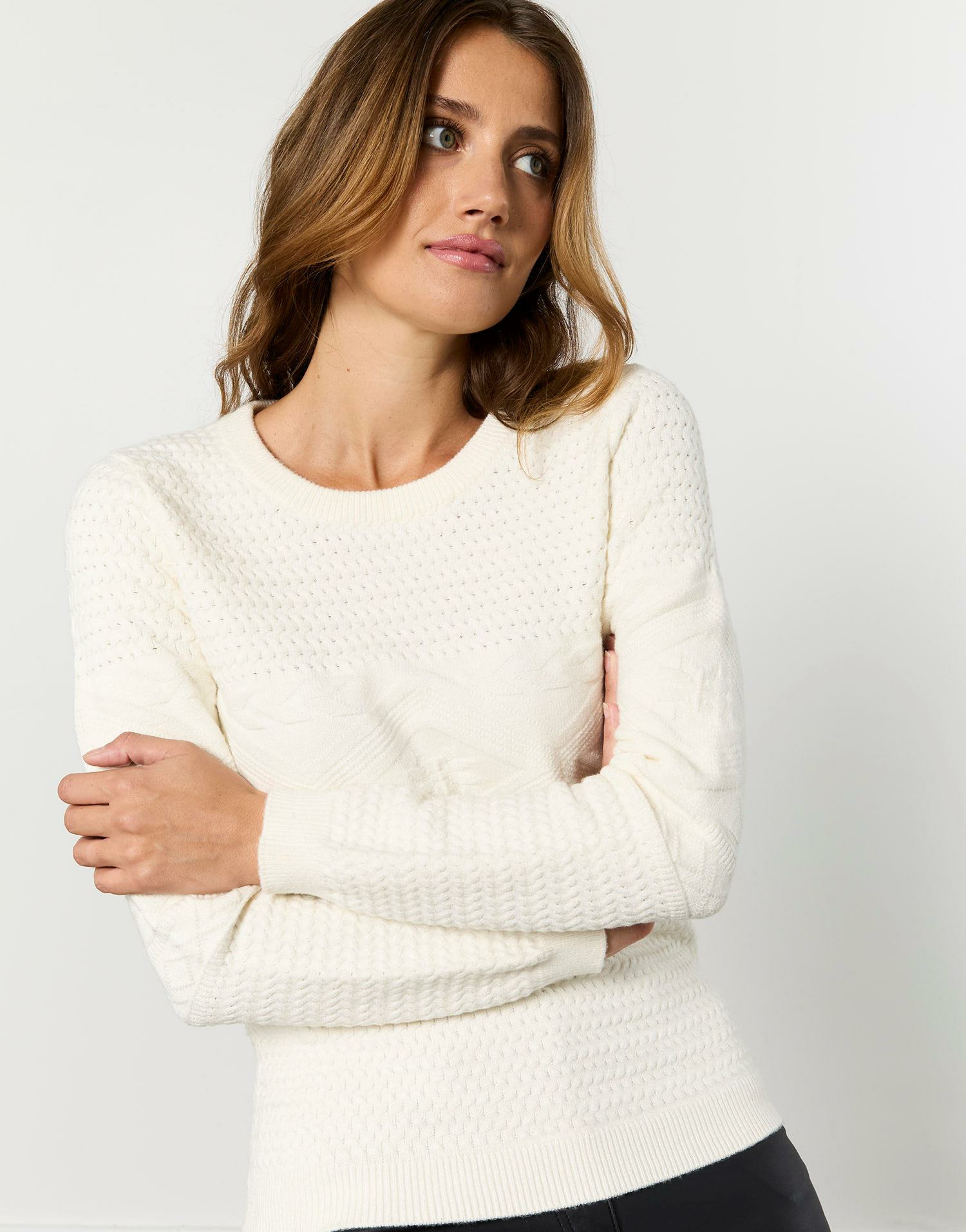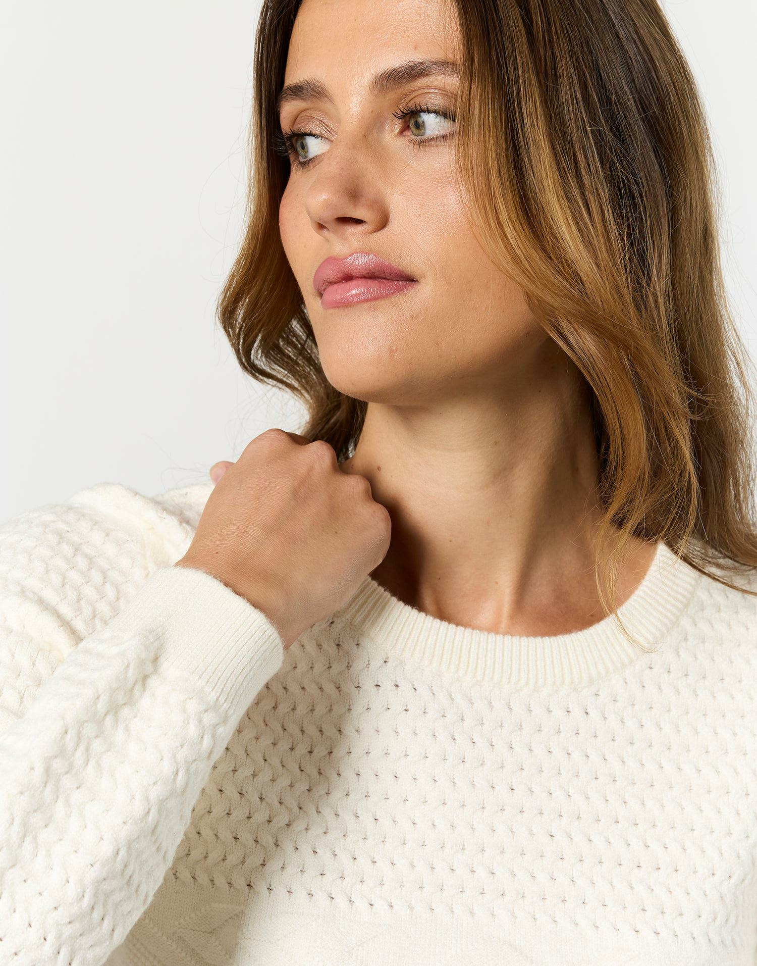 Matière épaisse et douce, maille torsadée fantaisie, couleur écru uni. Disponible en taille 01 portée par le mannequin mesurant 1m79. Coupe droite, manches longues, col rond classique.