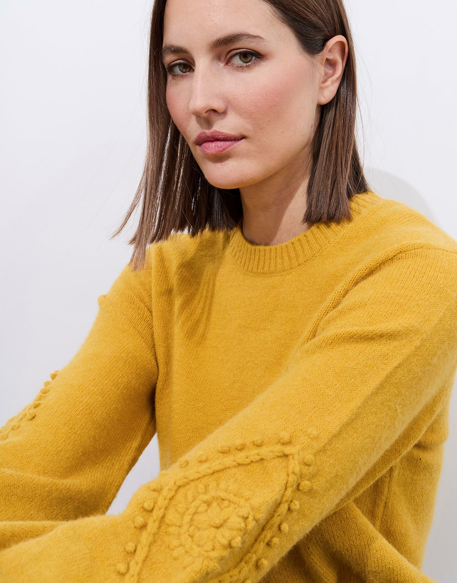 Mannequin mesurant 1m75 portant une taille 01. Pull épais uni à col rond, manches longues bouffantes avec broderies sur les manches. Couleur jaune.