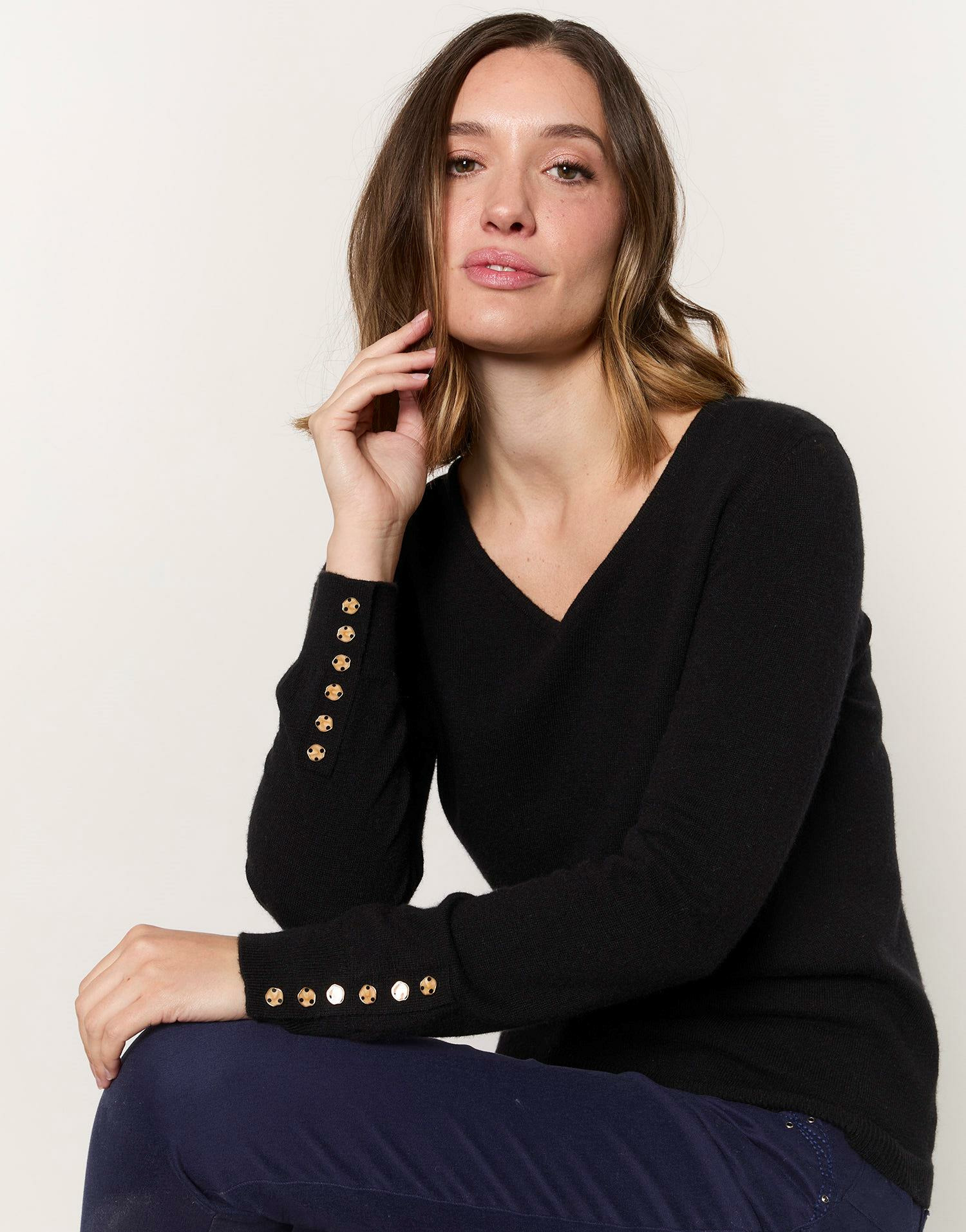 Composition et entretien : pull fin uni noir, contenant du cachemire pour une texture douce et légère. Boutons décoratifs au niveau des manches. Louna mesure 1m73 et porte une taille 01. Lavage recommandé à la main ou cycle délicat.