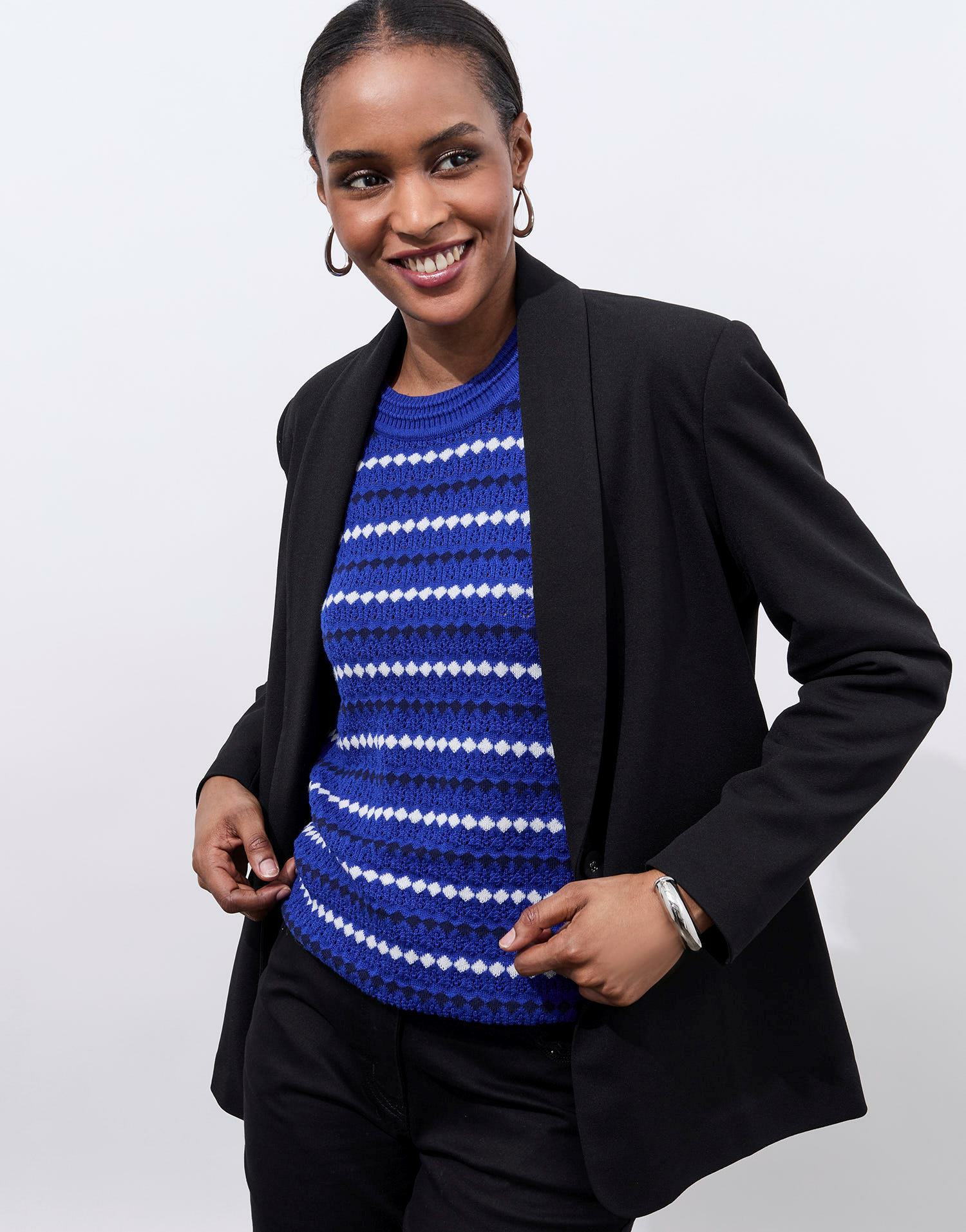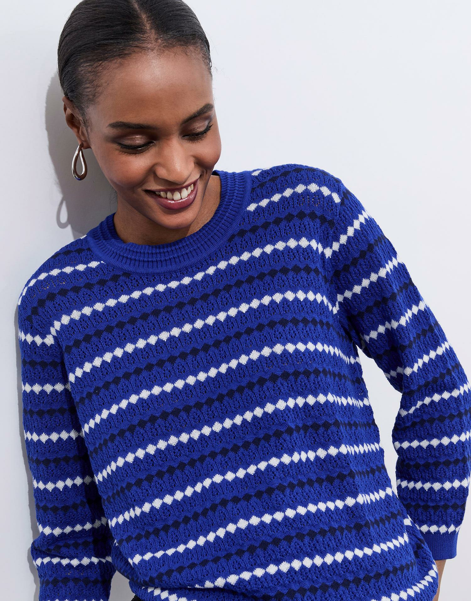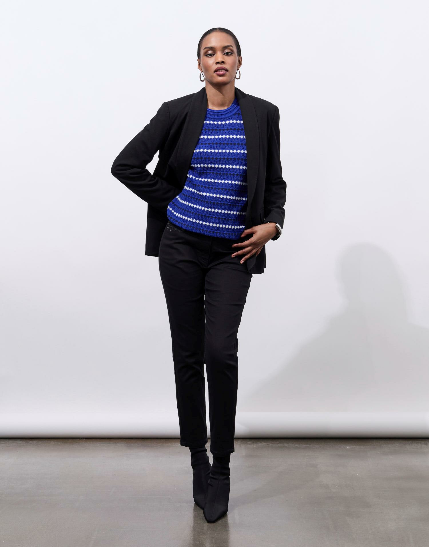 Matière : mélange coton. Coupe ajustée. Manches longues. Col arrondi. Motifs géométriques rayés. La mannequin mesure 1m75 et porte une taille 01.