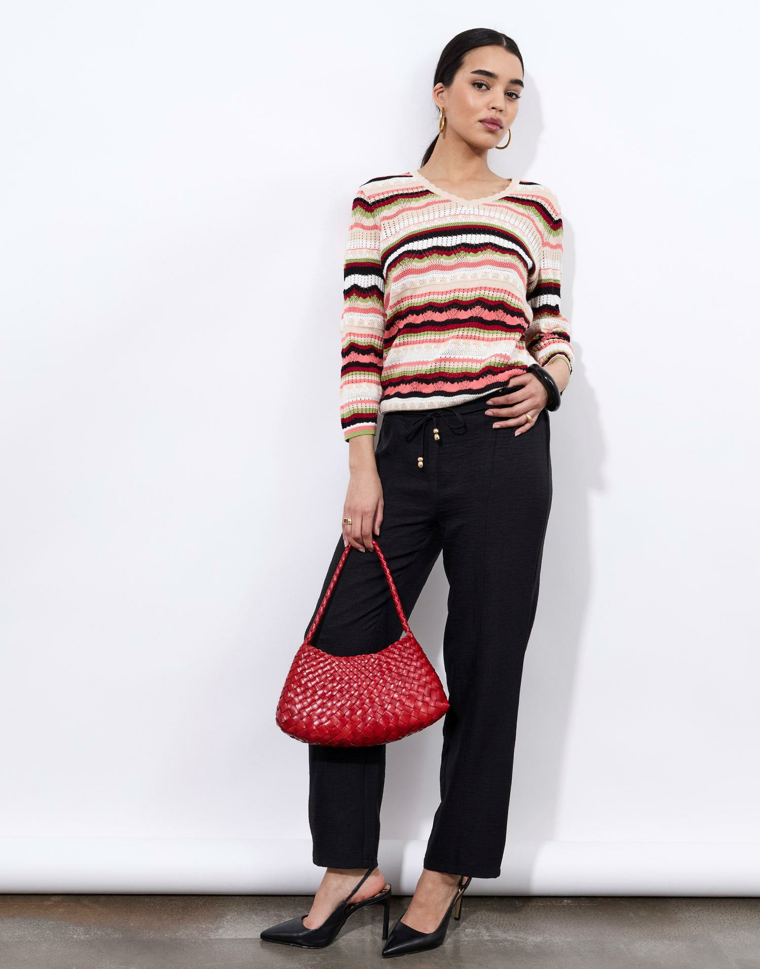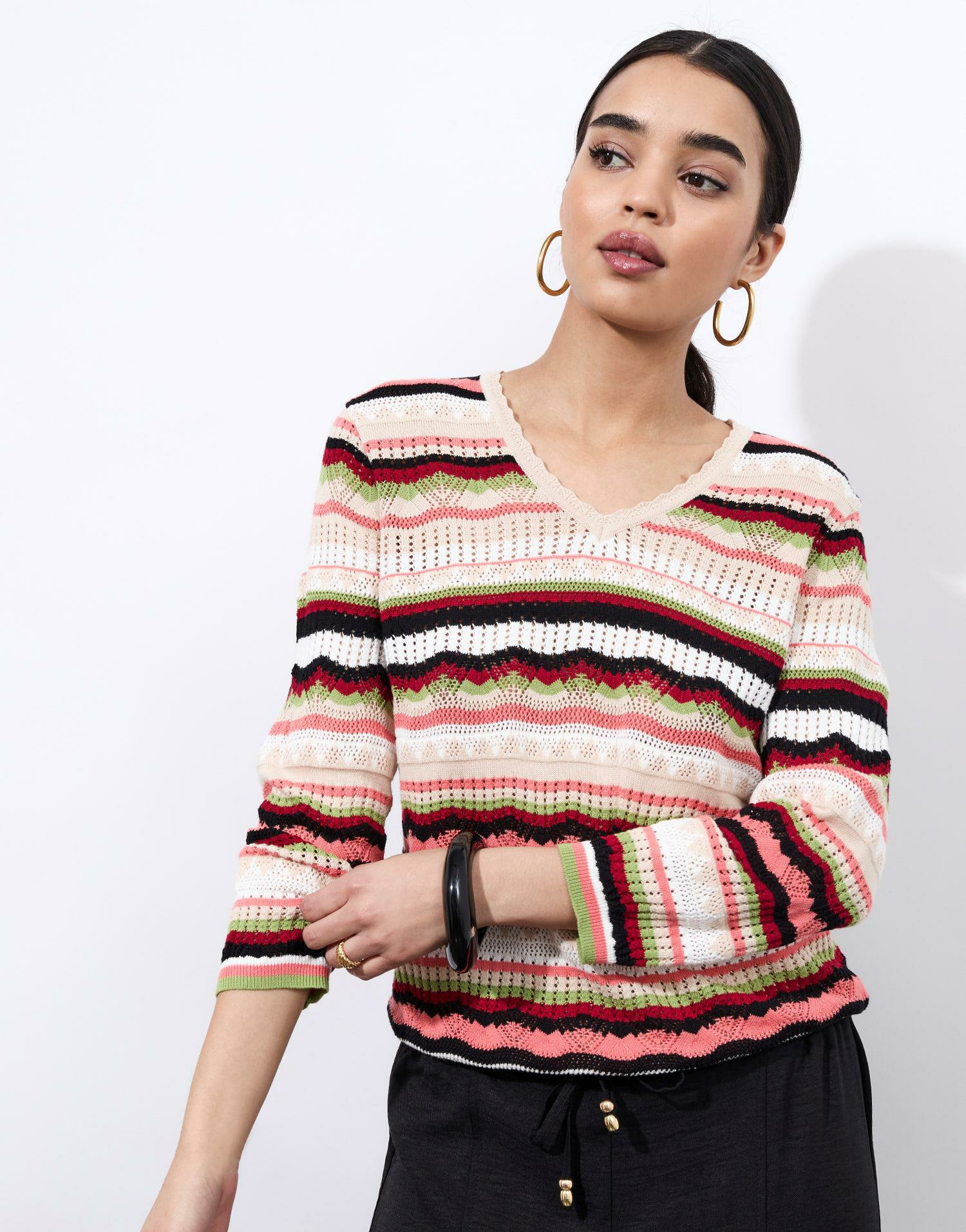 Pull en mélange coton, maille ajourée, encolure en V, rayures multicolores. Coupe confortable et légère. La mannequin mesure 1m75 et porte une taille 01.
