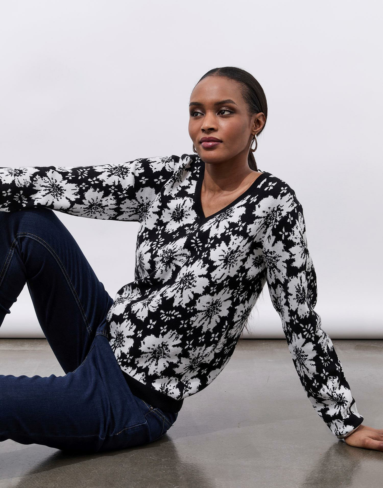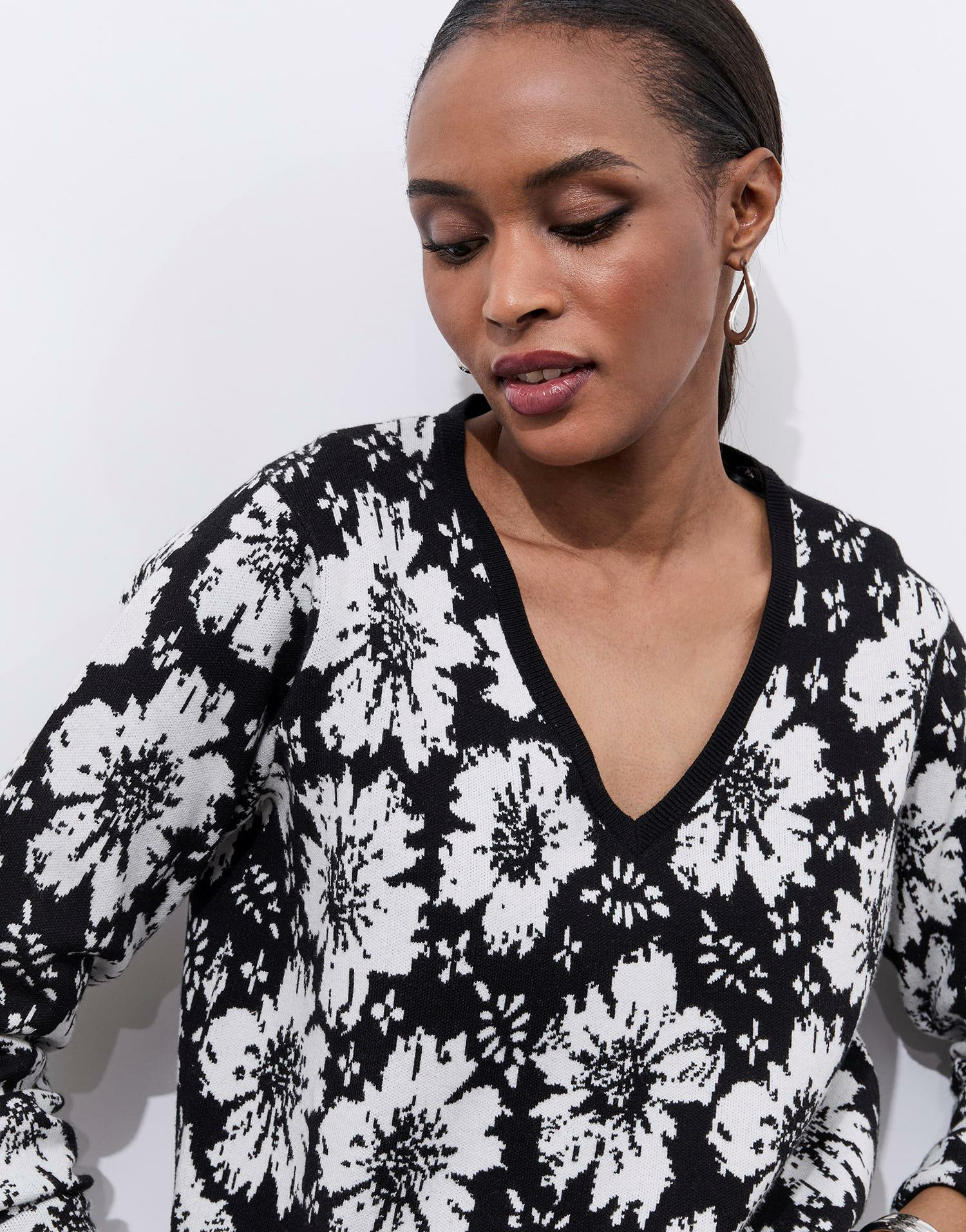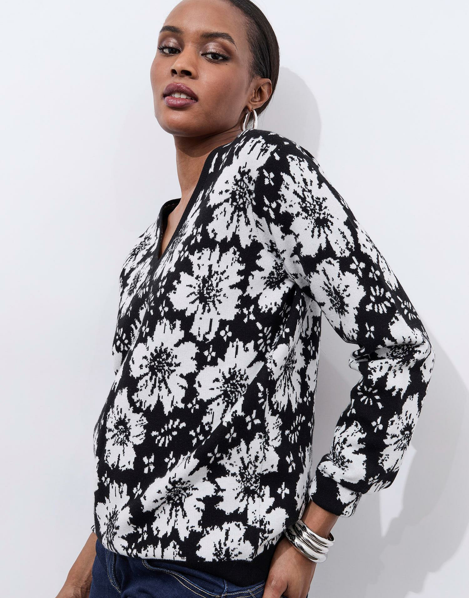 Confectionné avec soin par RIU Paris, ce pull associe un imprimé floral contrasté à une encolure en V flatteuse, soulignant délicatement le décolleté. Sa texture légère et agréable assure un confort optimal tout au long de la journée, tandis que son design épuré facilite les associations avec vos bas préférés, du jean aux jupes habillées.