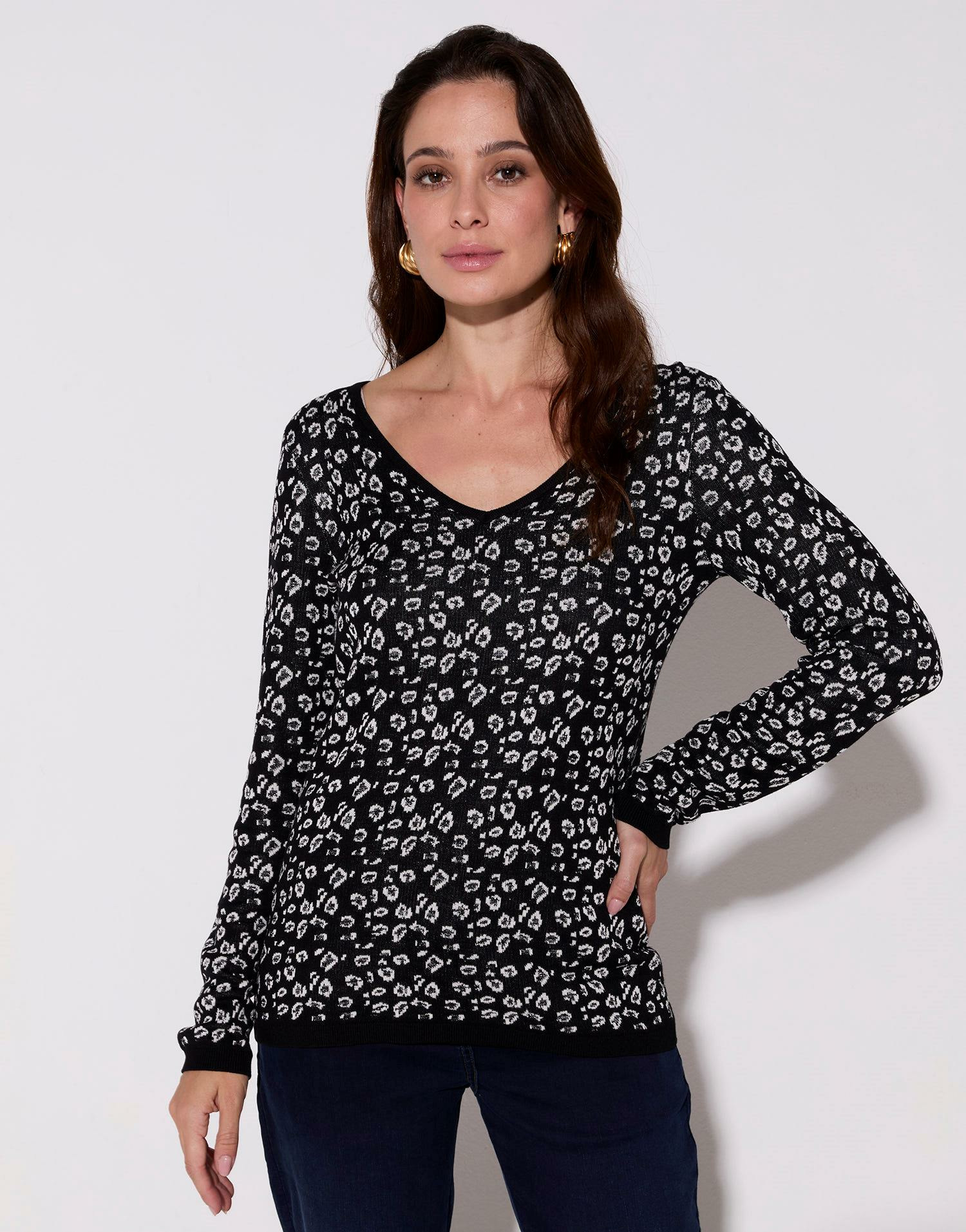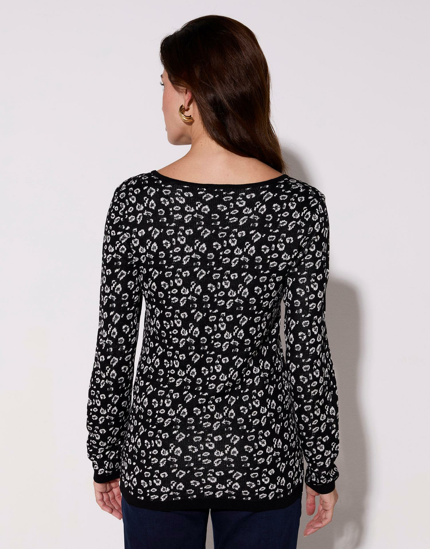 Adoptez l’élégance discrète avec ce pull fin jacquard noir, sublimé par un imprimé léopard délicat et des fils de lurex scintillants. Une pièce raffinée qui transforme instantanément votre look.