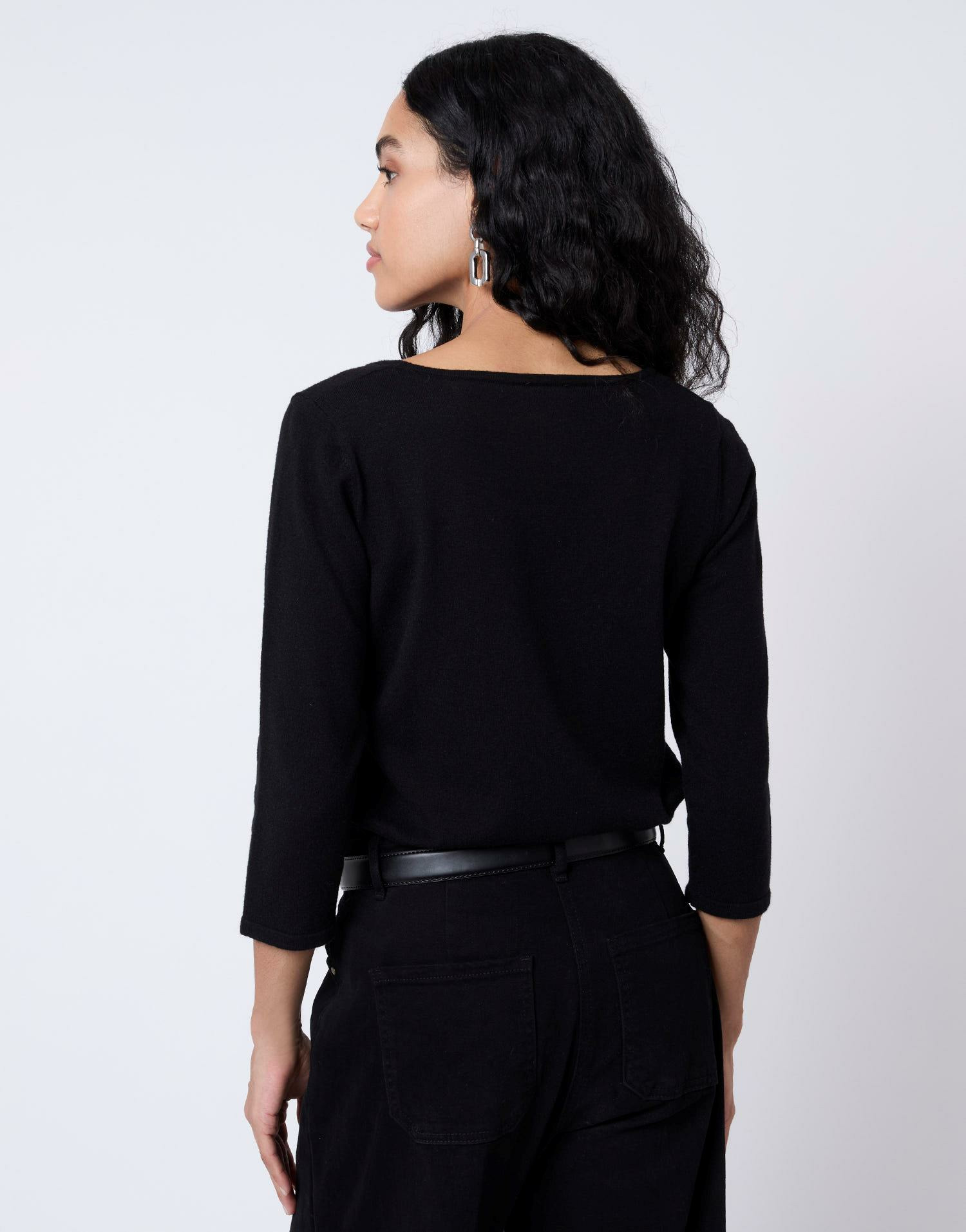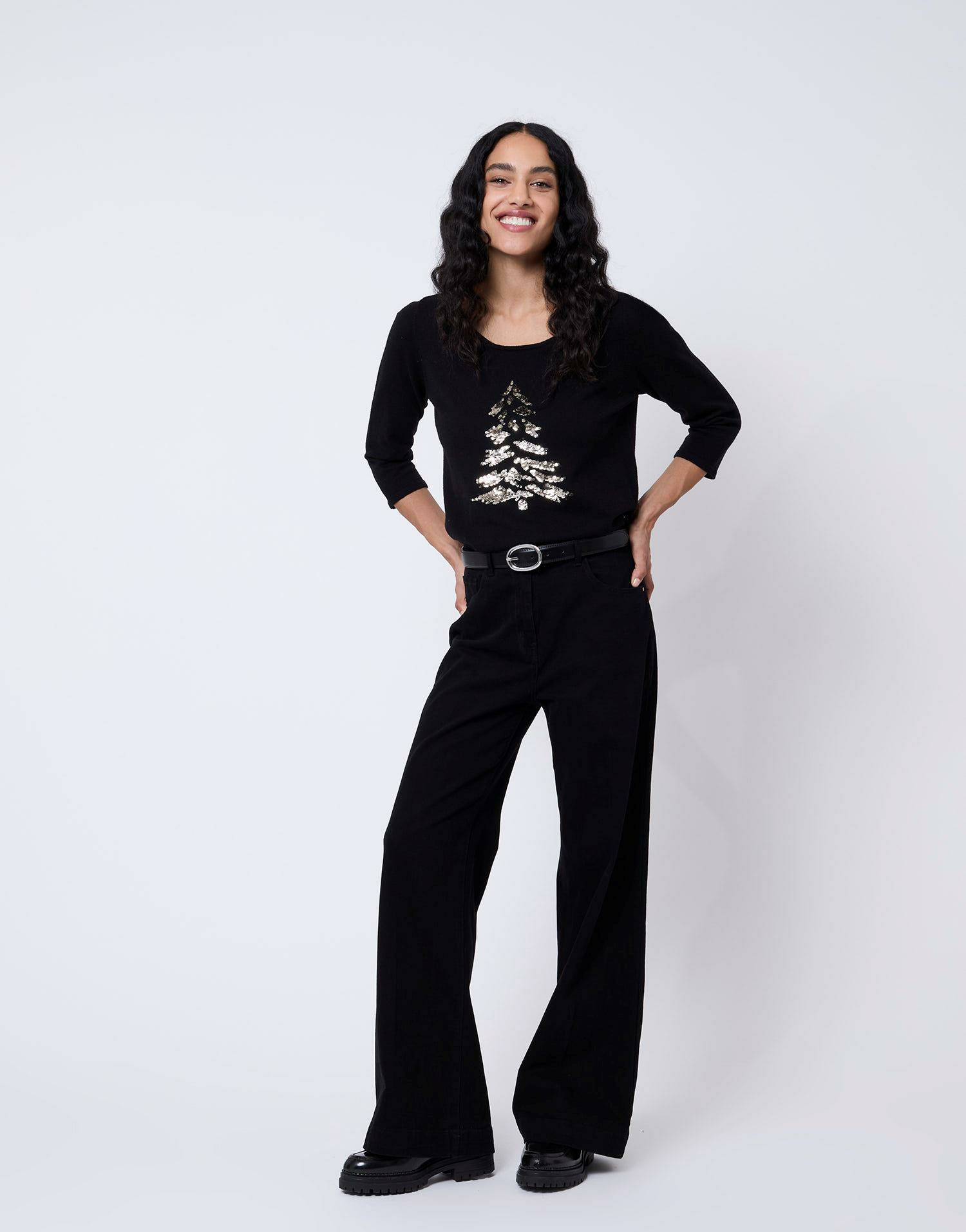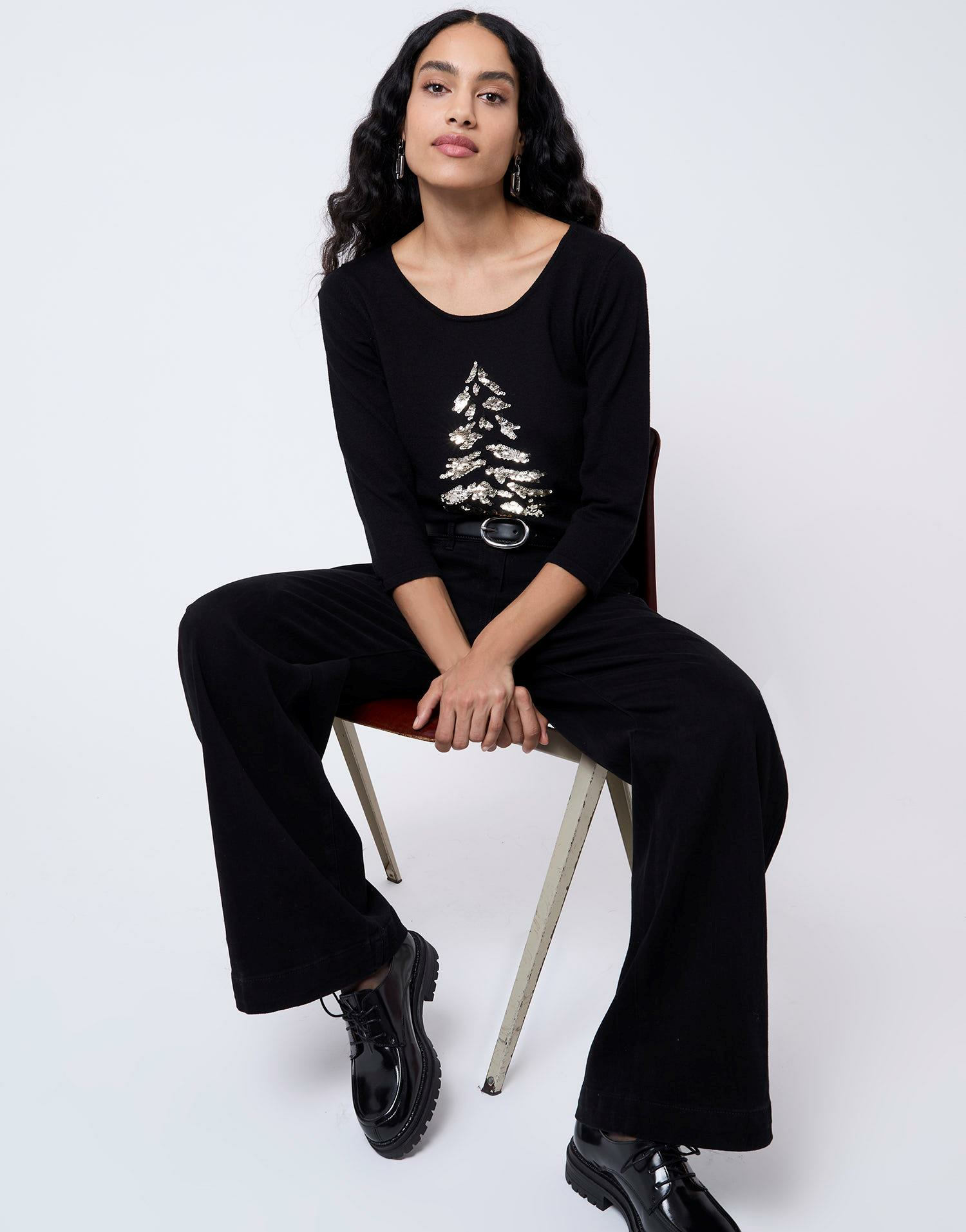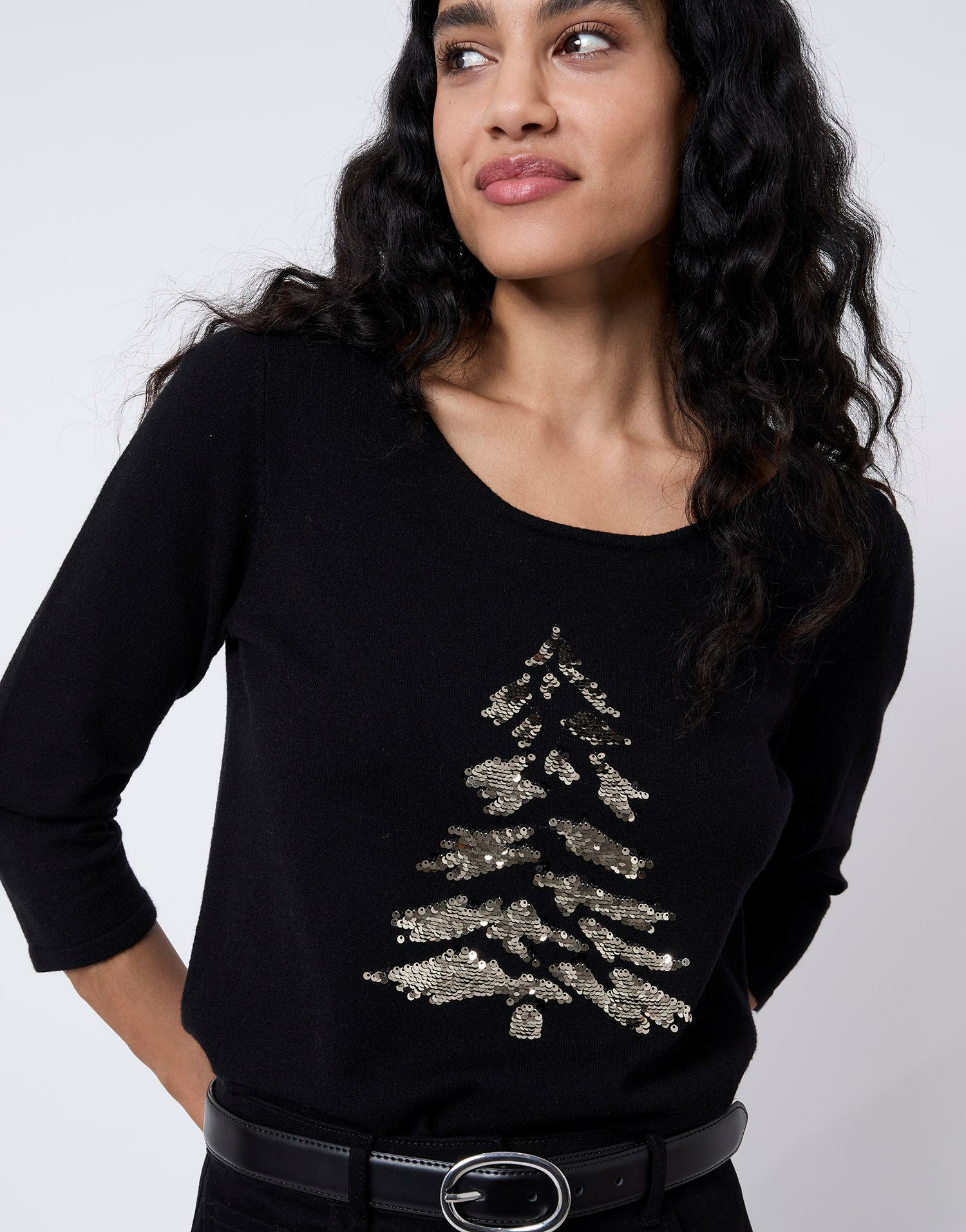 Matière fine et douce, encolure arrondie, manches 3/4. Motif sapin brodé de sequins. Couleur noire. La mannequin mesure 1m75 et porte une taille S.