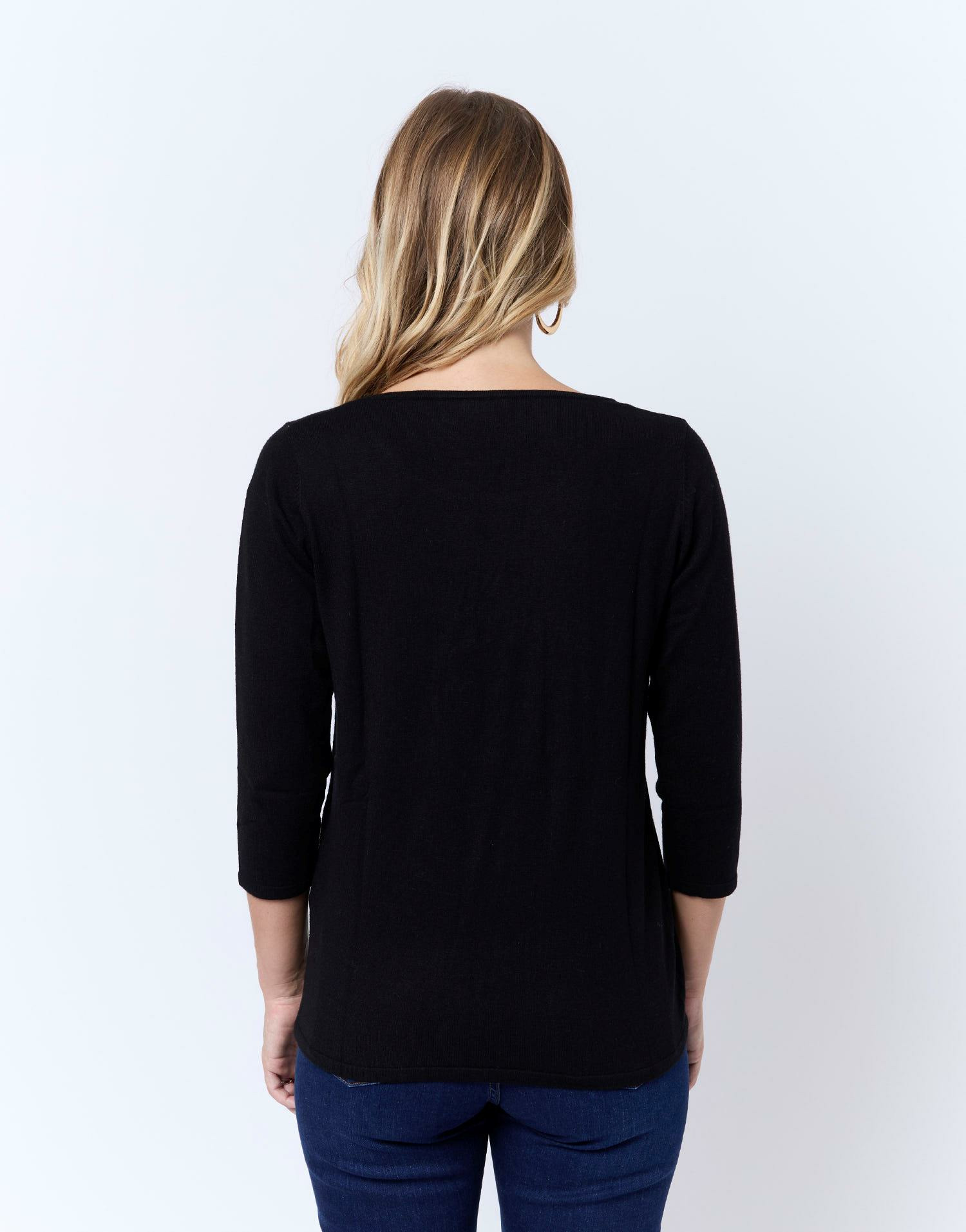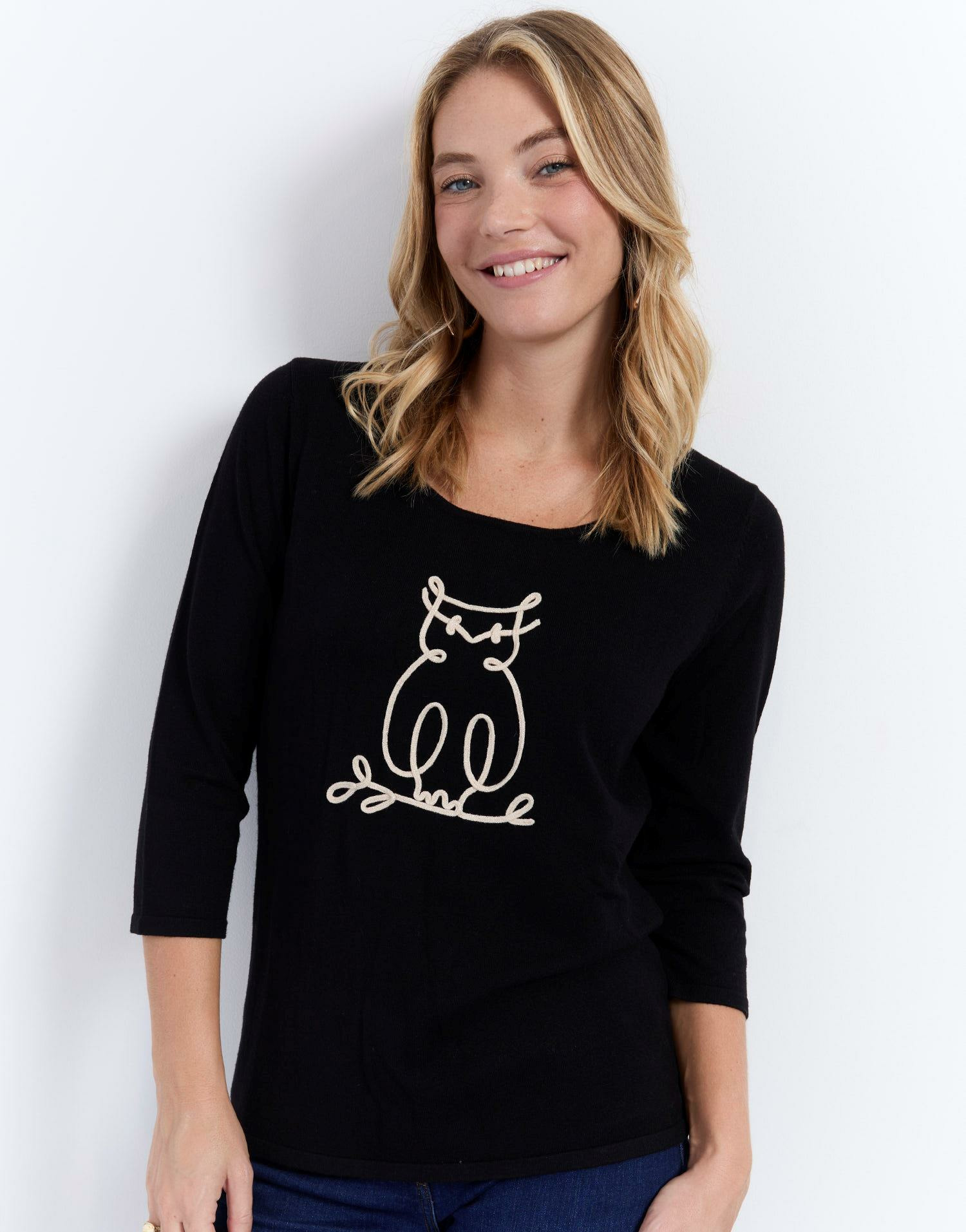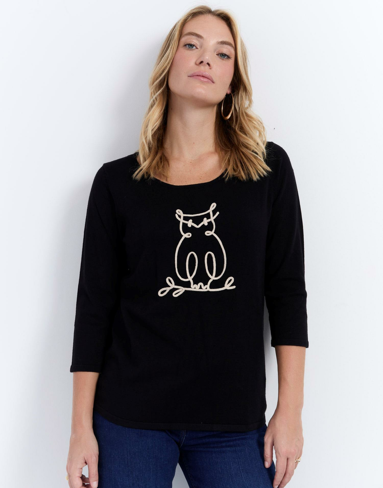 Composé d’une maille fine et douce, ce modèle présente une encolure arrondie, des manches trois-quarts et une broderie hibou avec applications. Disponible en taille M portée par le mannequin, il s’adapte à différentes morphologies grâce à sa coupe ajustée.