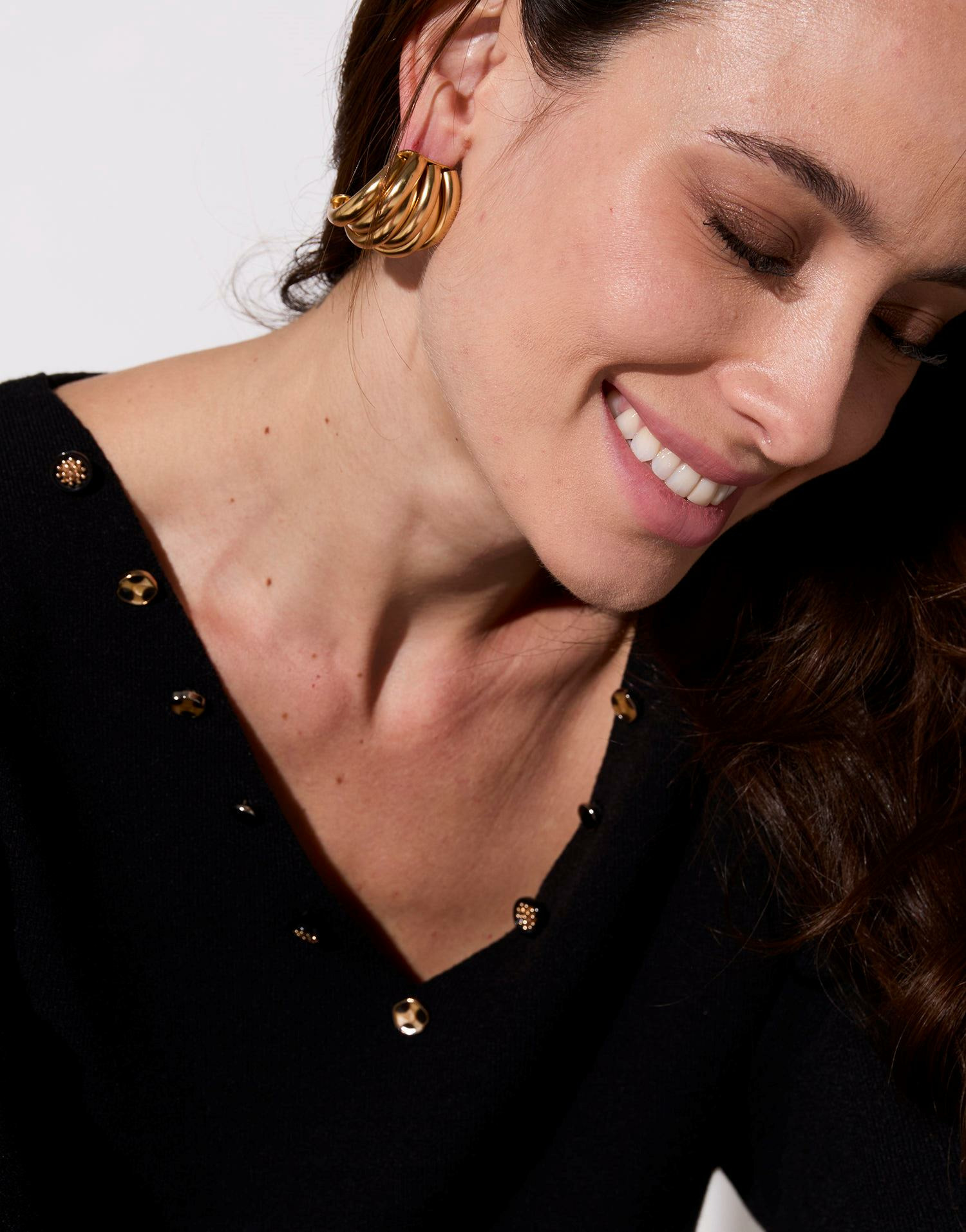 Ce pull fin uni noir est doté d’un col en V bordé de boutons décoratifs et de manches longues. Juliana, notre modèle, mesure 1m72 et porte une taille 01, illustrant parfaitement la coupe ample et fluide de ce vêtement.