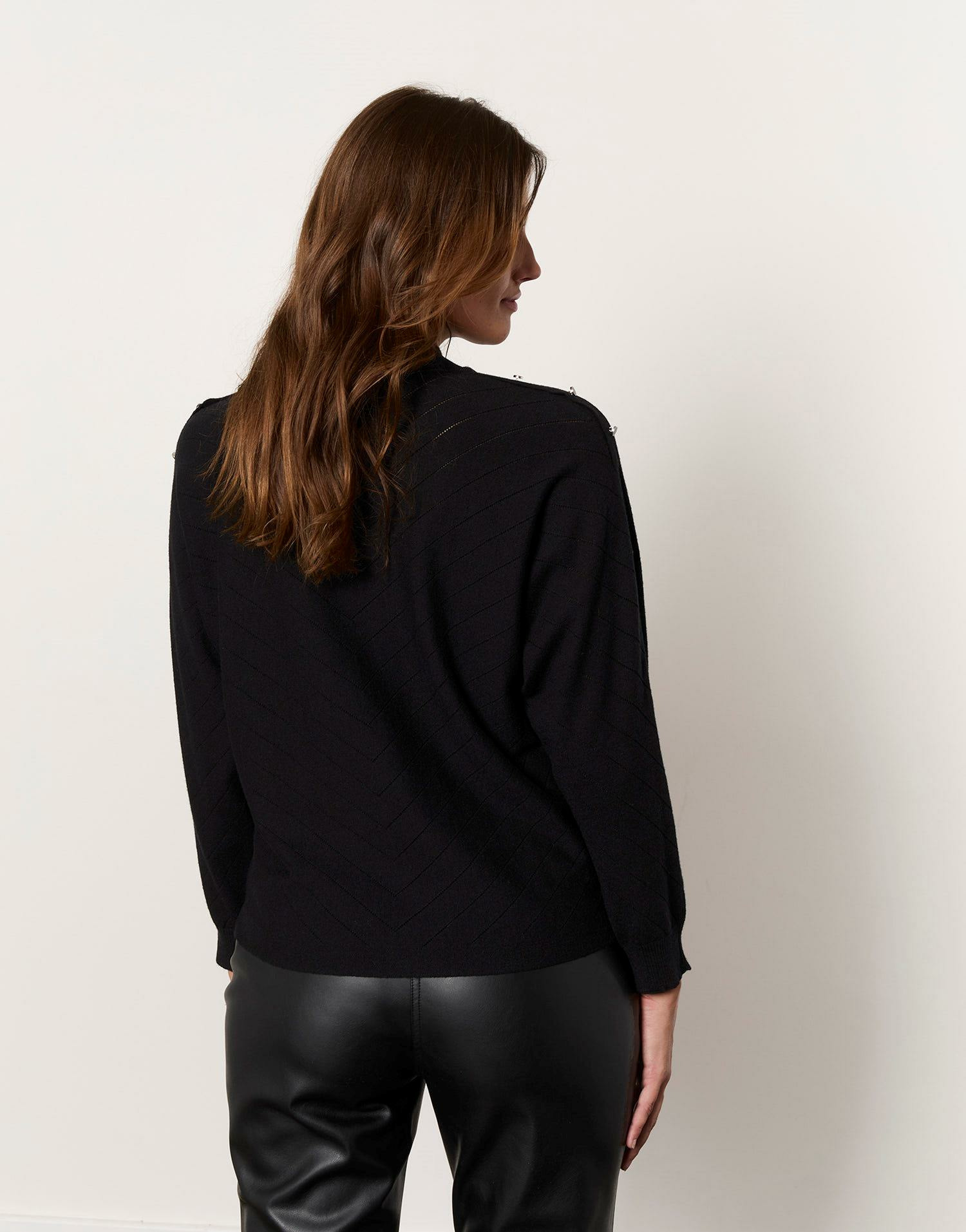 Pull fin uni noir à col montant, manches chauves-souris, boutons décoratifs sur l’épaule. Matière légère et douce. Longueur standard. Armelle mesure 1m79 et porte une taille 01.