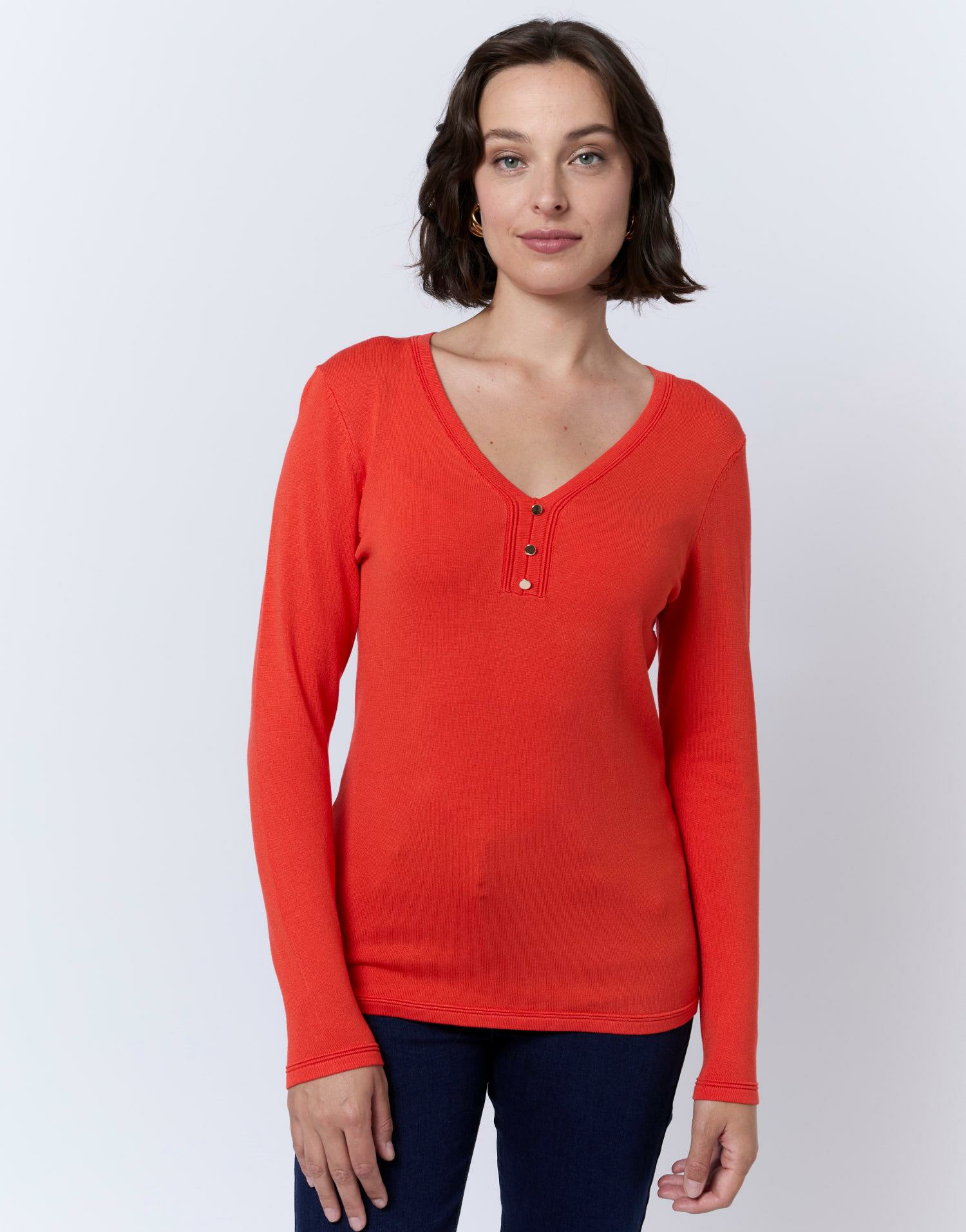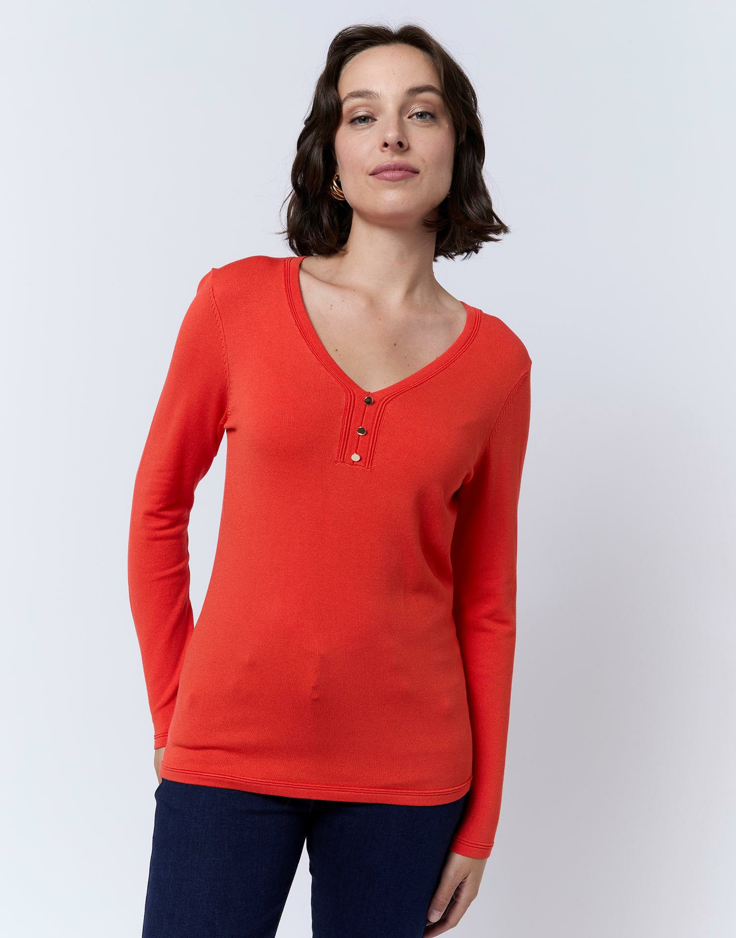 Ce pull fin uni orange incarne l’élégance minimaliste avec une touche de modernité. Sa coupe ajustée et son col V boutonné révèlent une silhouette féminine et raffinée.
