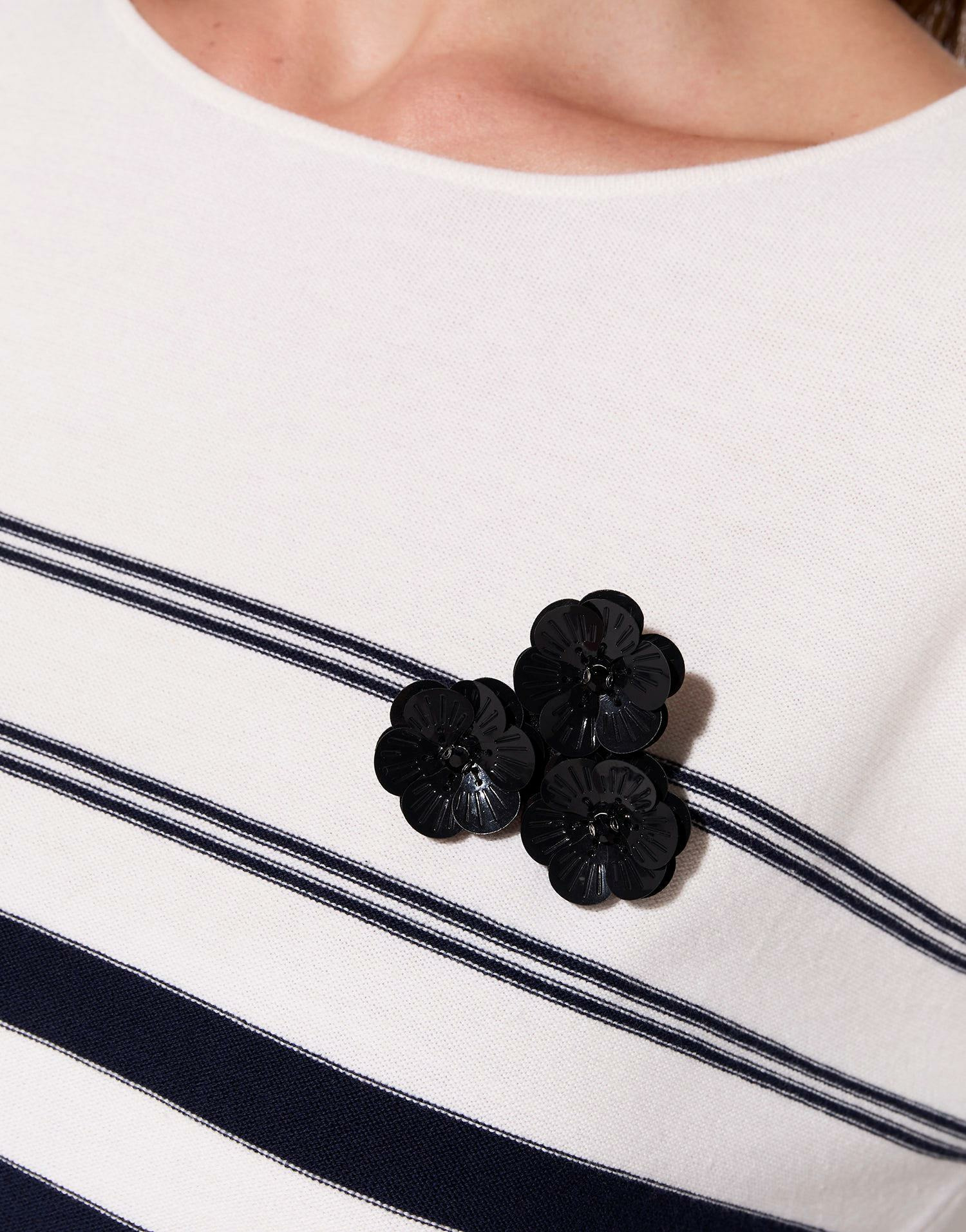Confectionné dans un coton doux et respirant, ce pull marinière allie confort et sophistication. Son encolure arrondie souligne délicatement le port de tête tandis que ses rayures blanches apportent une touche fraîche et lumineuse à votre tenue. La broche amovible offre une personnalisation subtile, vous permettant de varier les looks selon vos envies, du plus décontracté au plus chic.