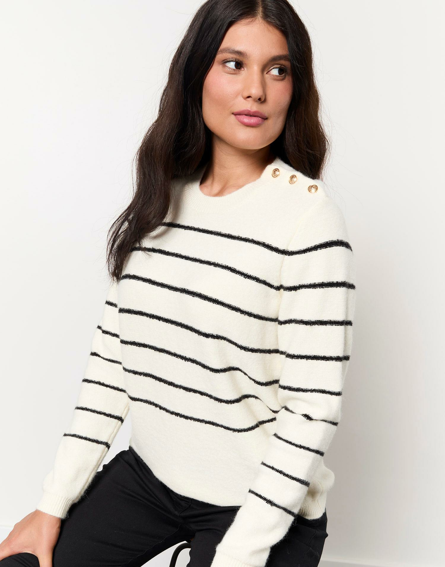 Pull marinière rayé blanc pour femme, encolure arrondie, boutons dorés sur l’épaule, coupe classique. Louna mesure 1m73 et porte une taille 01.