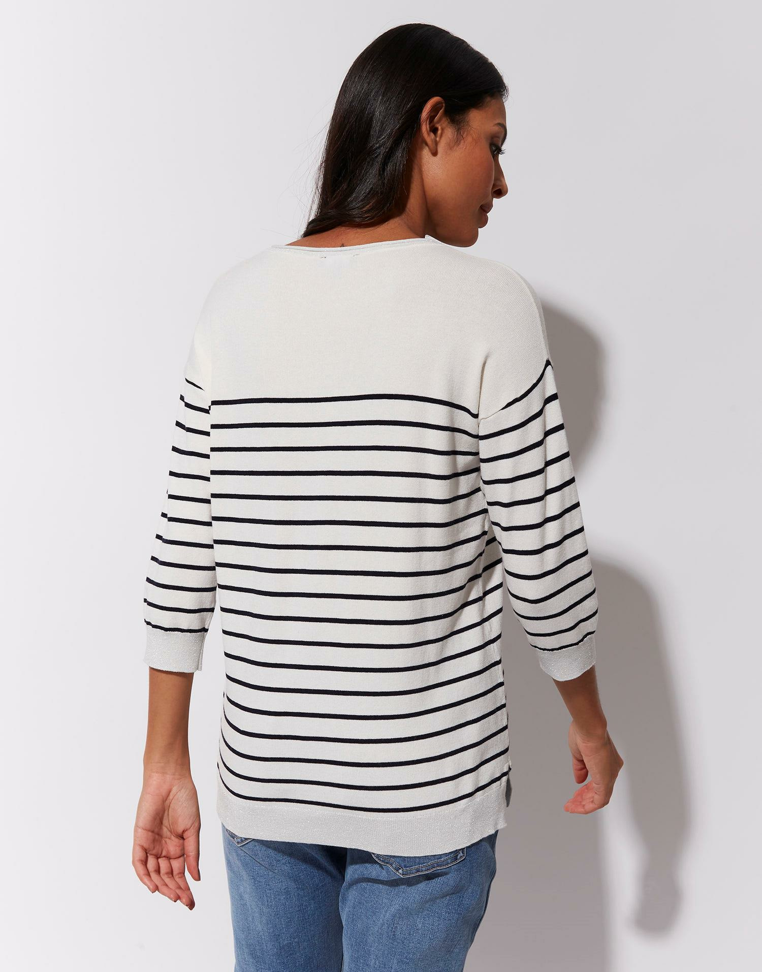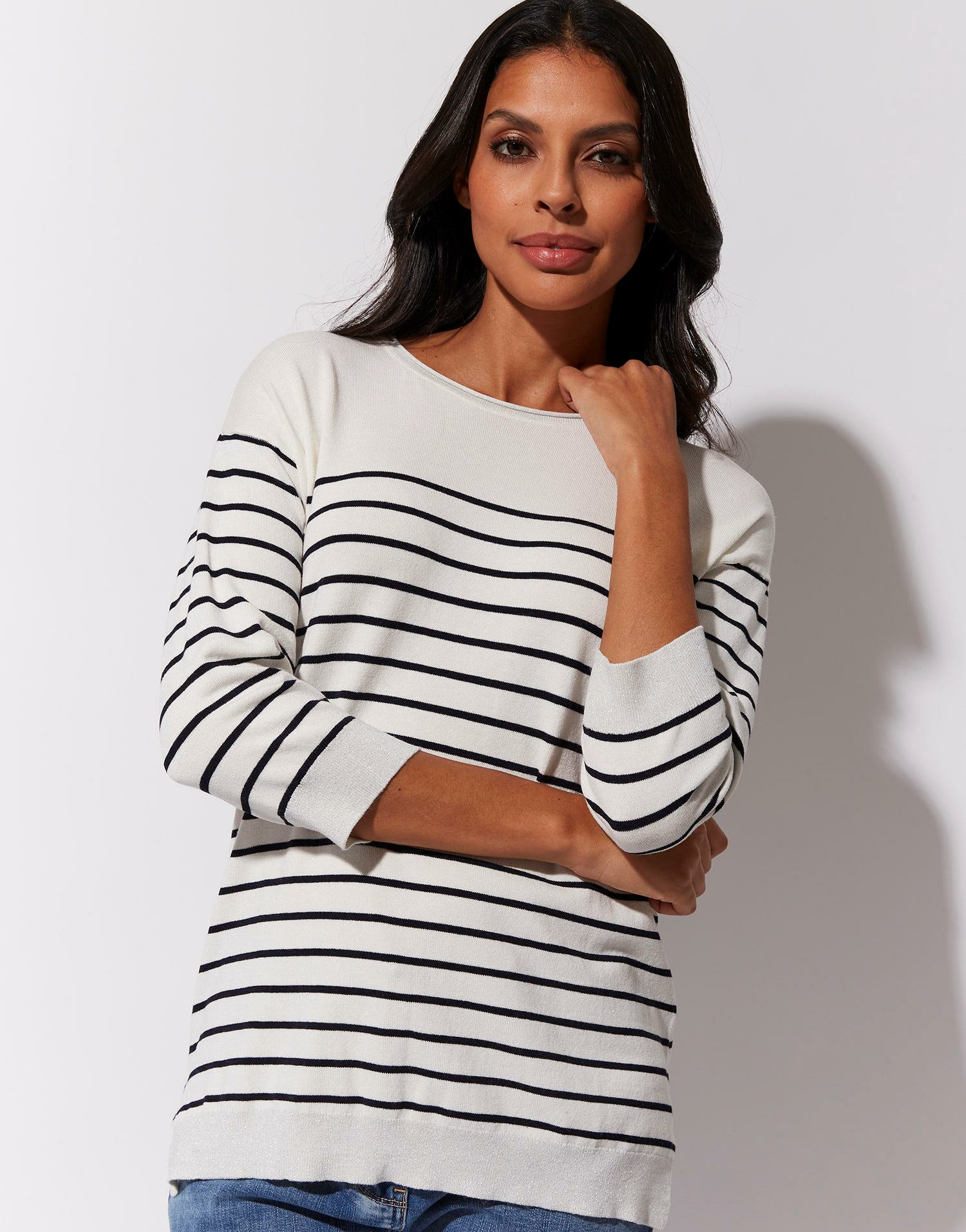 Ce pull marinière se distingue par ses rayures blanches et ses bordures en lurex, qui apportent un éclat subtil et raffiné à votre tenue. Son encolure arrondie et ses manches longueur coude offrent une silhouette féminine et confortable, parfaite pour un look marin chic et décontracté. Léger et agréable à porter, il s’adapte aussi bien aux journées fraîches qu’aux soirées douces.