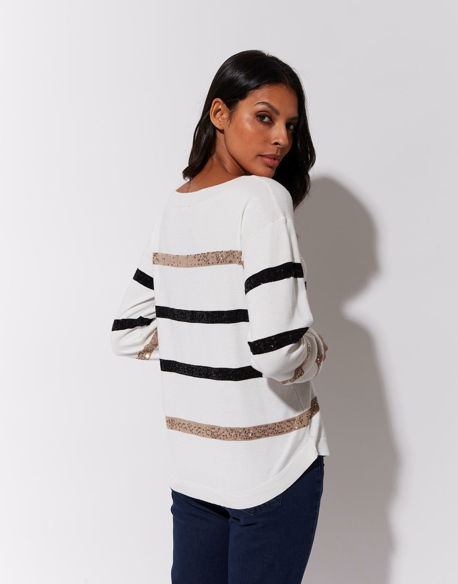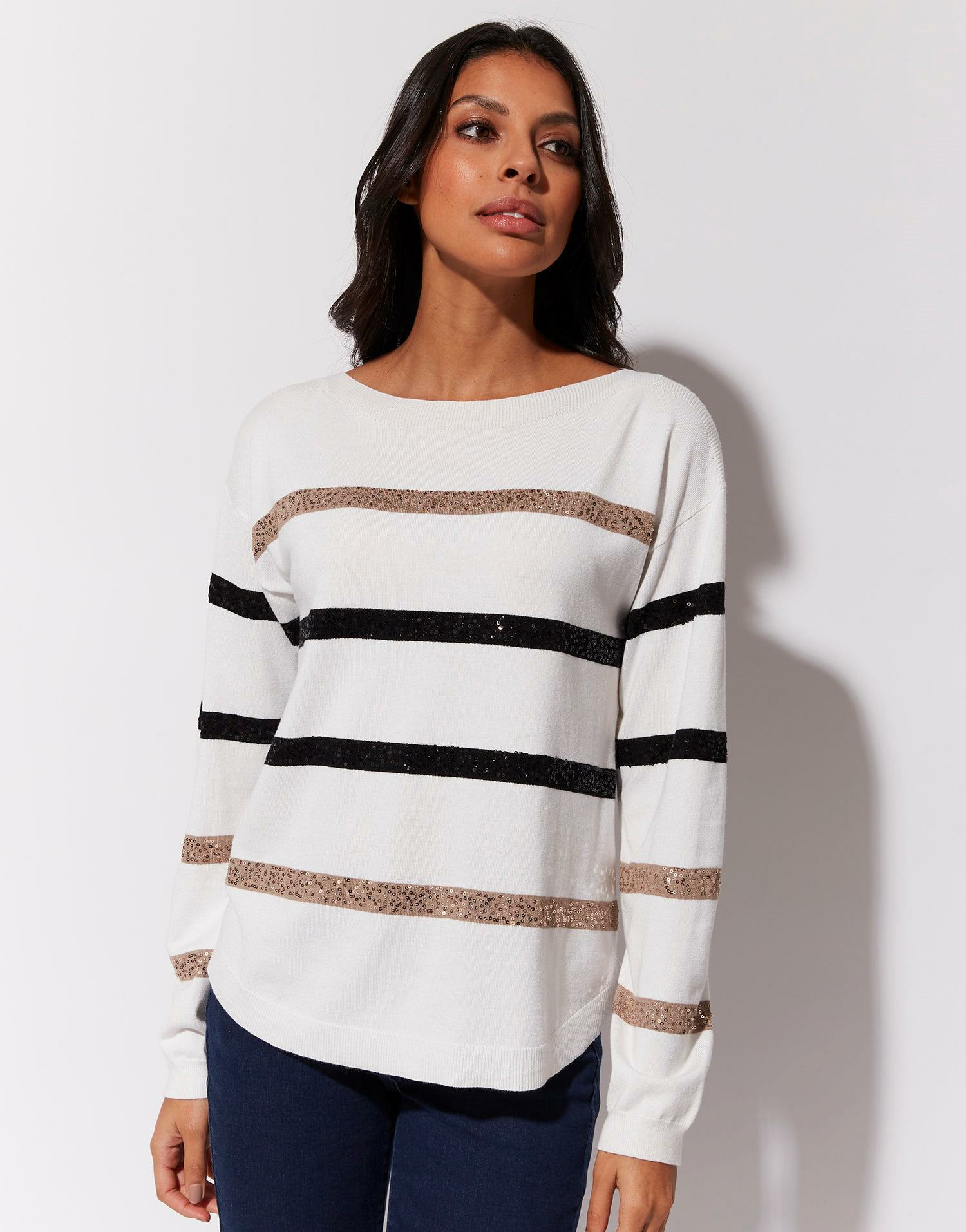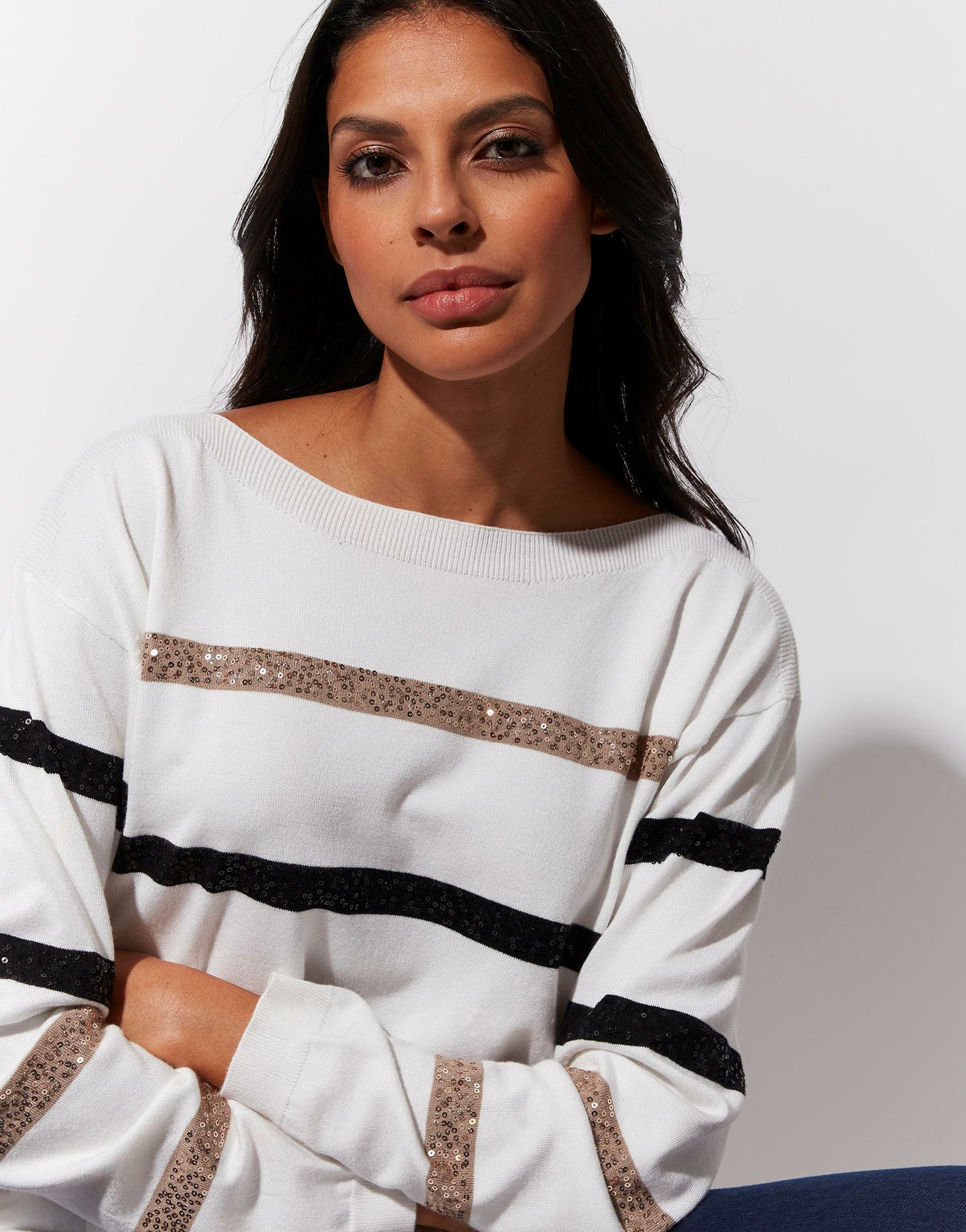 Adoptez l’élégance intemporelle de la marinière revisitée avec une touche de modernité. Ce pull rayé ECRU signé RIU Paris illumine votre silhouette avec ses sequins subtils et son encolure bateau raffinée.