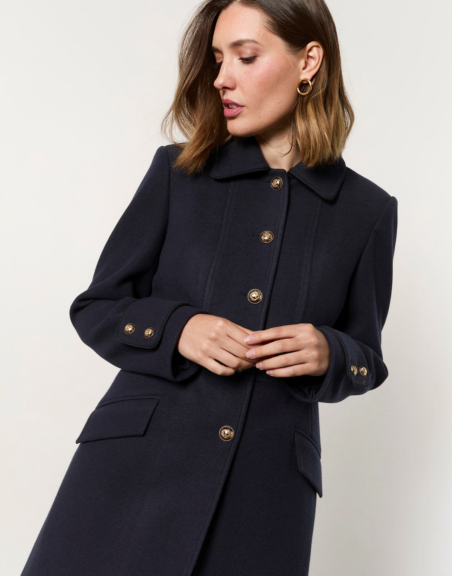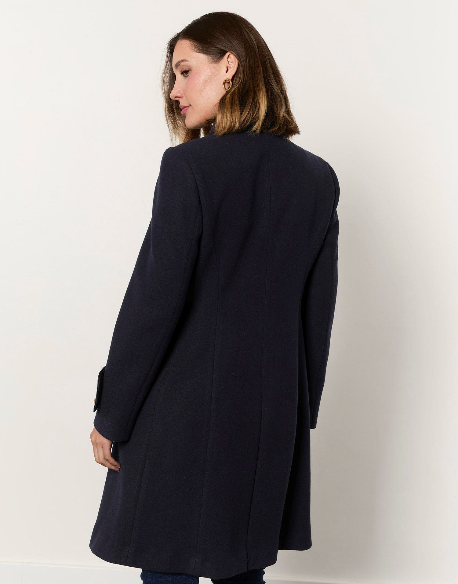 Affirmez votre style avec cette redingote mi-longue marine, alliant élégance intemporelle et modernité. Une pièce essentielle pour sublimer toutes vos tenues, du bureau aux sorties urbaines.