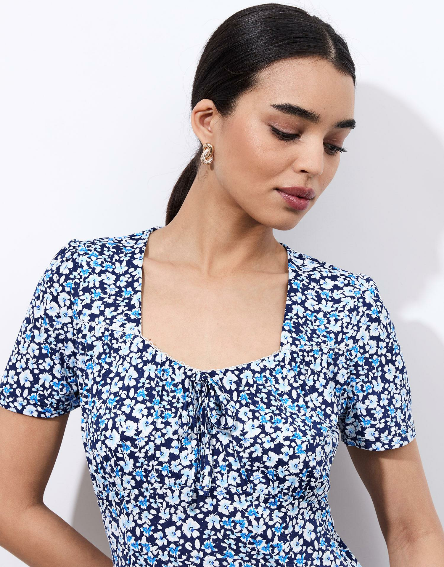 Robe courte à imprimé floral, encolure carrée avec lien à nouer, coupe légèrement évasée, manches courtes. La mannequin mesure 1m75 et porte une taille 38.