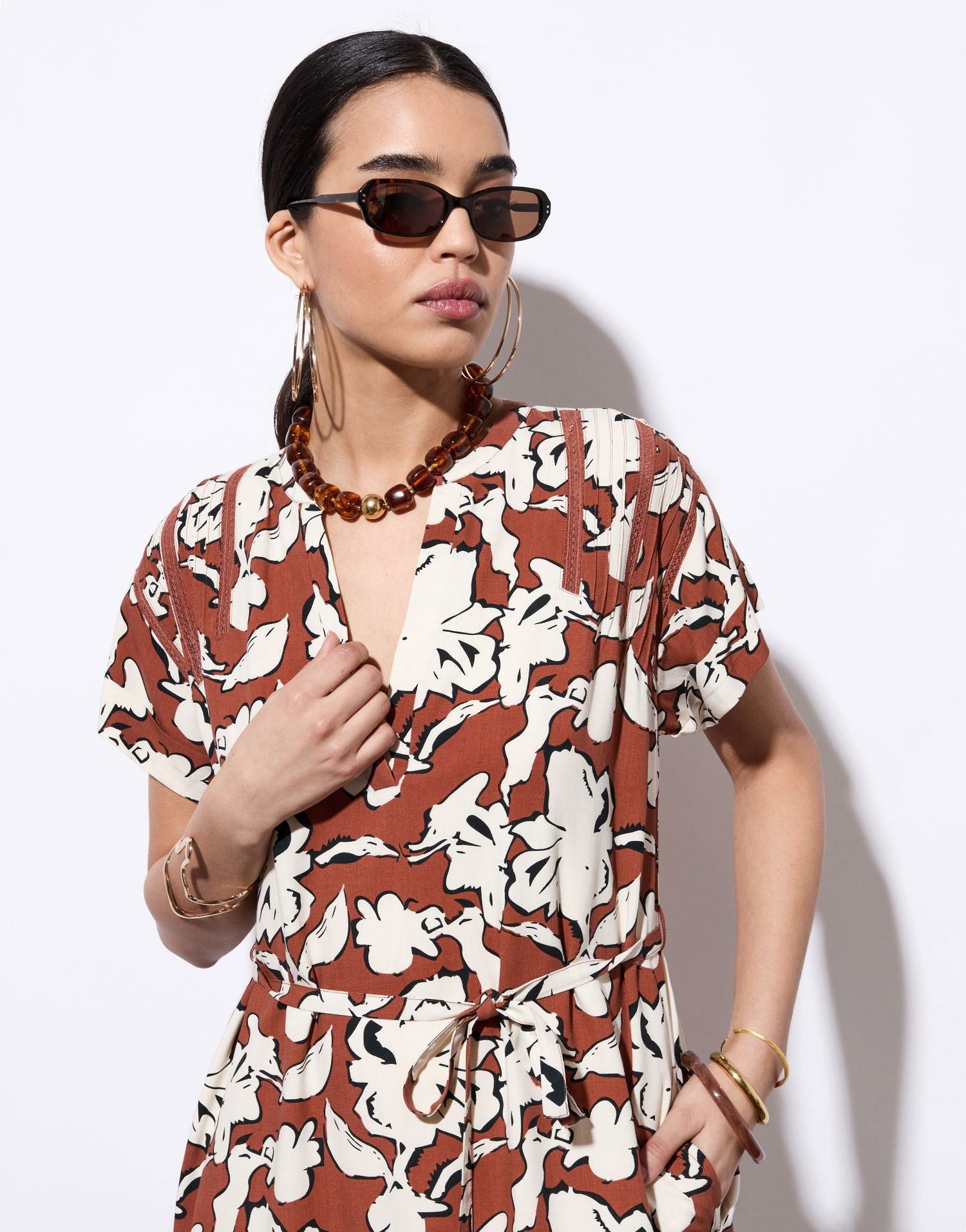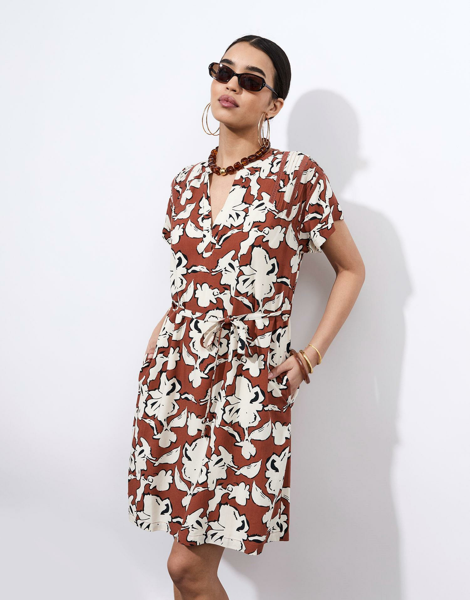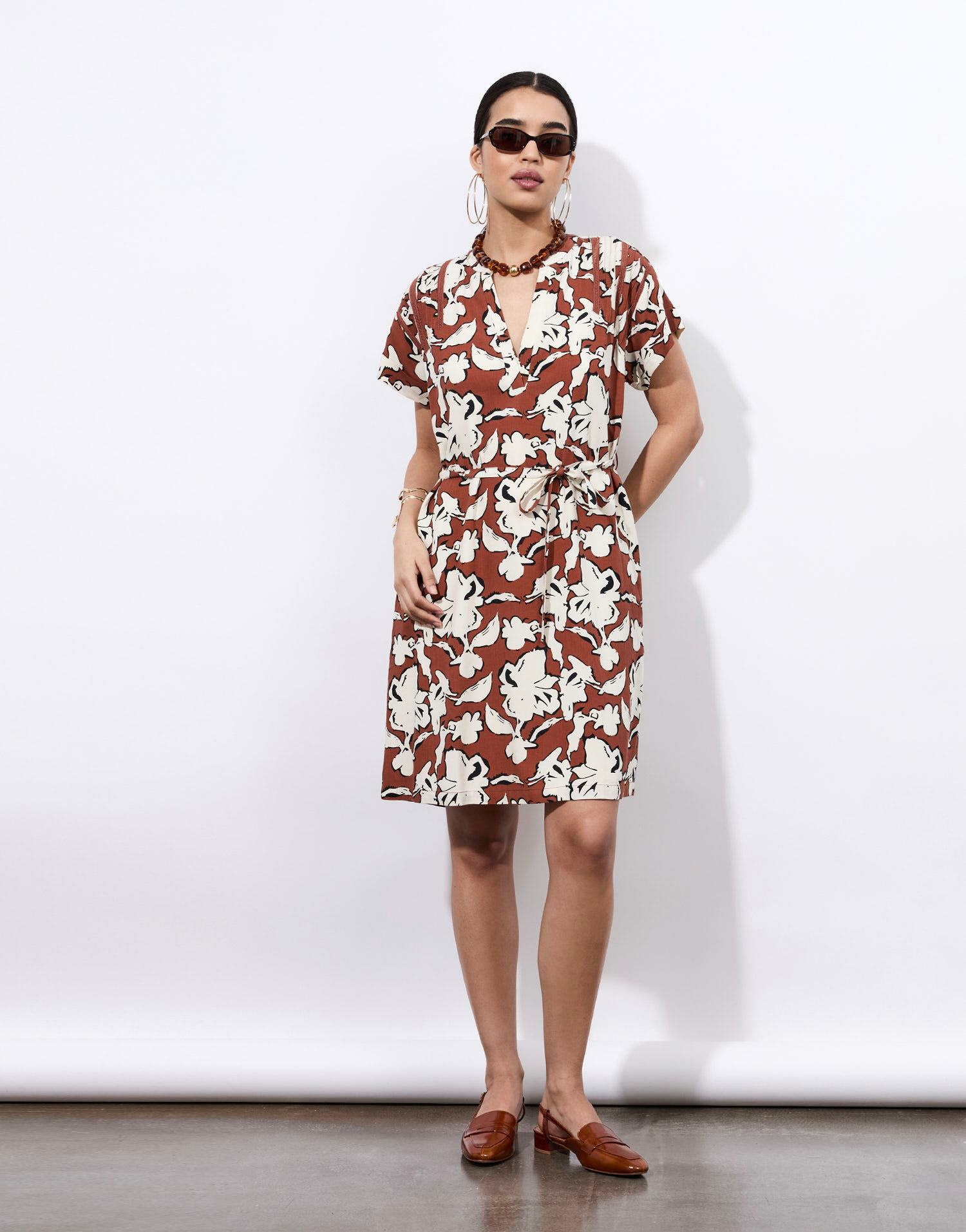 Robe courte imprimée à fleurs marron avec encolure en V, manches courtes et lien à nouer à la taille. Coupe fluide pour un confort optimal. La mannequin mesure 1m75 et porte une taille S. Marque RIU Paris.