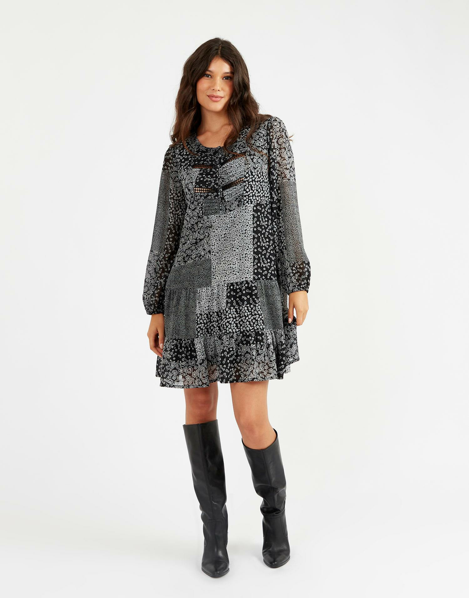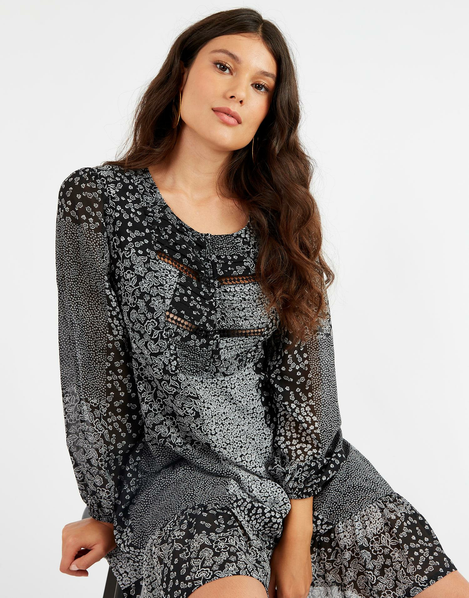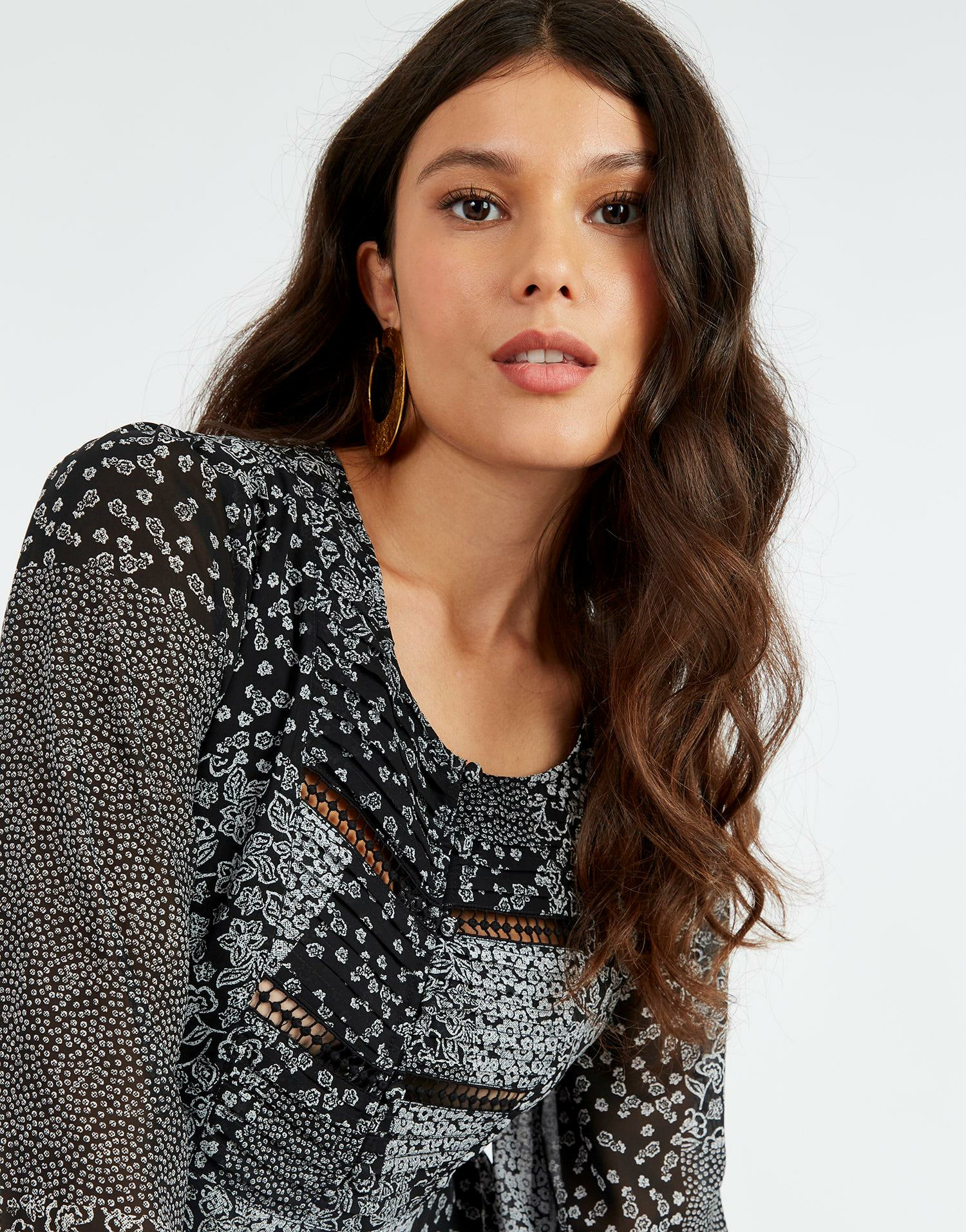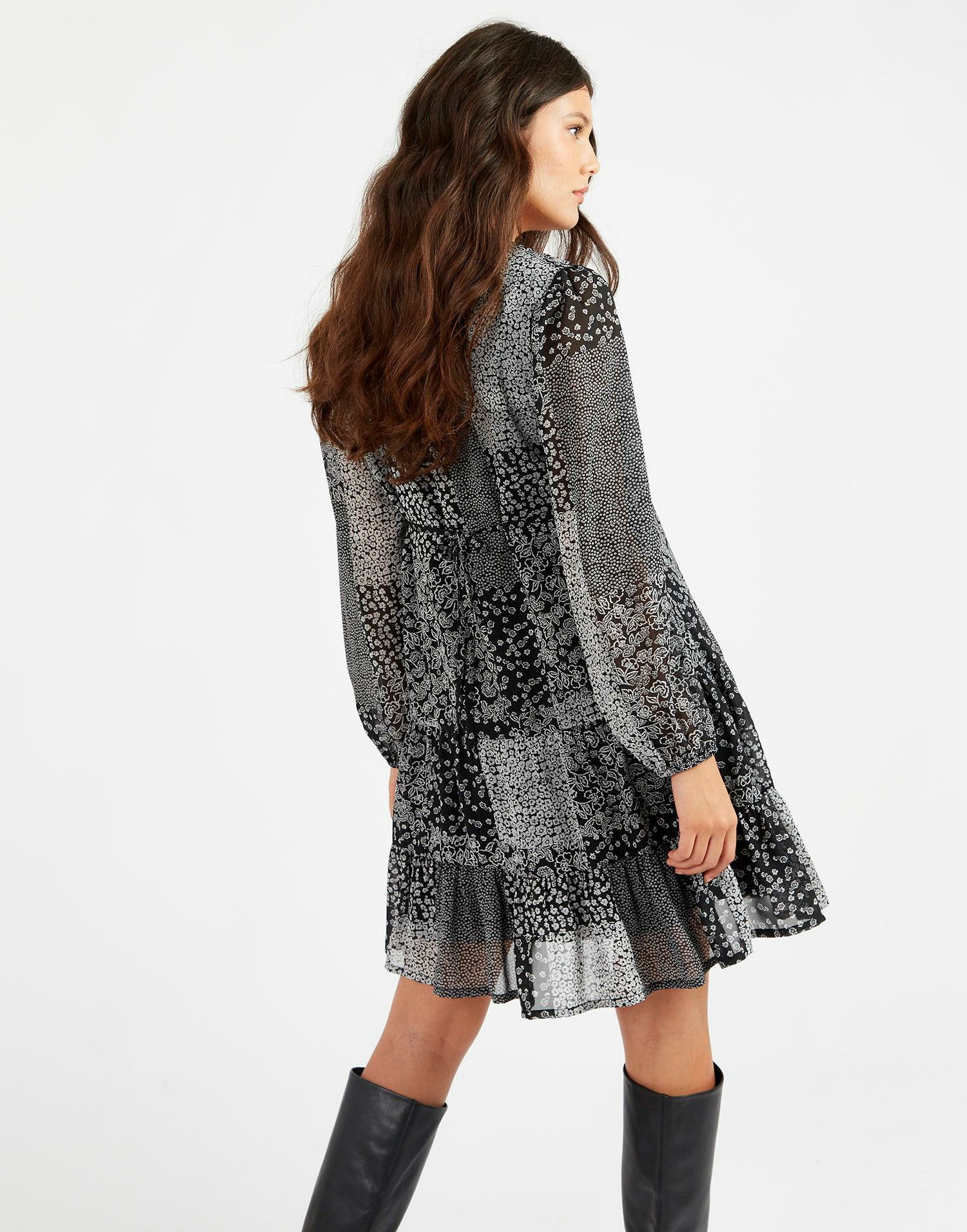 Robe courte imprimée noire effet patchwork avec détail ajouré sur la poitrine. Manches longues resserrées par élastiques. Fermeture par boutons sur le devant. Louna mesure 1m73 et porte une taille 38.