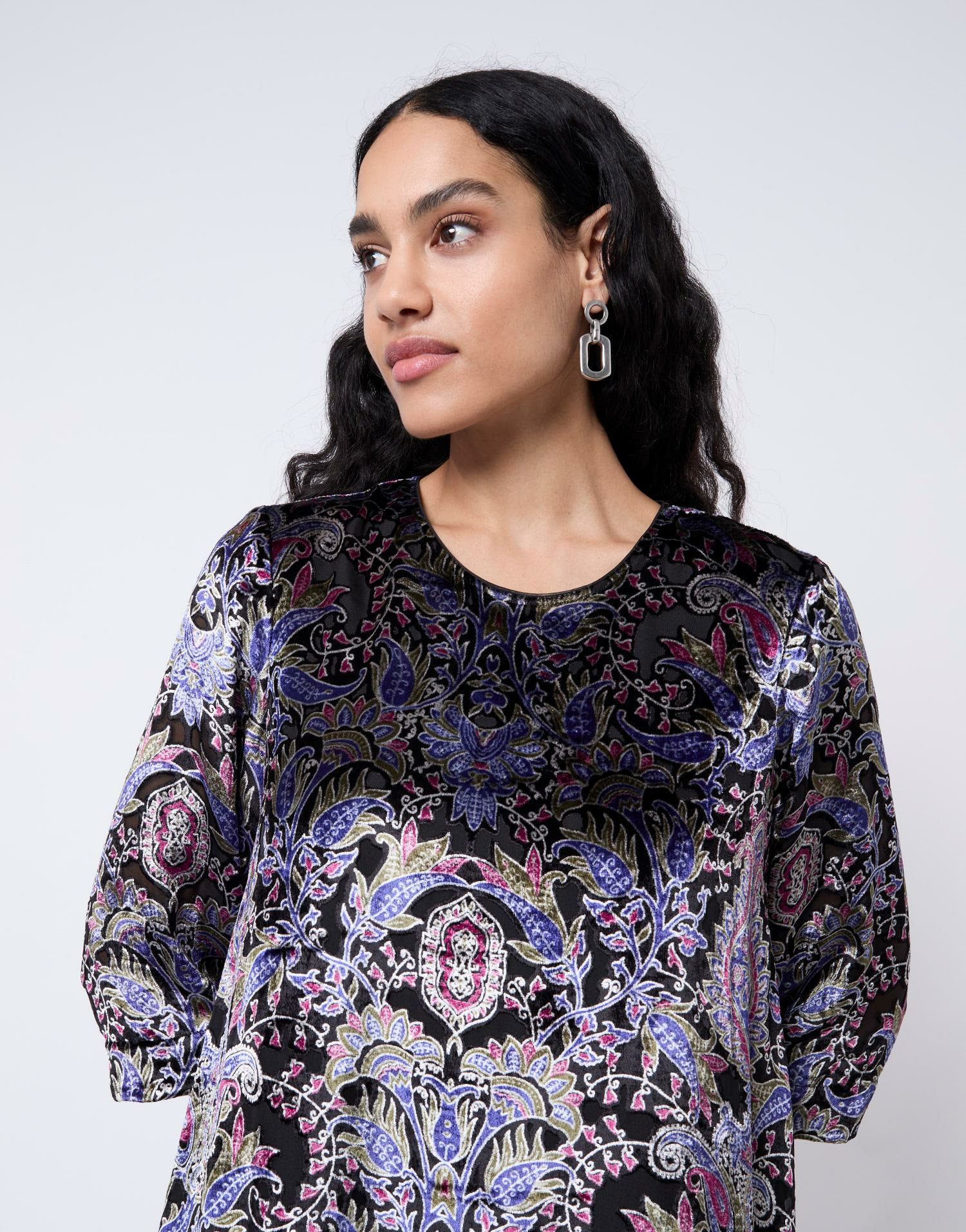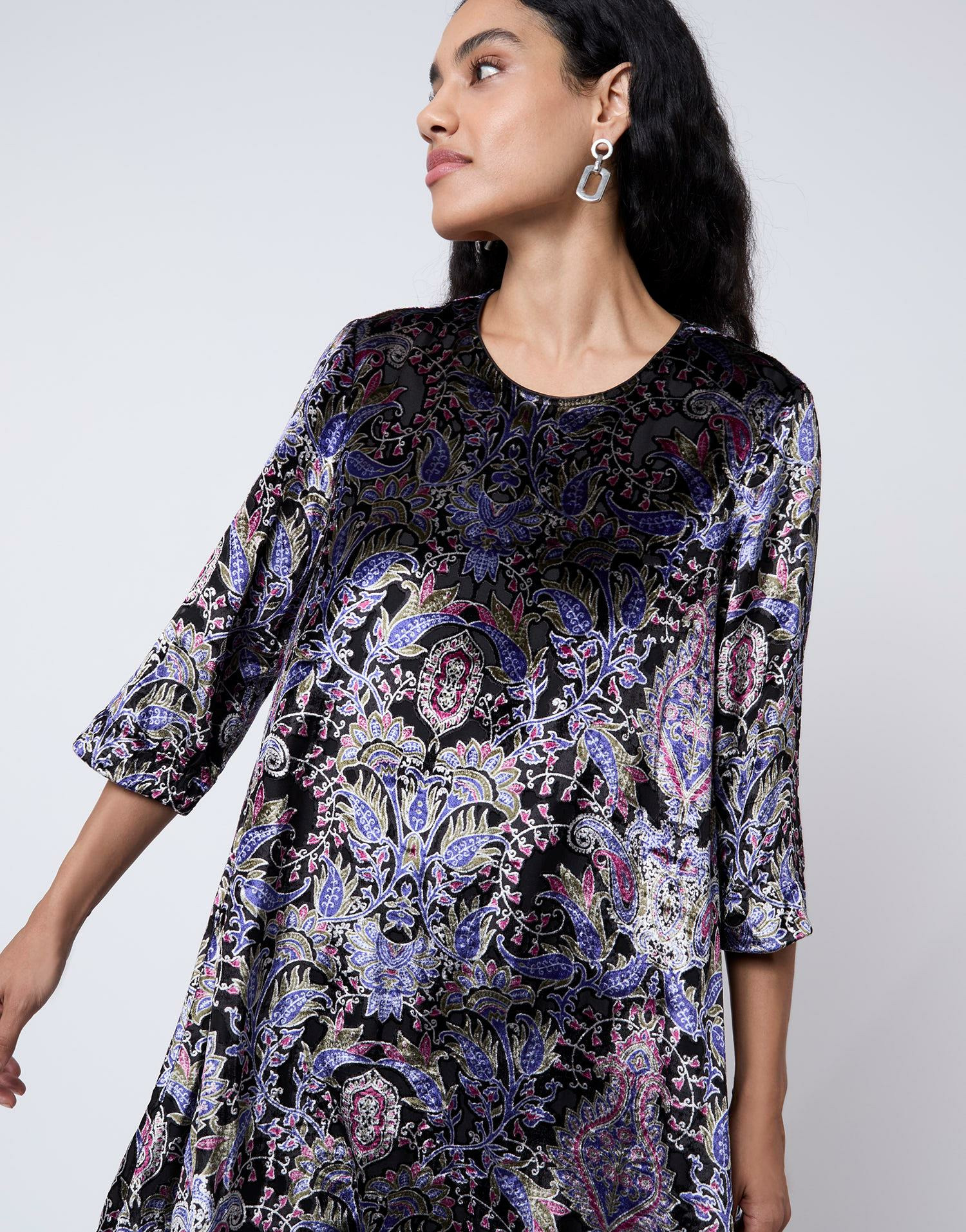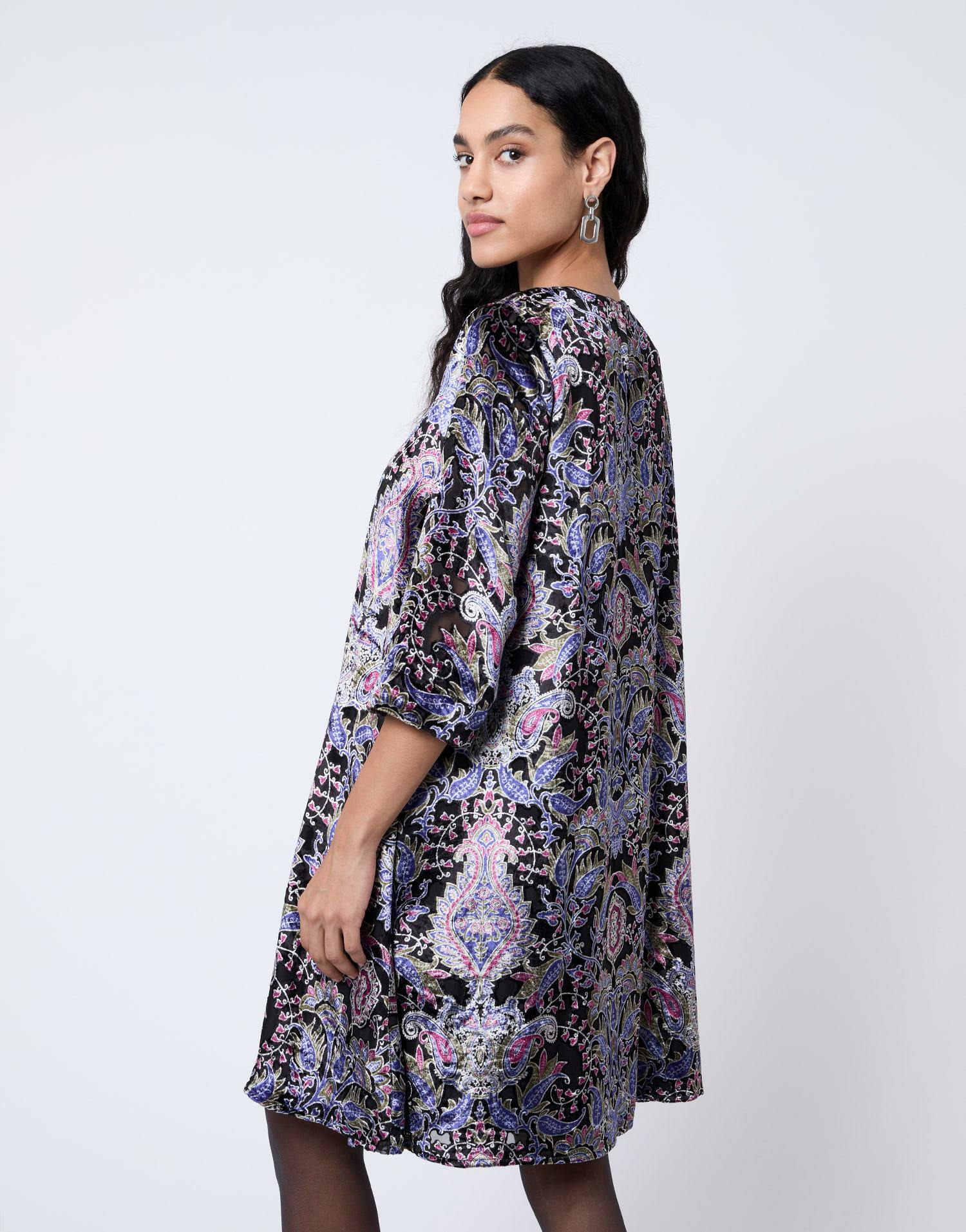 La robe courte imprimée est en velours, avec une coupe ample et une encolure arrondie. La mannequin mesure 1m75 et porte une taille 38.