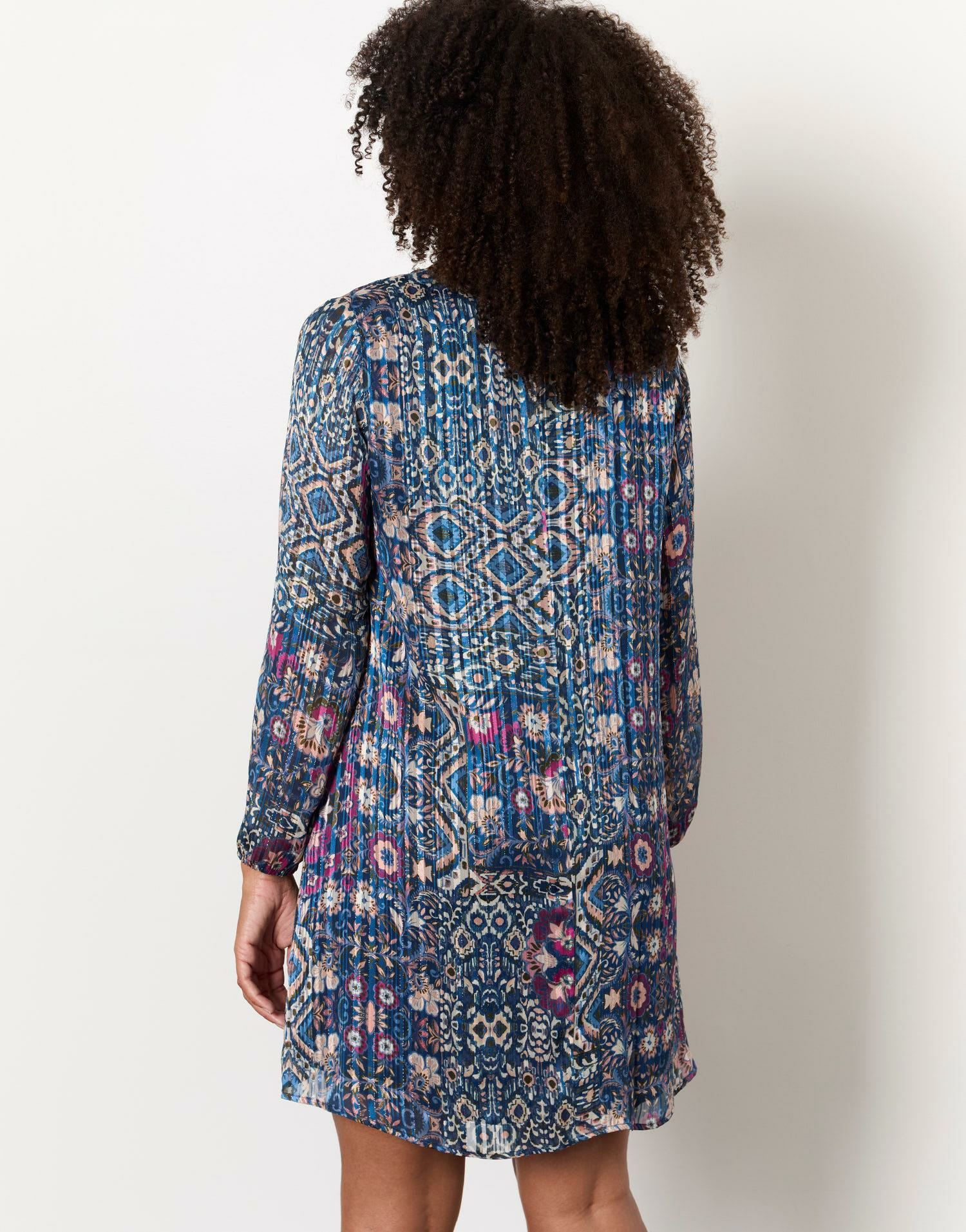 Disponible en taille 38 portée par Sophie, qui mesure 1m77, la robe courte imprimée VIOLET est conçue dans un tissu léger et agréable au toucher, facile d’entretien et résistant.