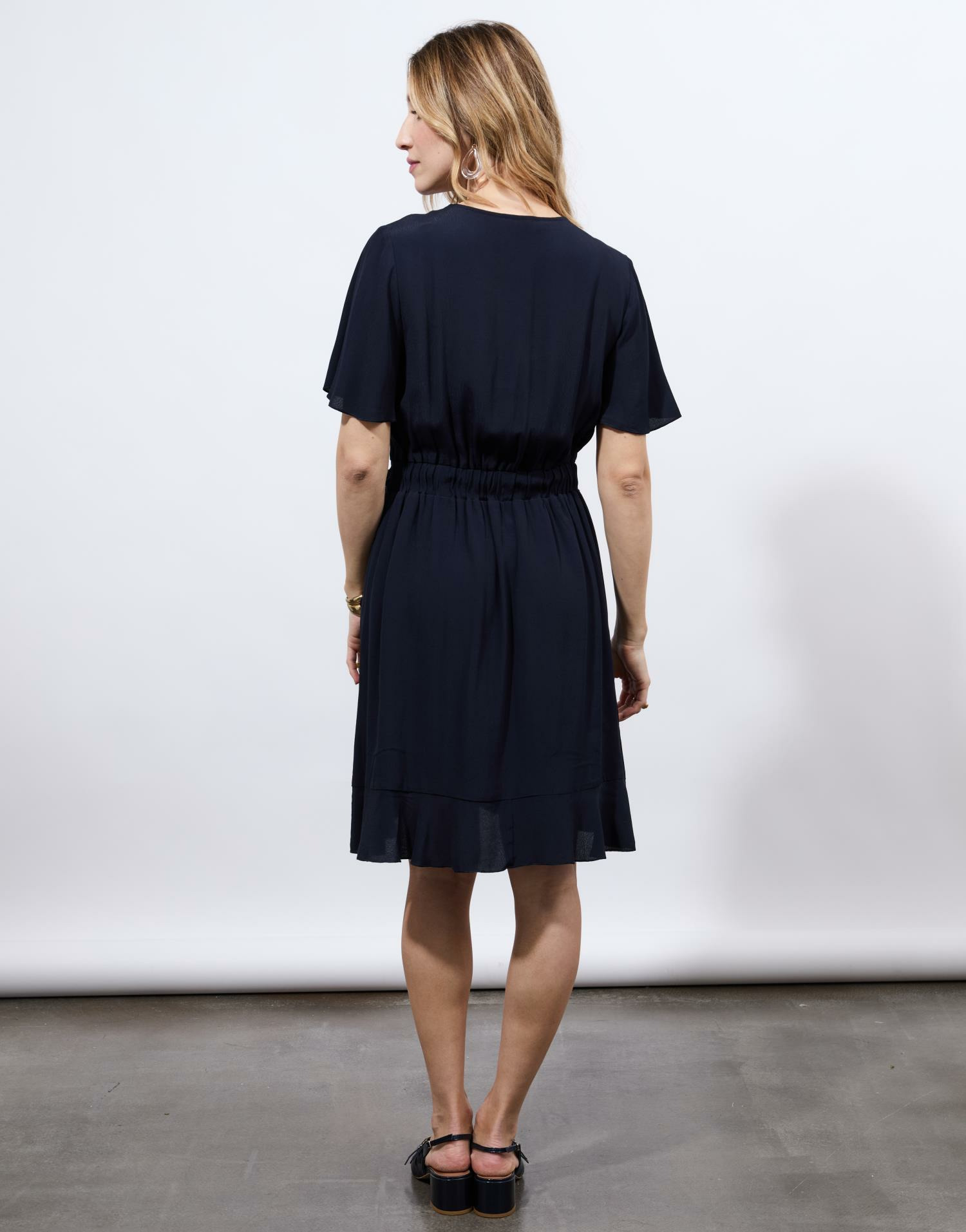Disponible en taille 38 portée par un mannequin de 1m75, la robe présente une coupe fluide avec encolure croisée, manches courtes et lien à nouer sur le côté pour ajuster la taille.