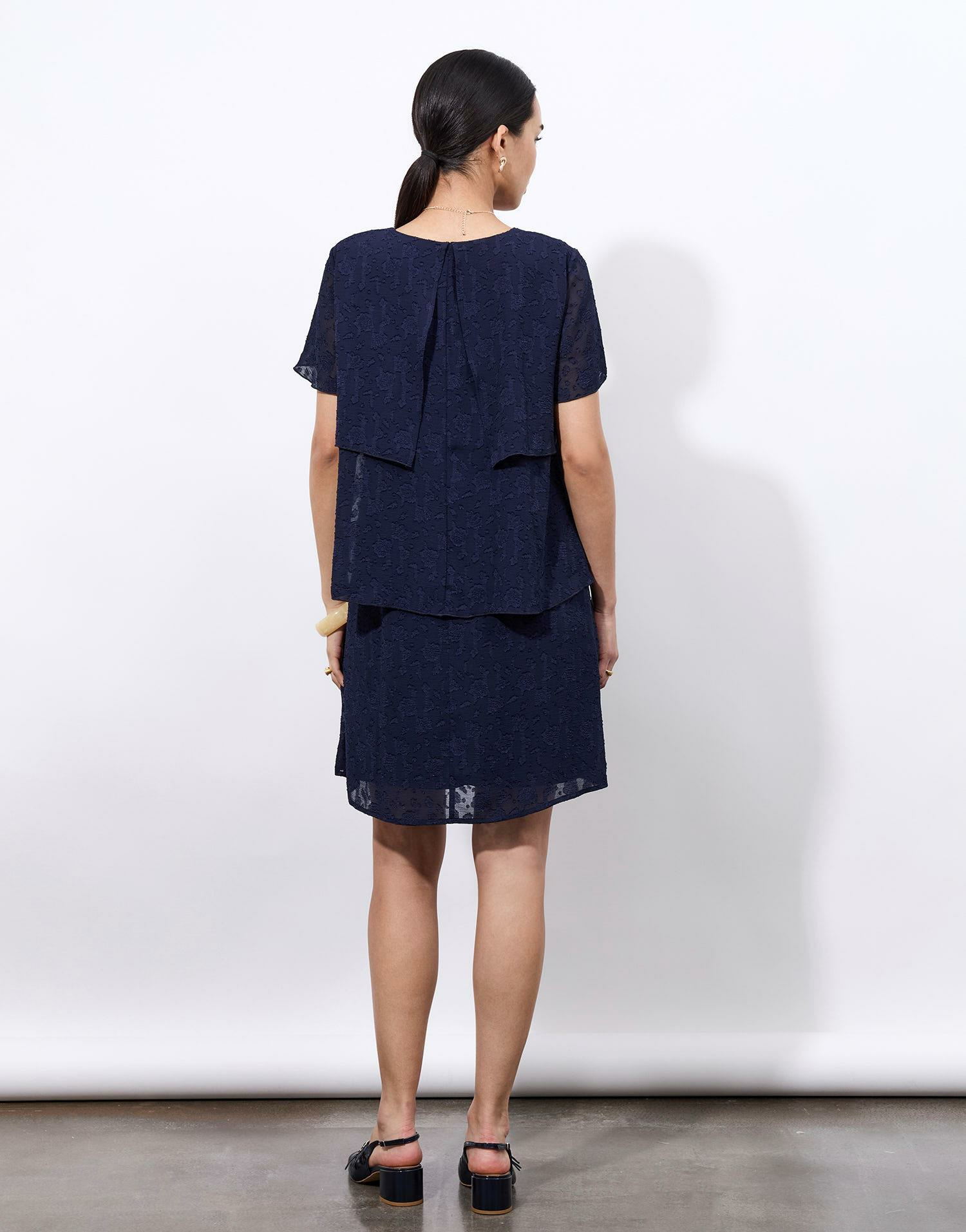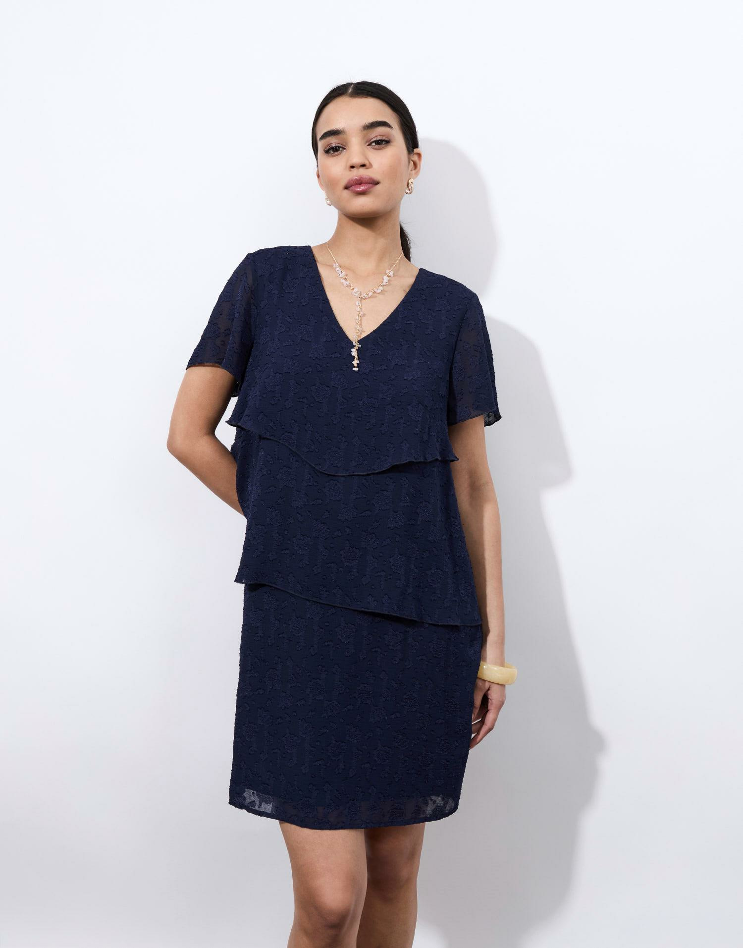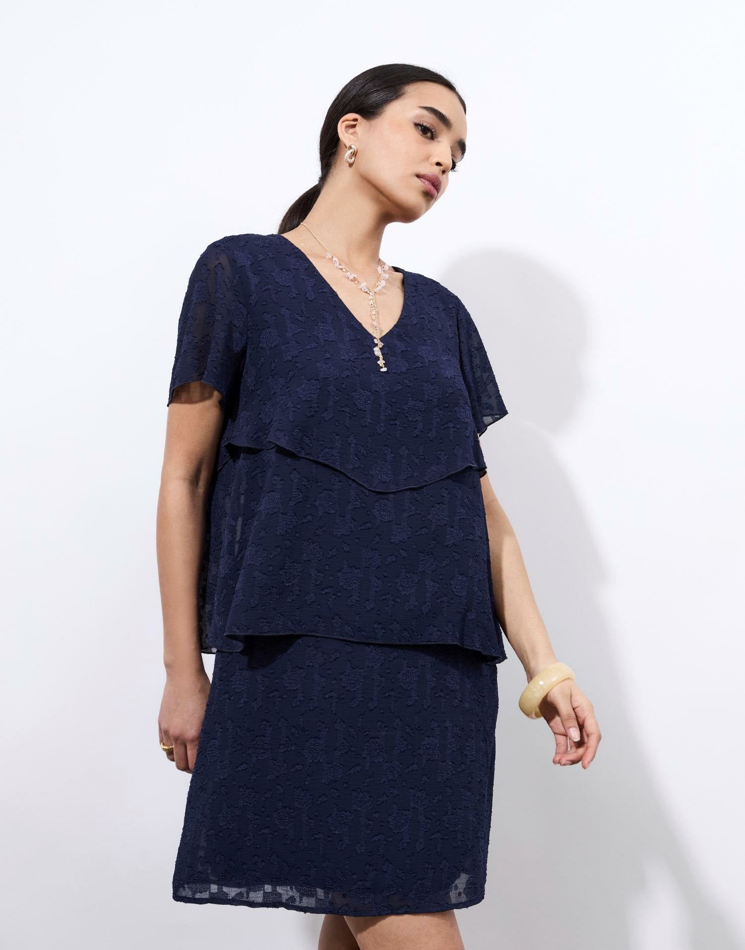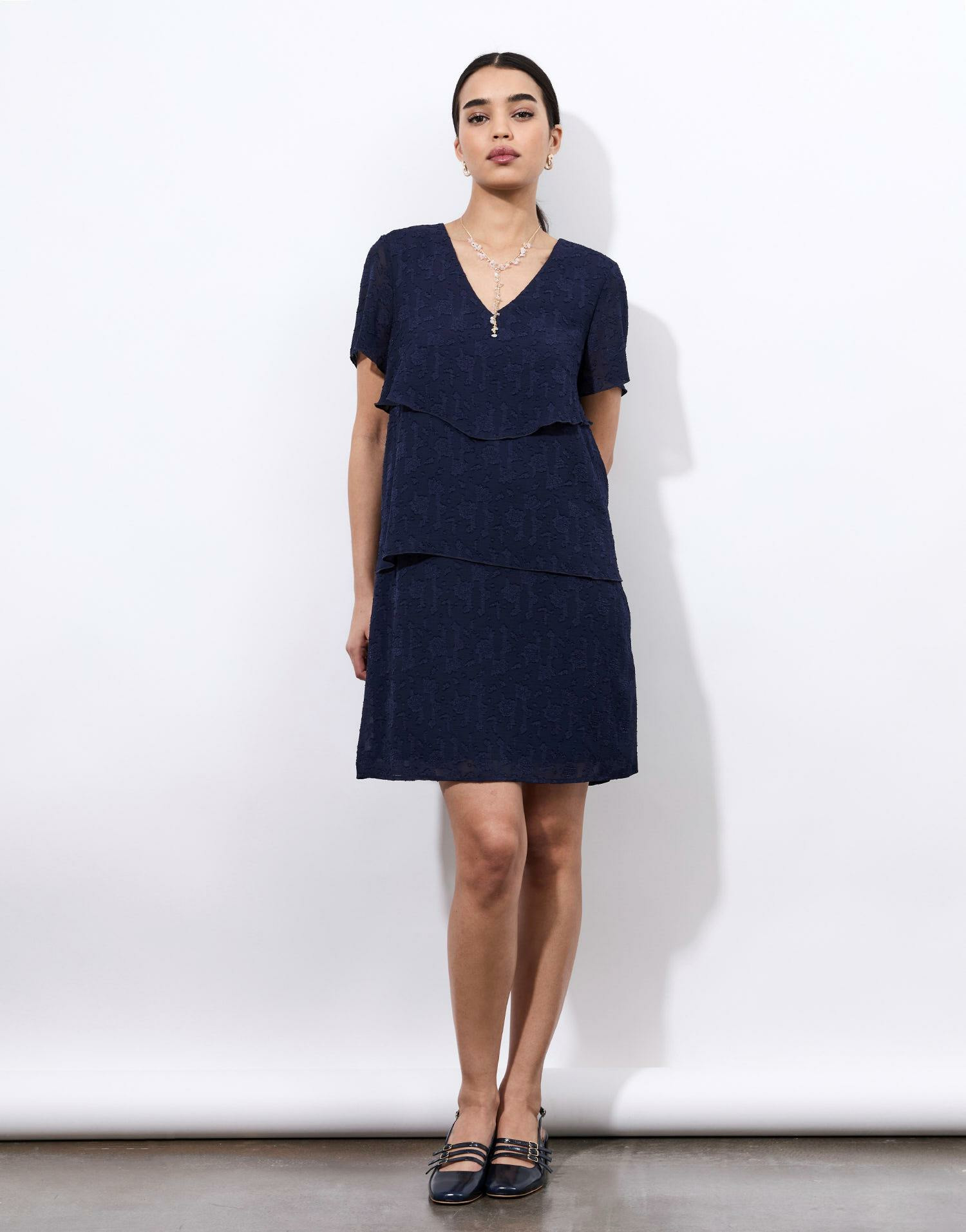 Conçue dans un tissu texturé, cette robe dévoile une coupe féminine et fluide qui épouse délicatement le corps. Son encolure en V et ses manches courtes apportent une touche de fraîcheur, tandis que les empiècements superposés créent un mouvement naturel et une silhouette raffinée. Facile à porter, elle se prête aussi bien à une journée décontractée qu’à une soirée chic.