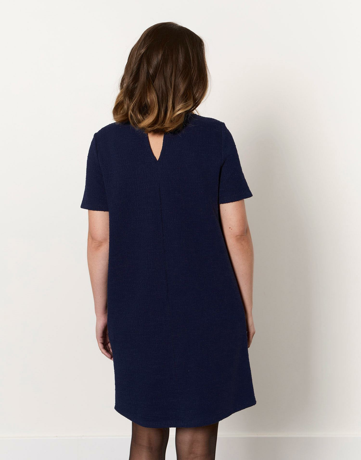 Robe courte unie marine effet tweed, encolure arrondie, manches courtes, fermeture boutonnée au dos avec boutons décoratifs. Léo mesure 1m77 et porte une taille 38.